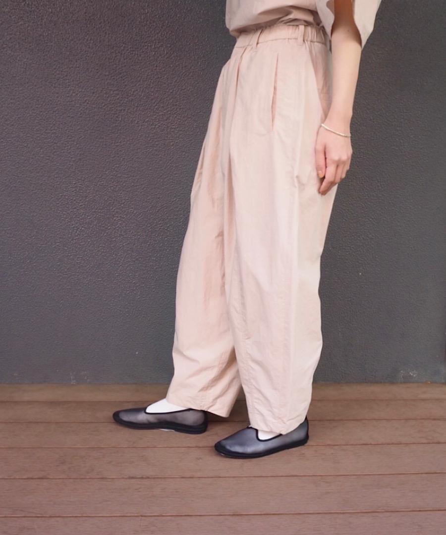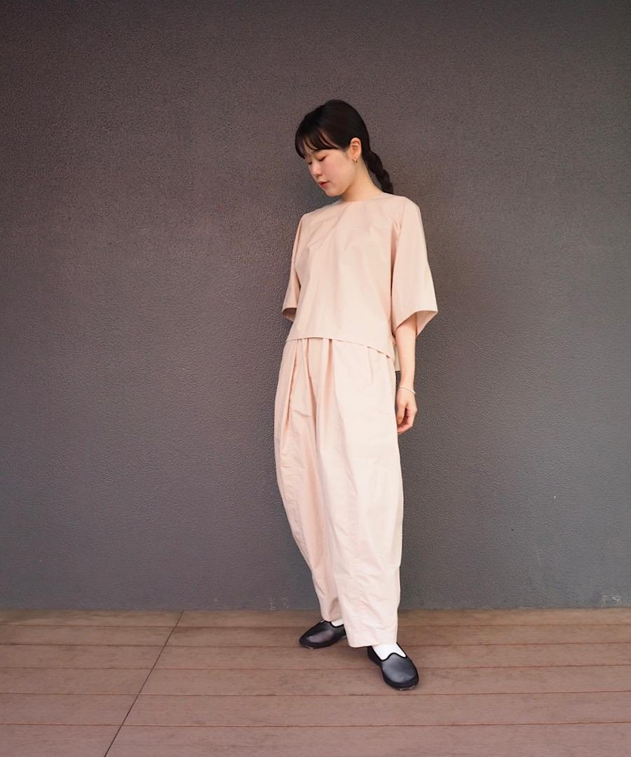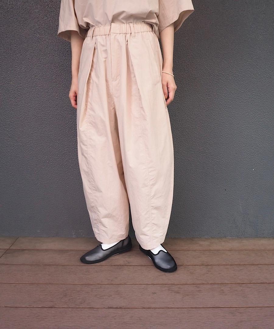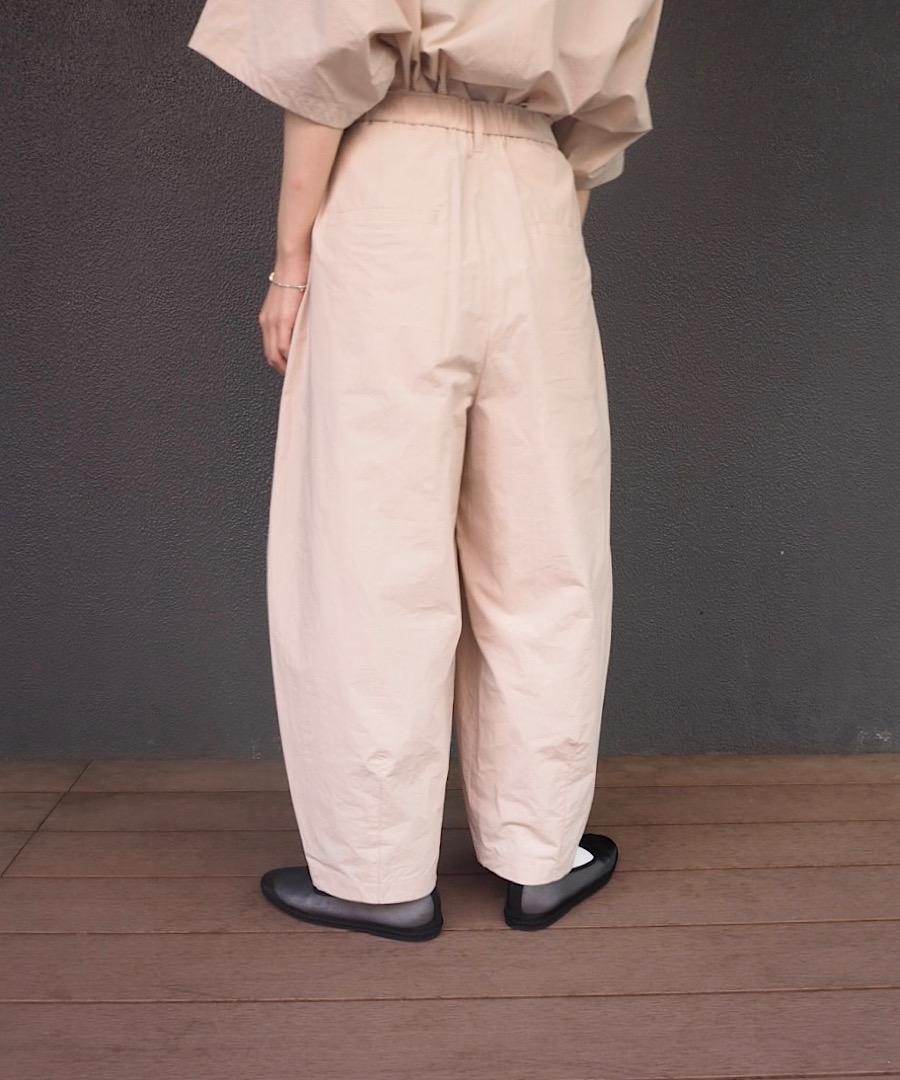 ウエストに施された大きなタックとワイドなシルエットを裾のデザインダーツや切替線で調整し、ぽわんとした丸みのあるシルエットを作り出しています。