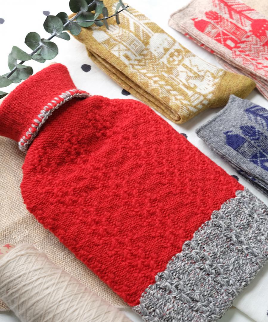 こぶりなサイズが持ち運びにも便利な湯たんぽは、天然ゴム製で、meri ja kuuの湯たんぽカバーがセットされています。ざっくりとした編地はレッドとグレーを配色にし、リブは太目のステッチでアクセントをつけています。