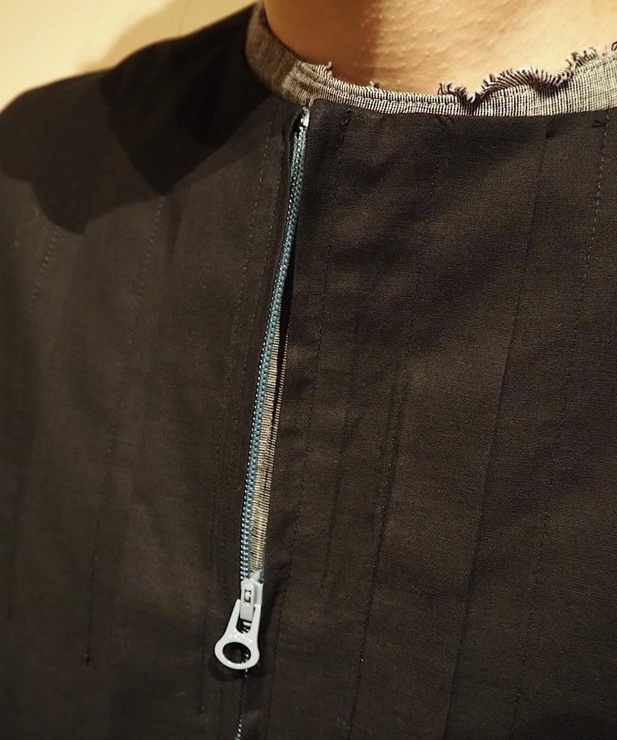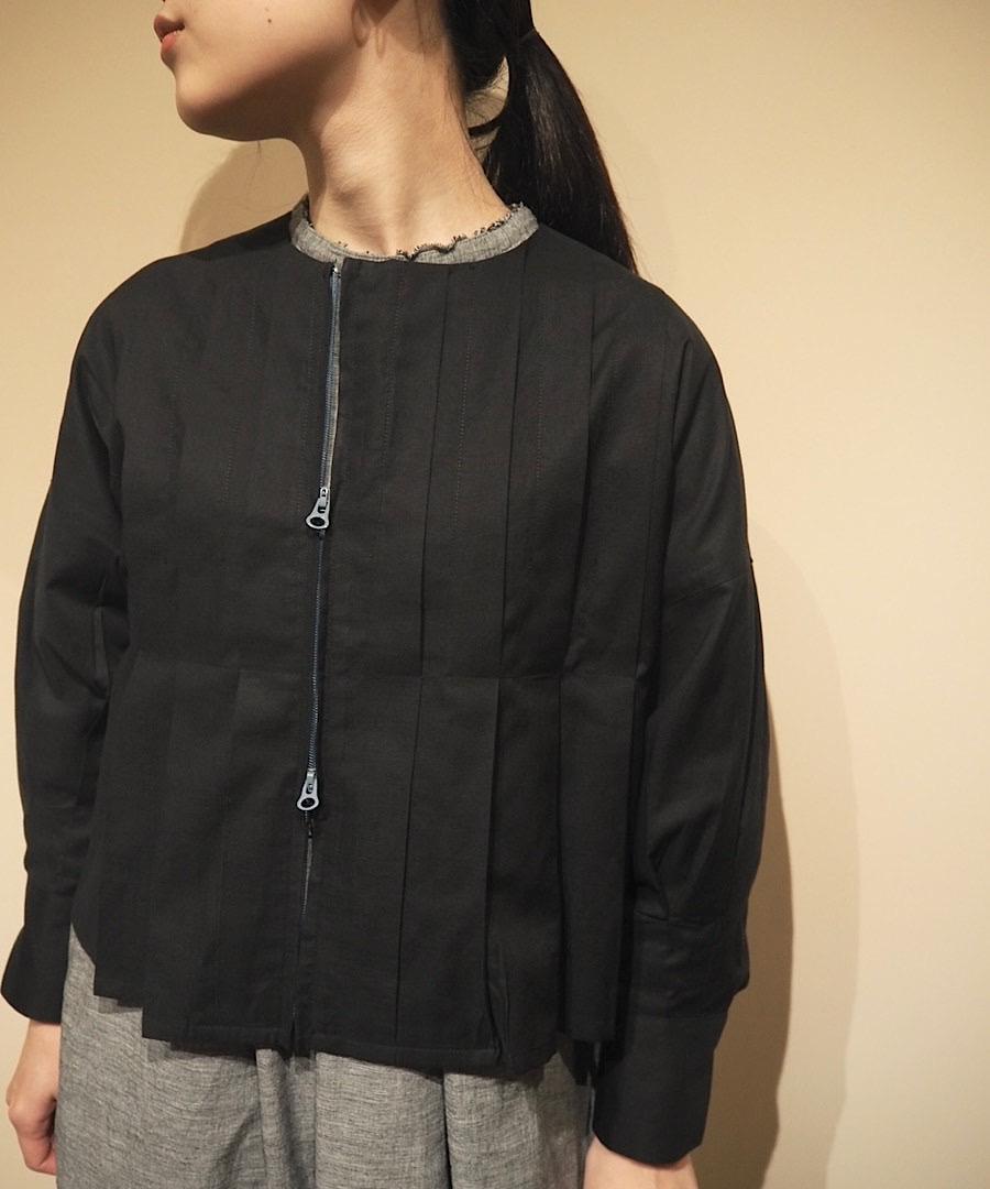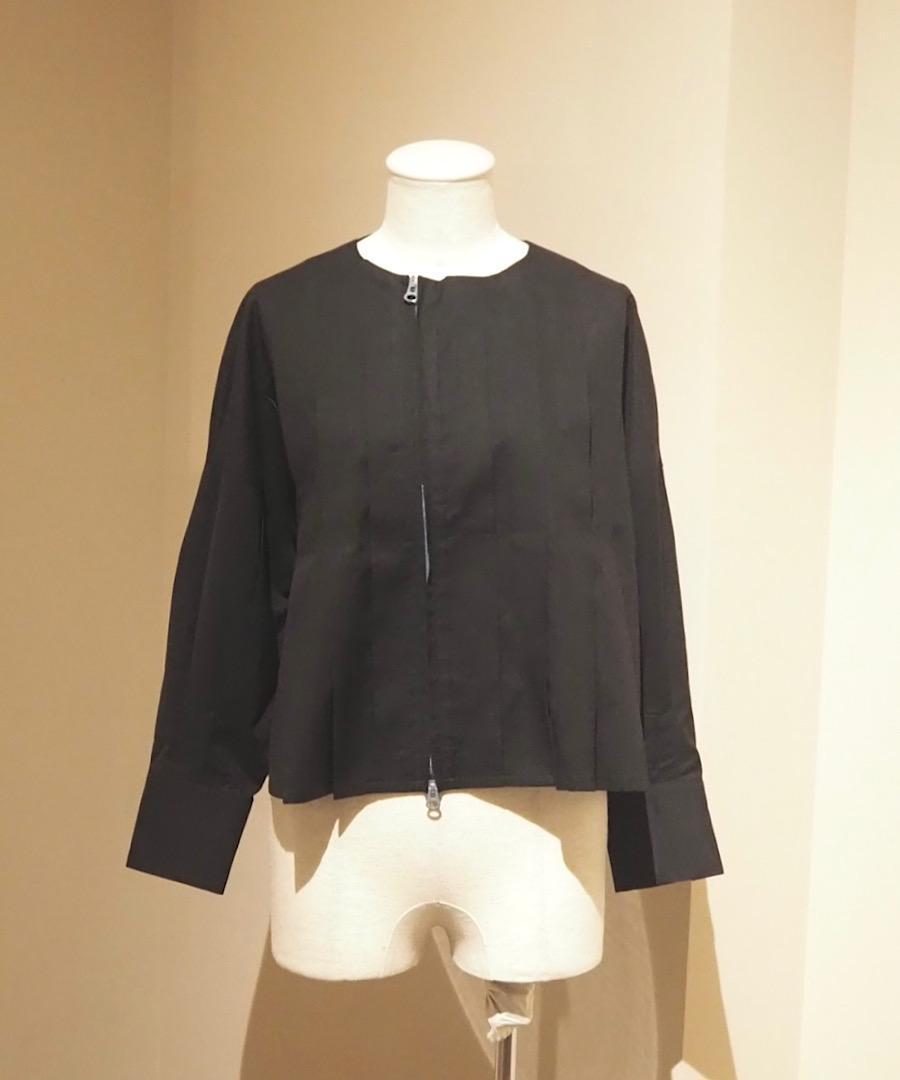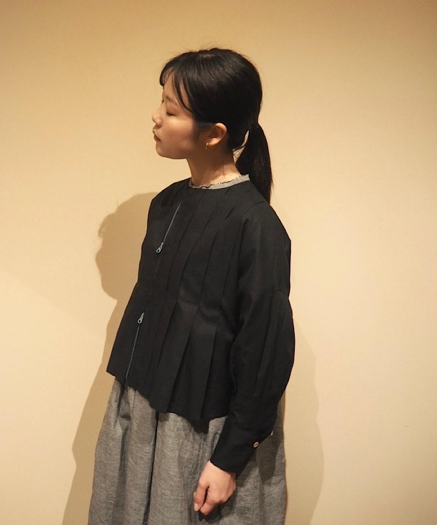 フロントはプリーツとアシンメトリーなジップのデザインで、かっちりし過ぎず合わせるアイテムによってきれい目にもカジュアルにも着こなせる1着です。