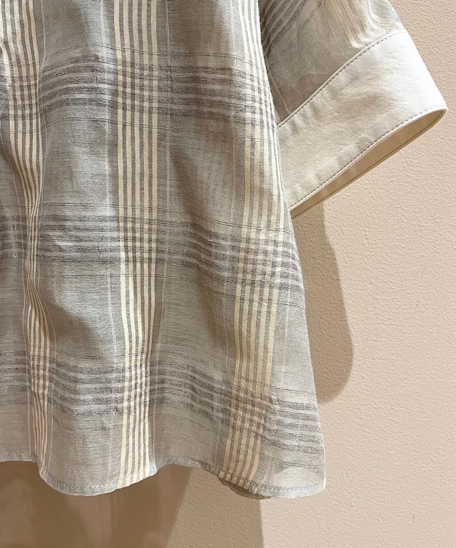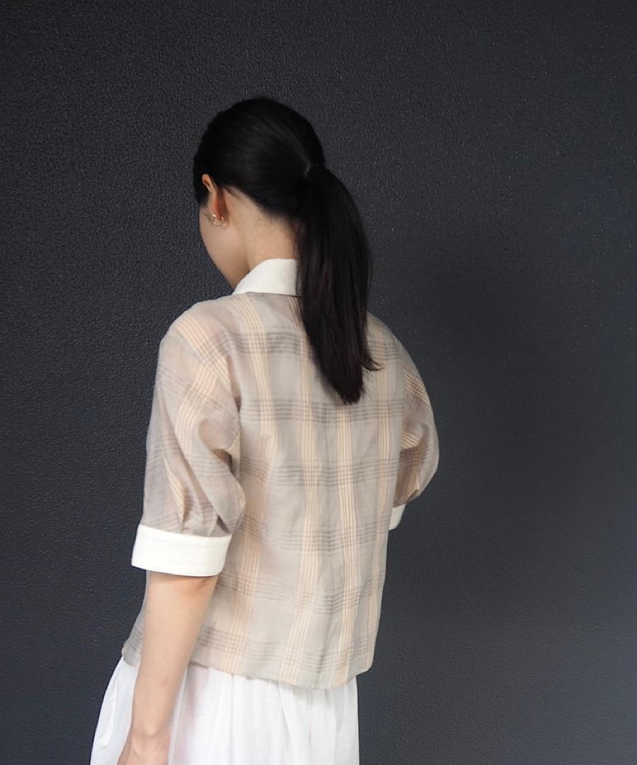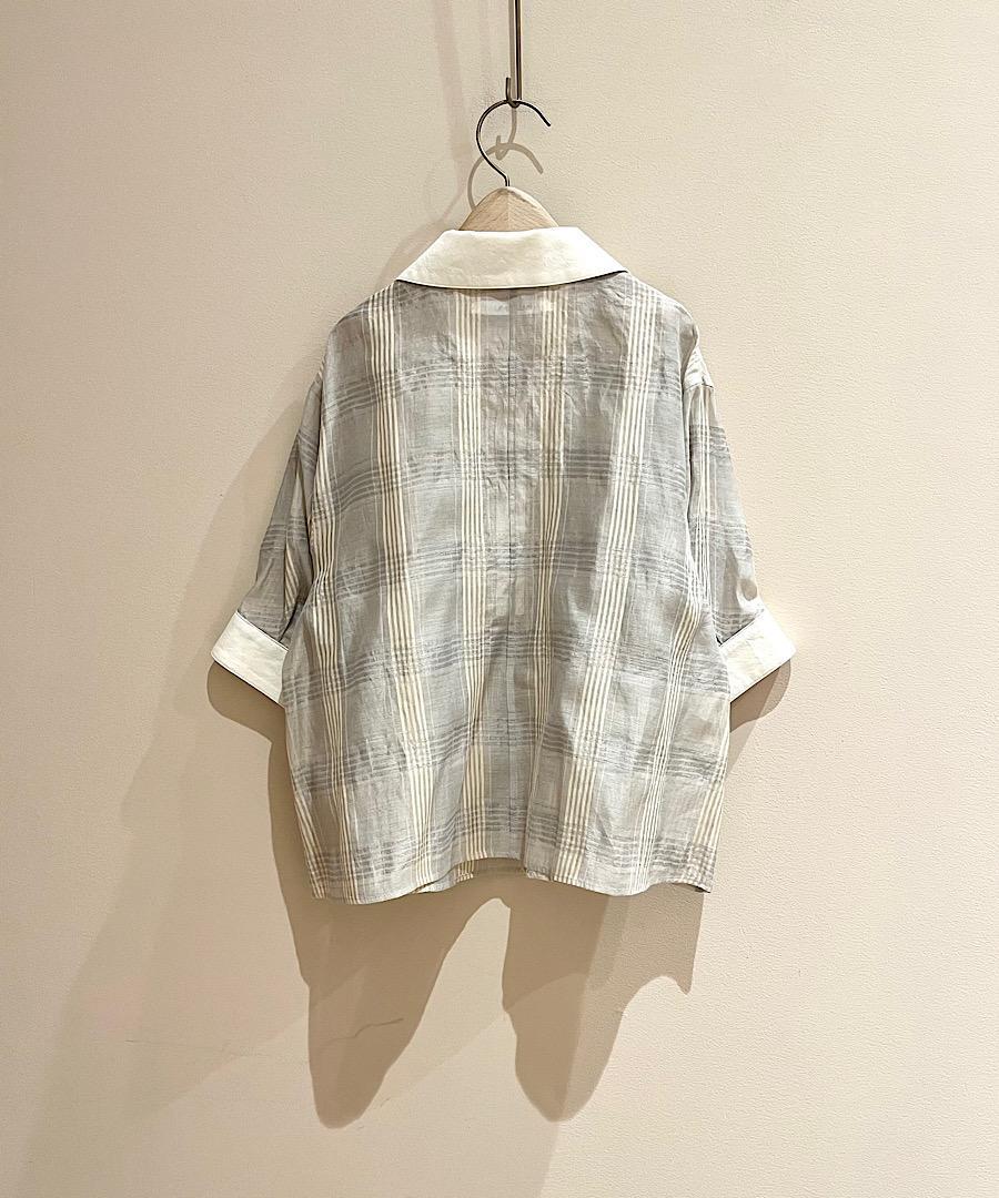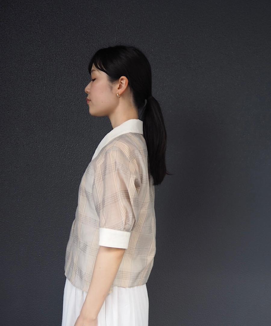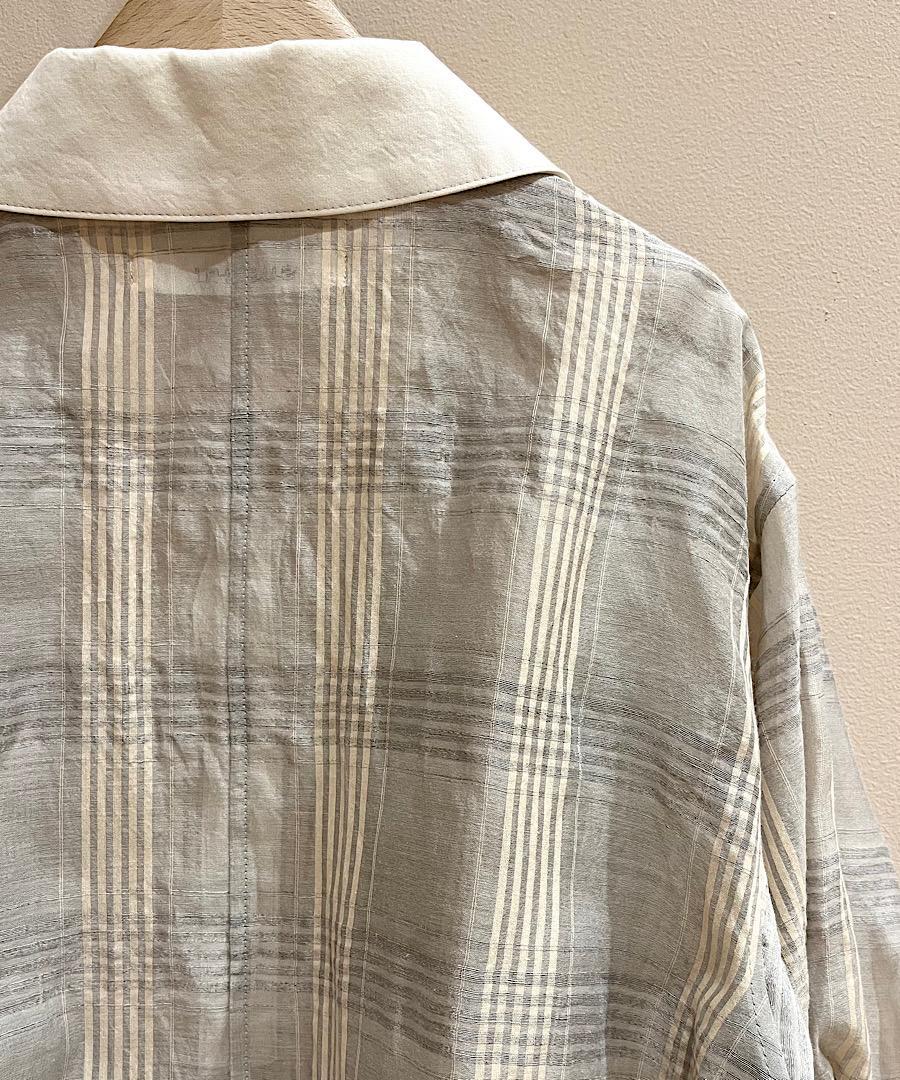 バランスに変化を持たせて、やや誇張した襟とやや短くしたボックスの身頃を組み合わせたアイテムです。