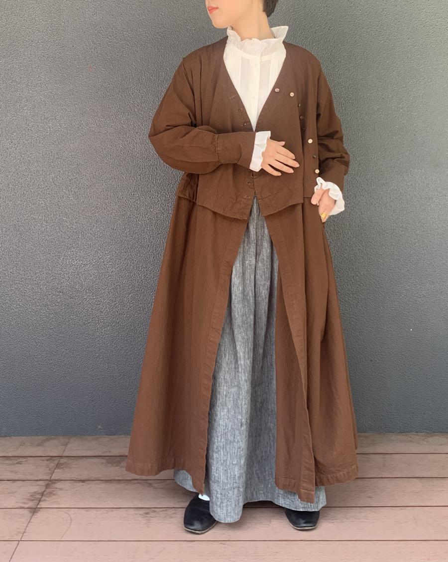 前を開けて羽織としても使用できるため、色々な着まわしを楽しんでいただけると思います。