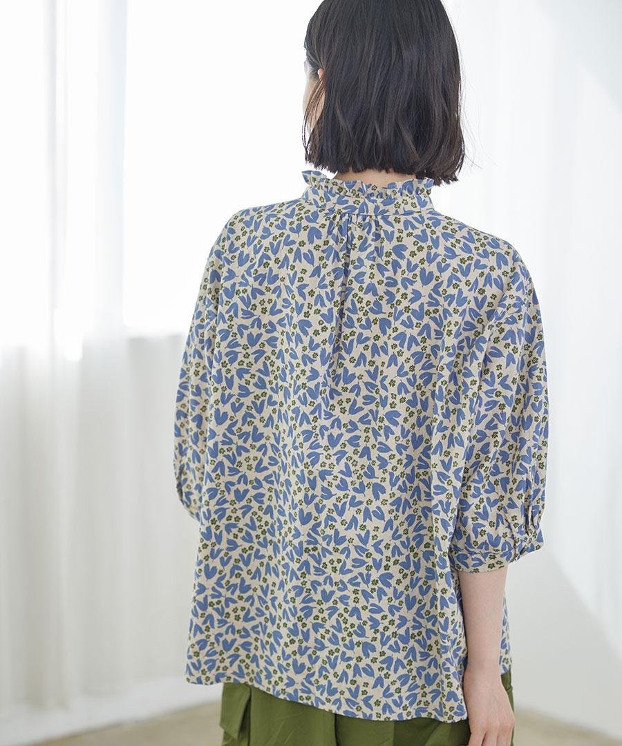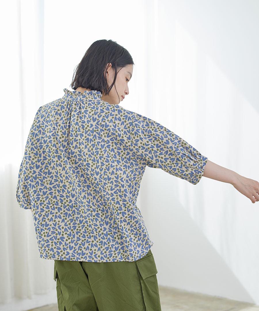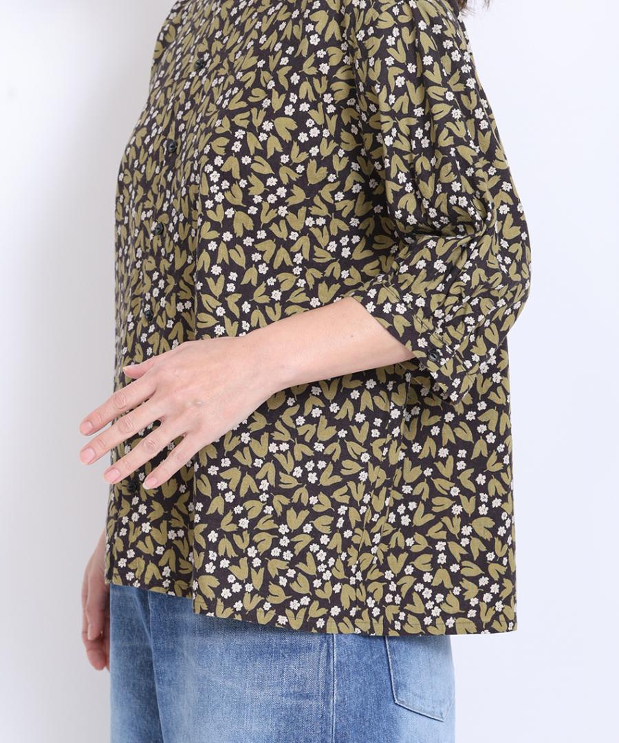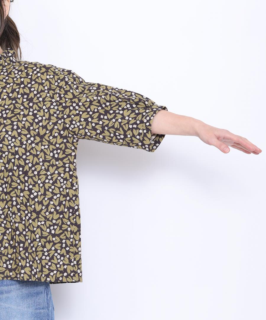 フラワープリントされた生地で仕立てた6分袖のブラウスです。