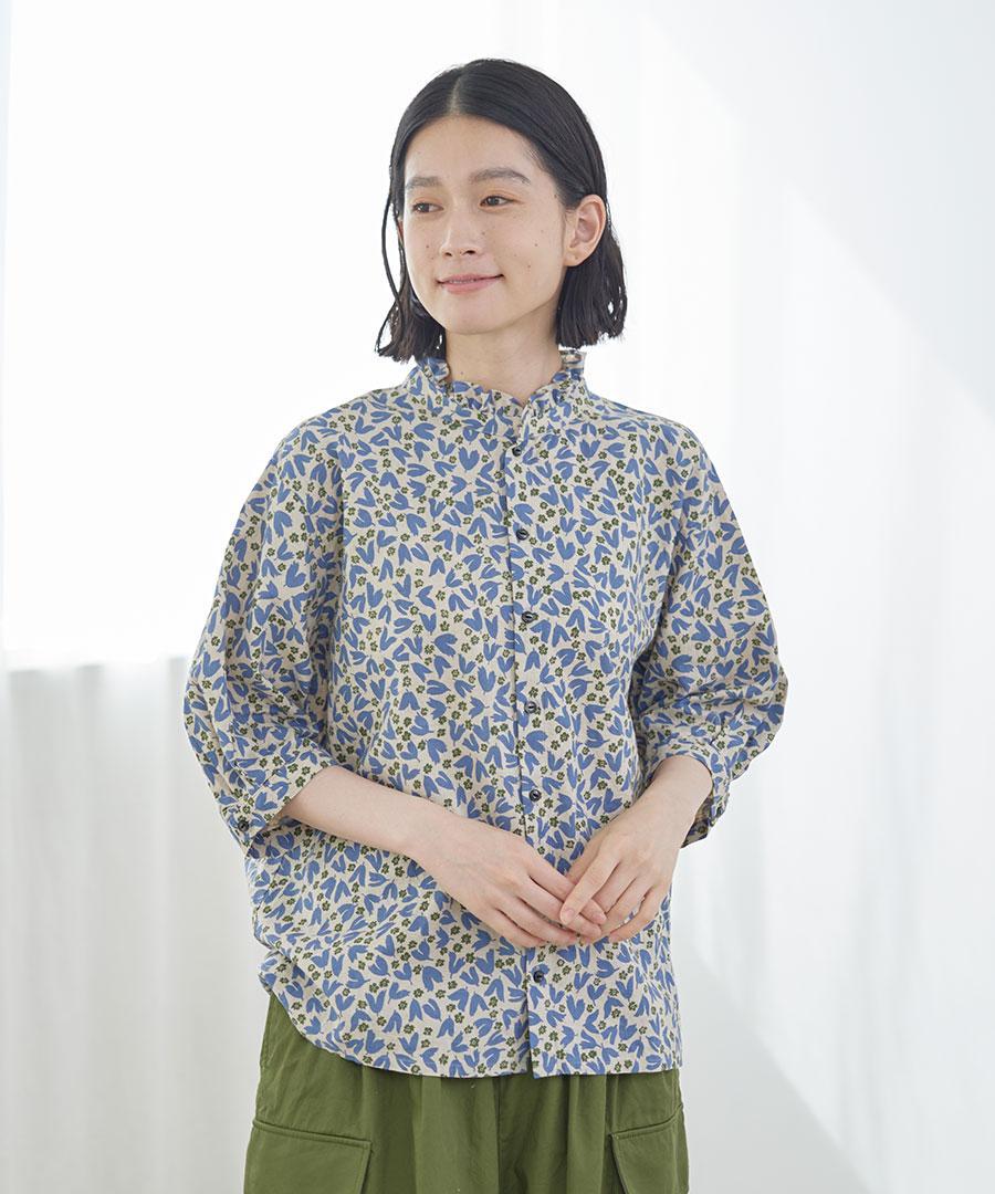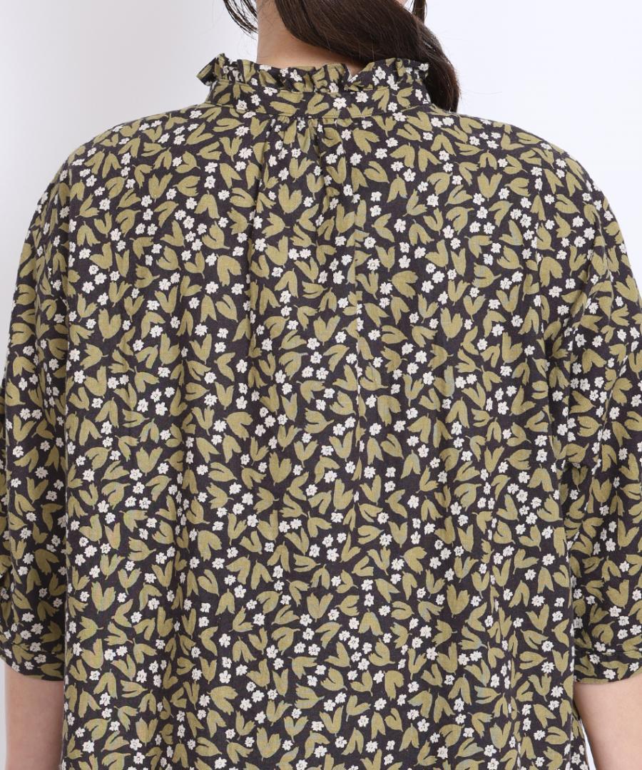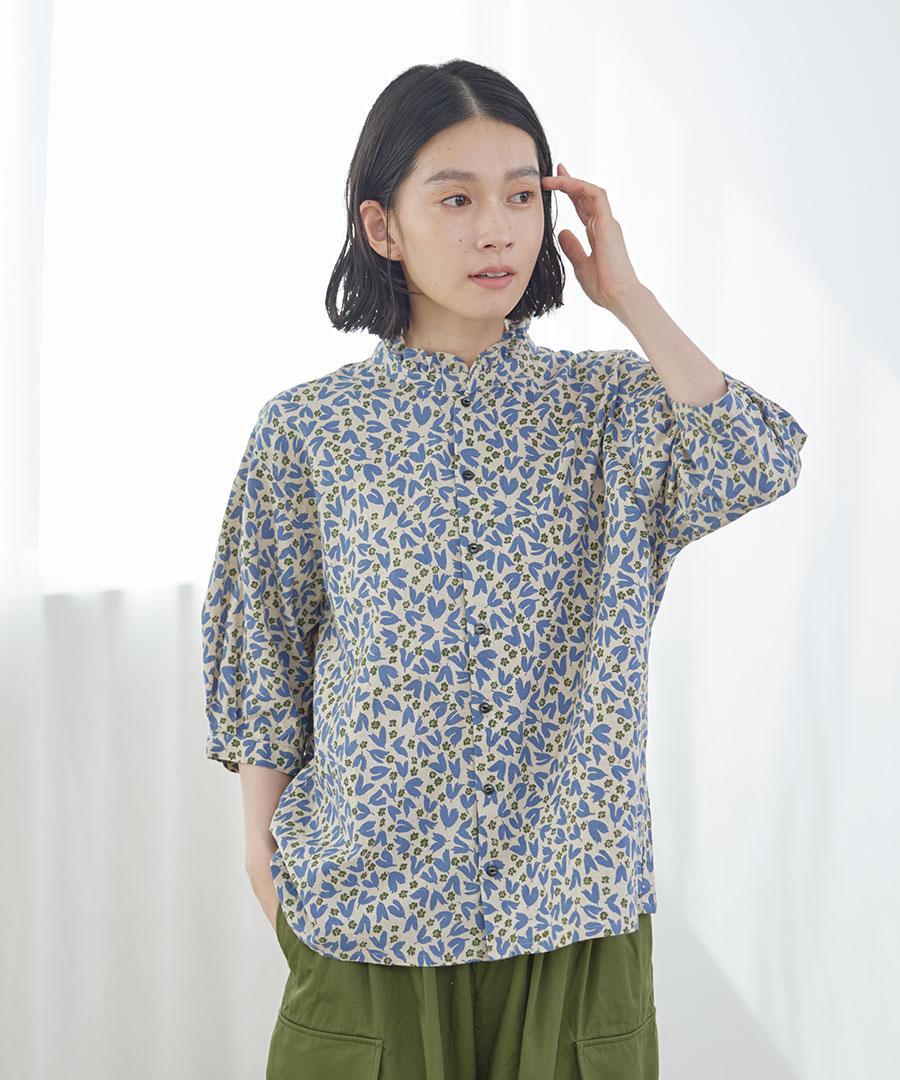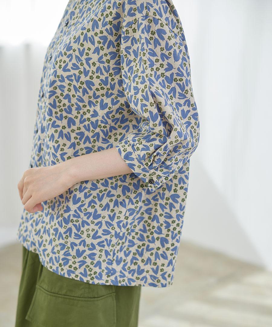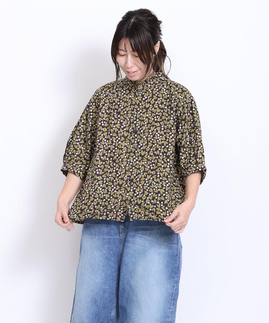 フラワープリントされた生地で仕立てた6分袖のブラウスです。
