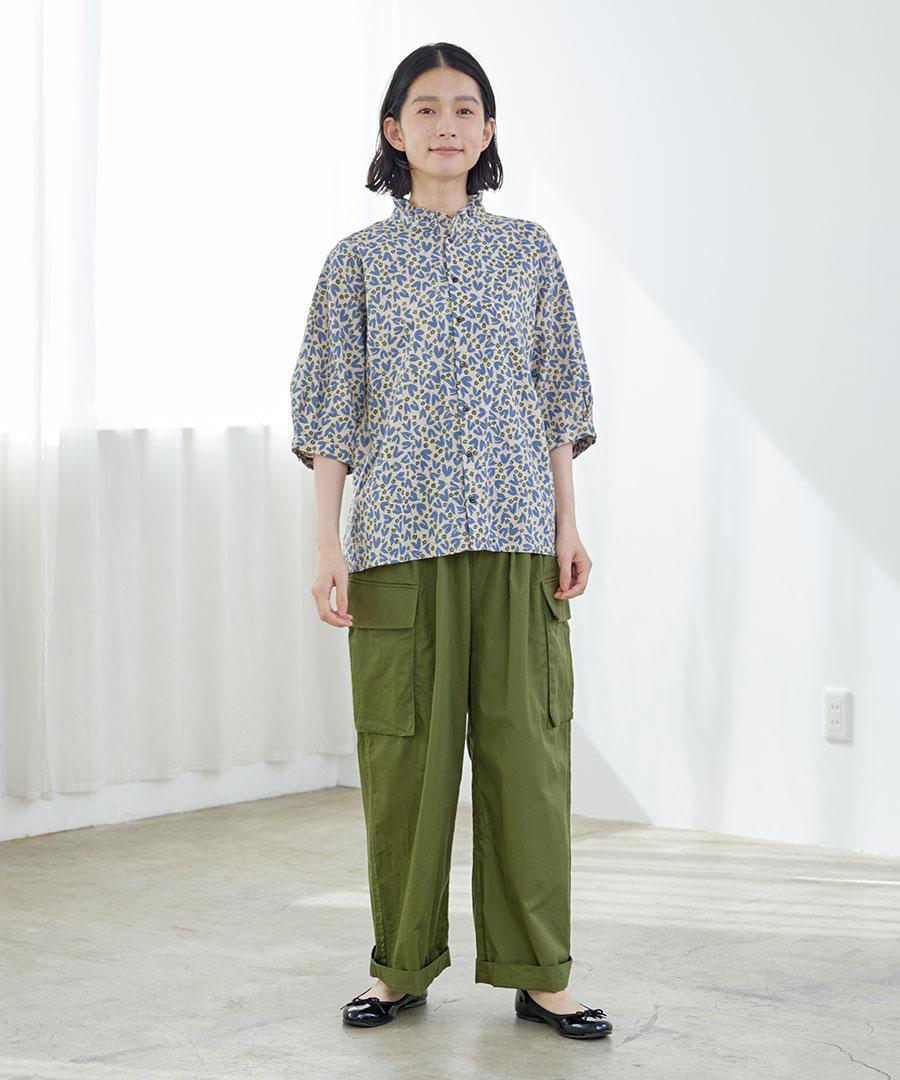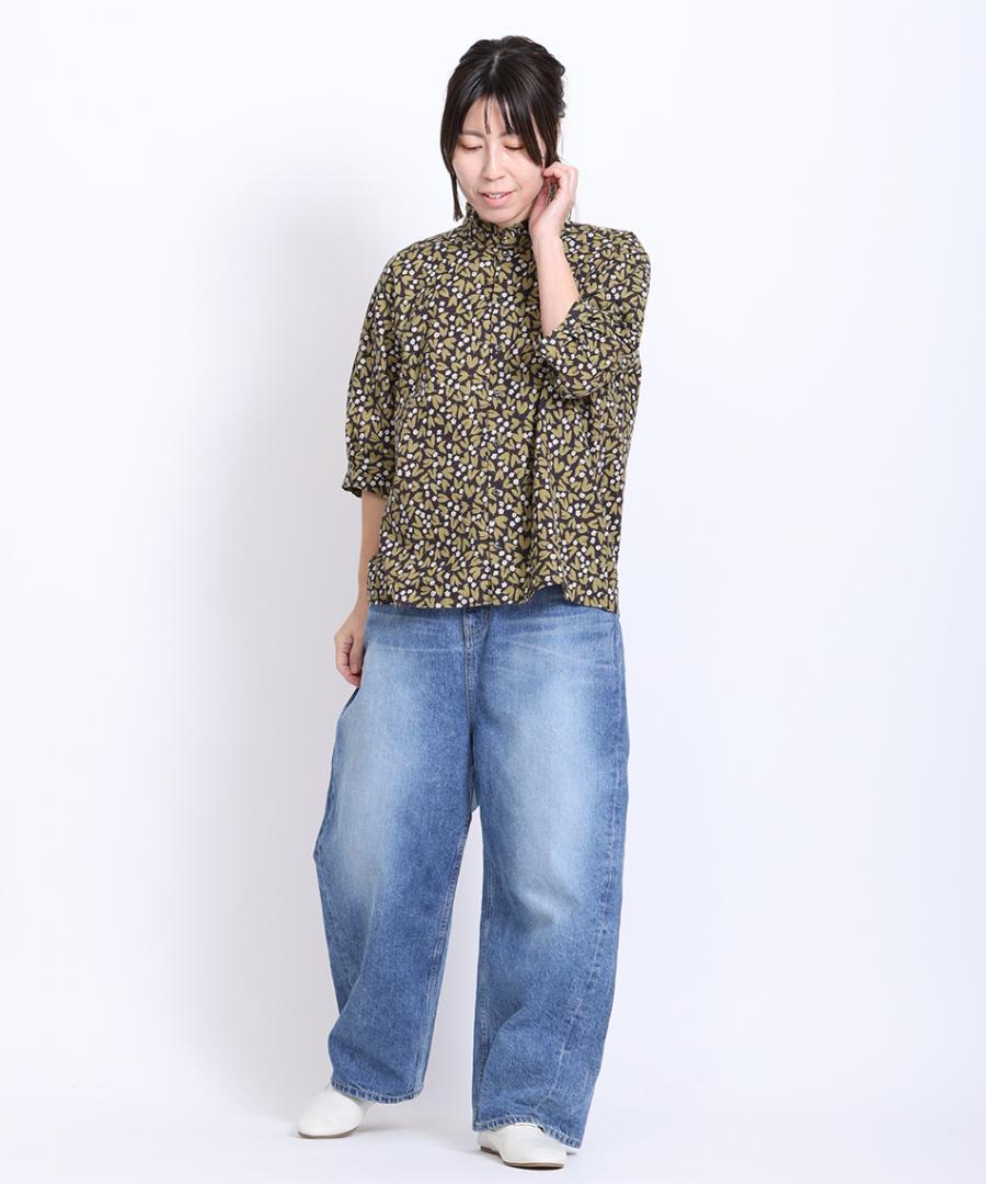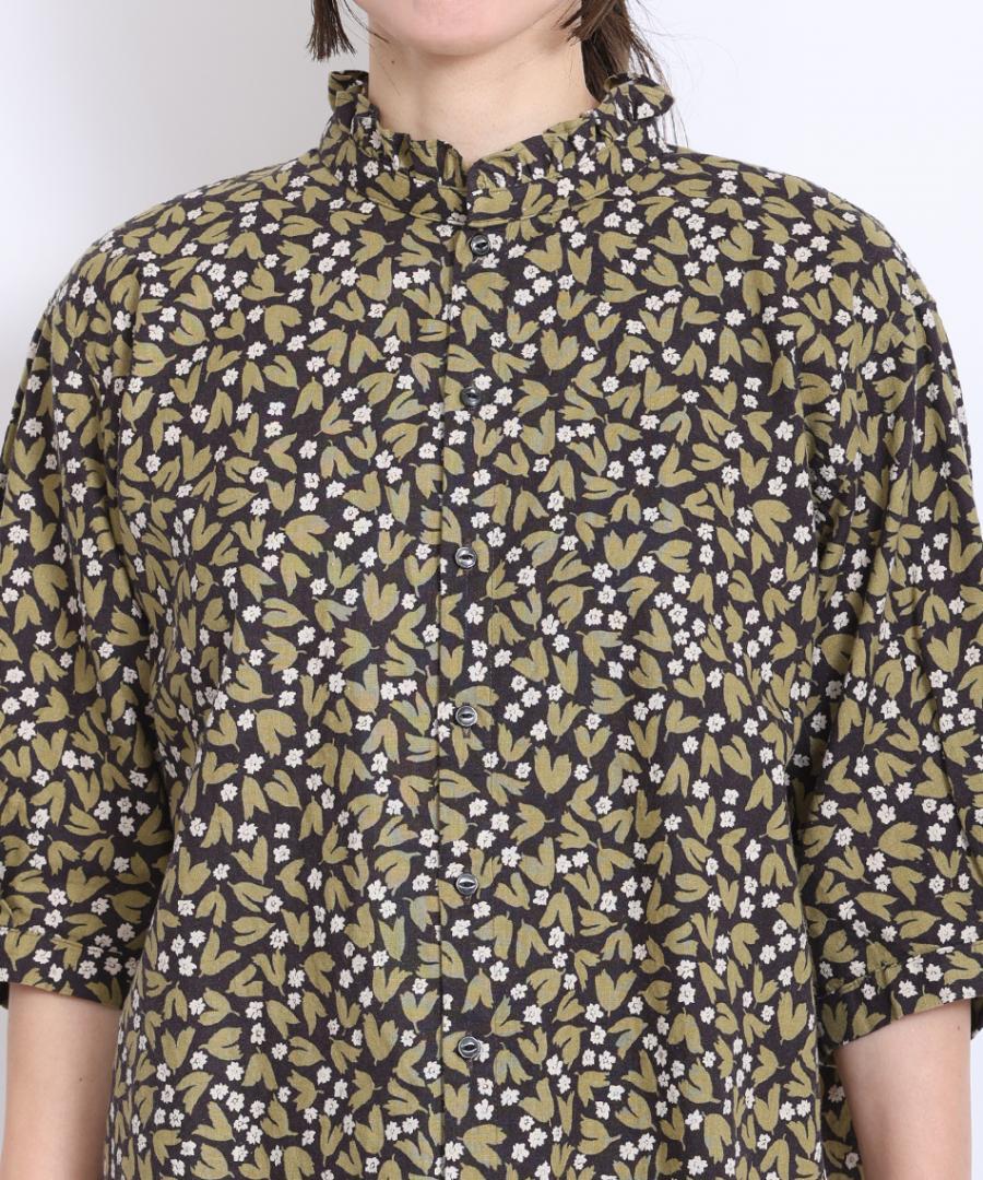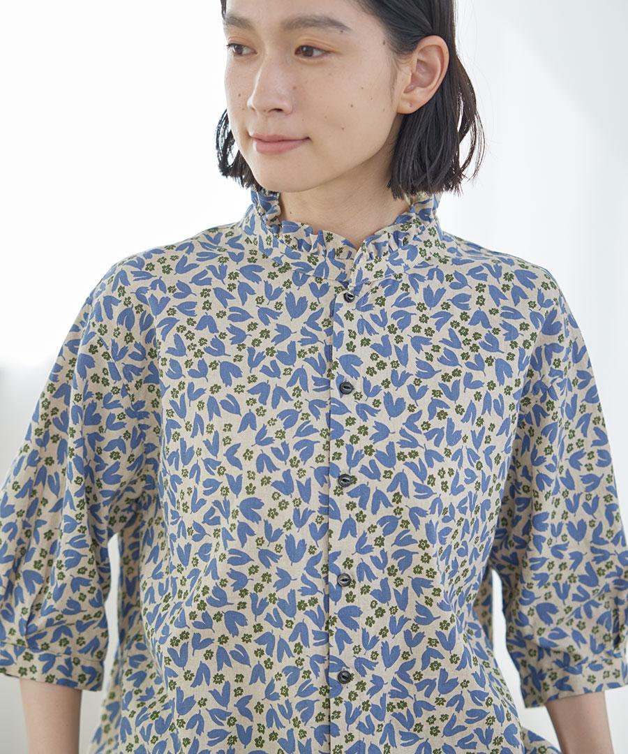 フラワープリントされた生地で仕立てた6分袖のブラウスです。