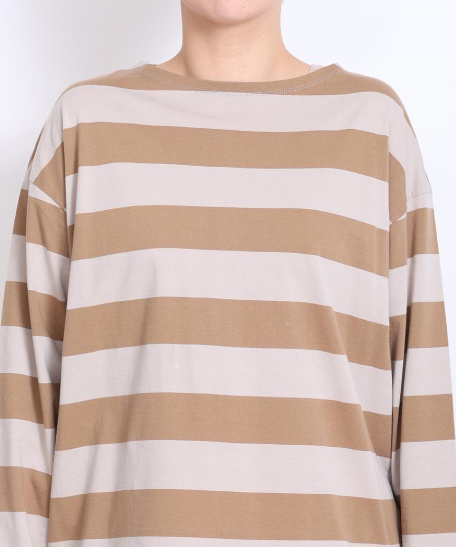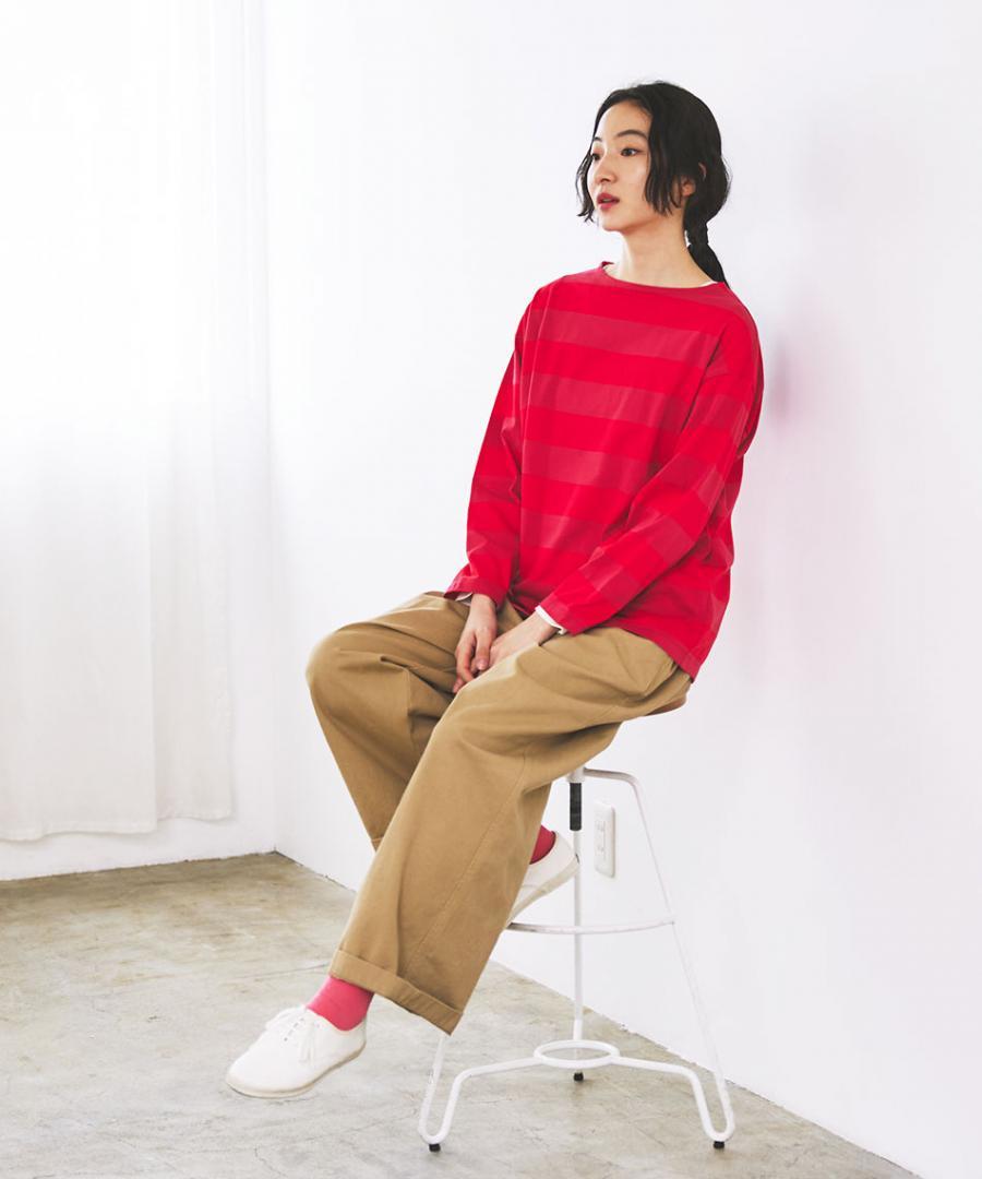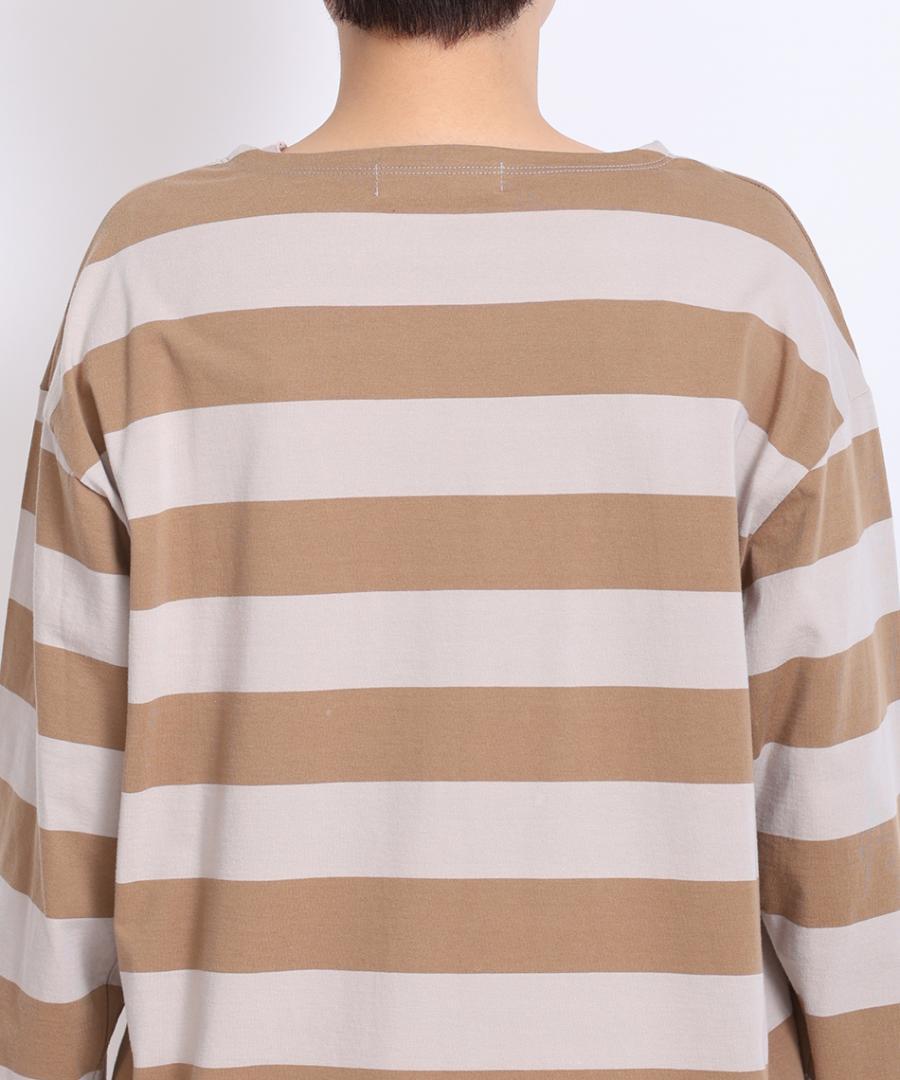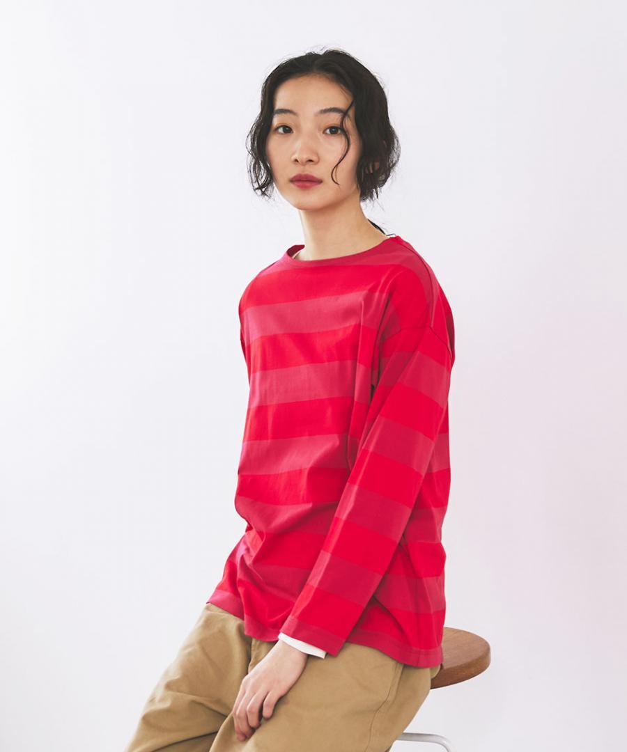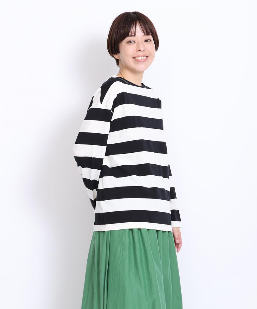 襟元はボートネック、ボーダー柄がカジュアルな印象です。