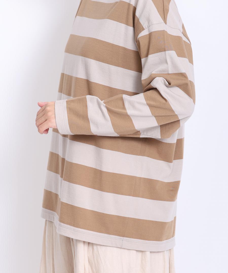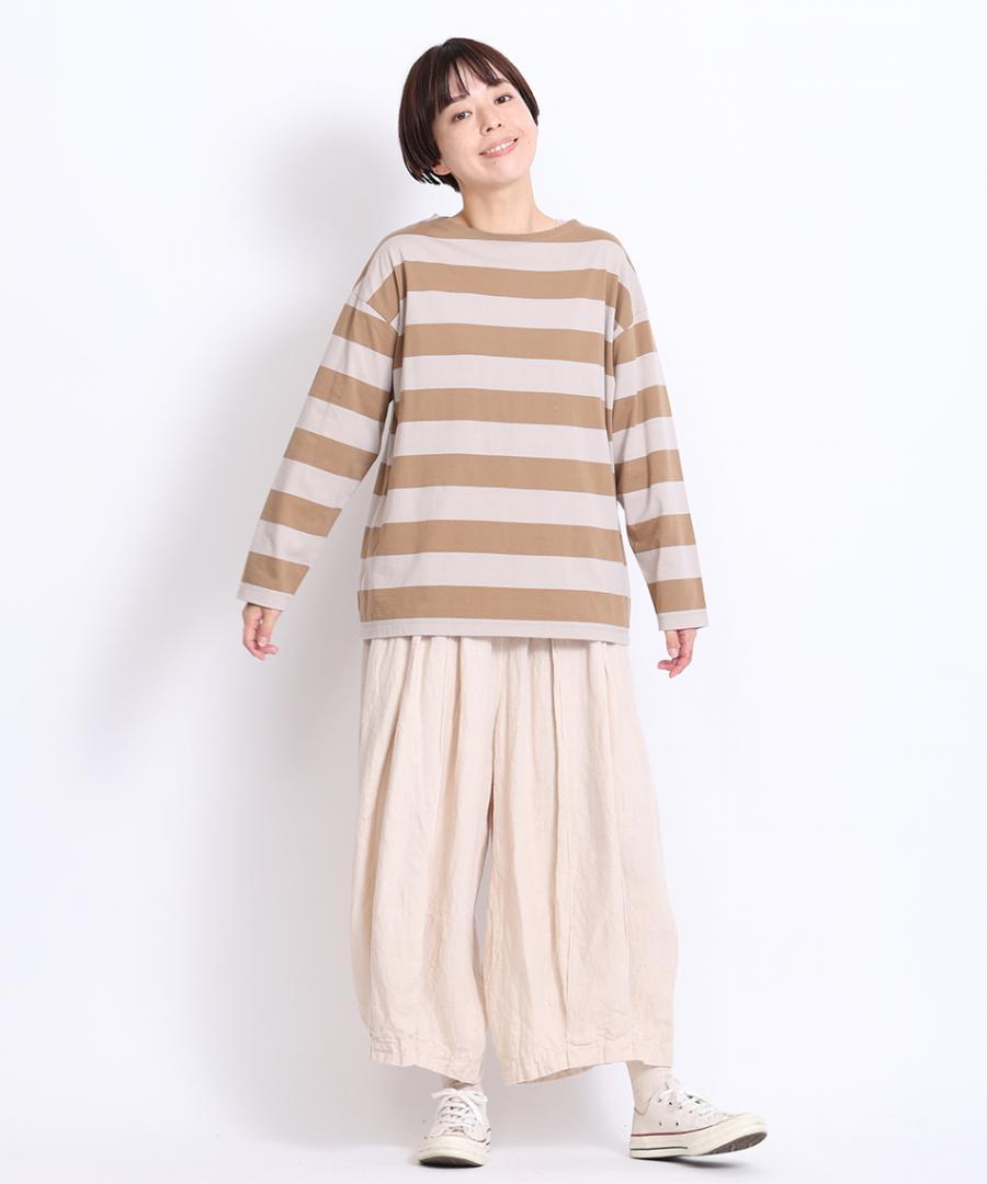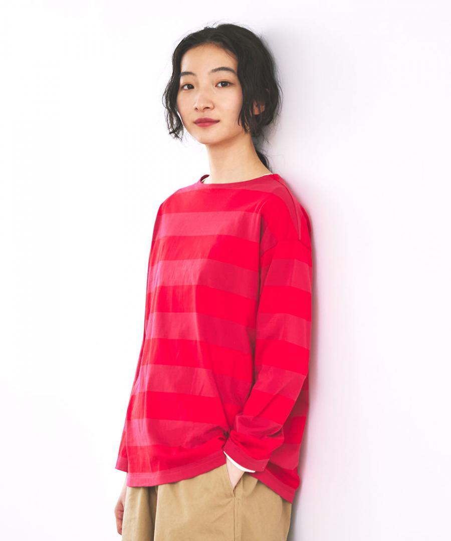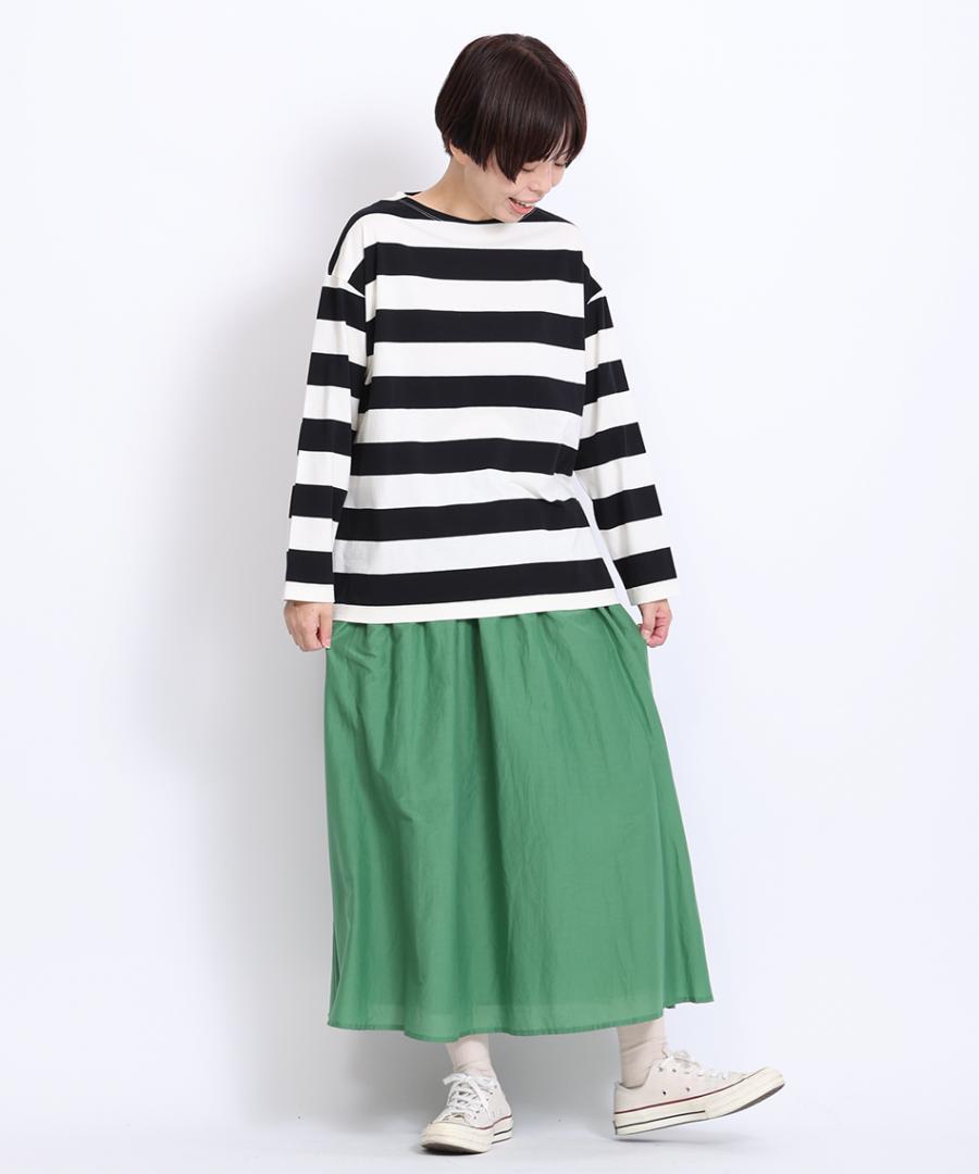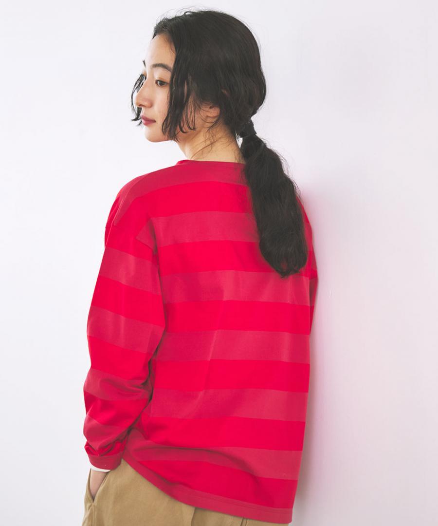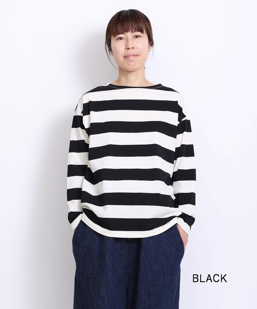 襟元はボートネック、ボーダー柄がカジュアルな印象です。