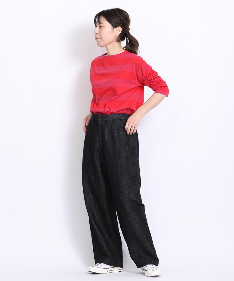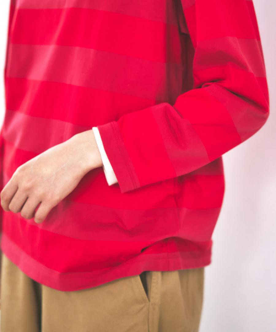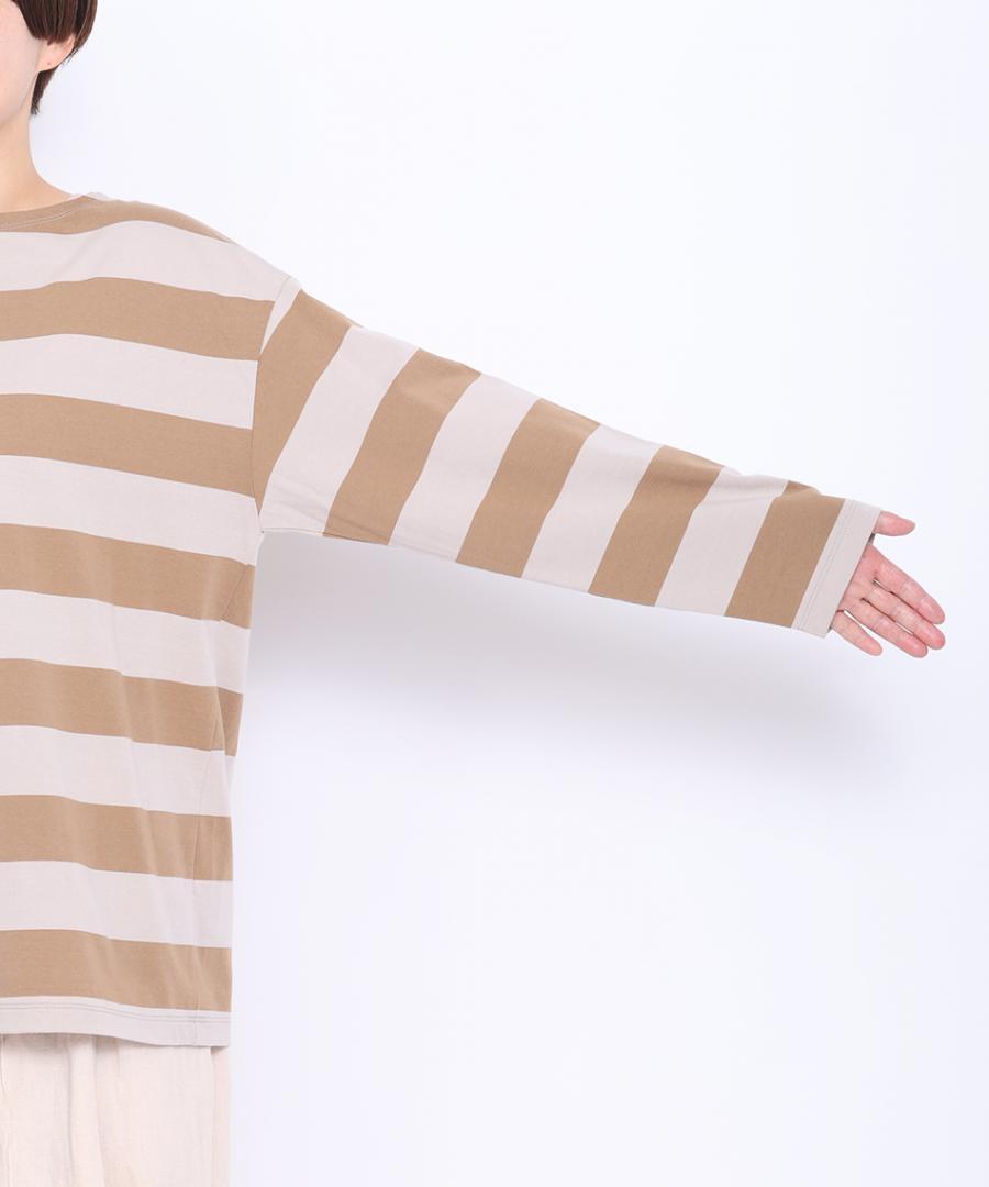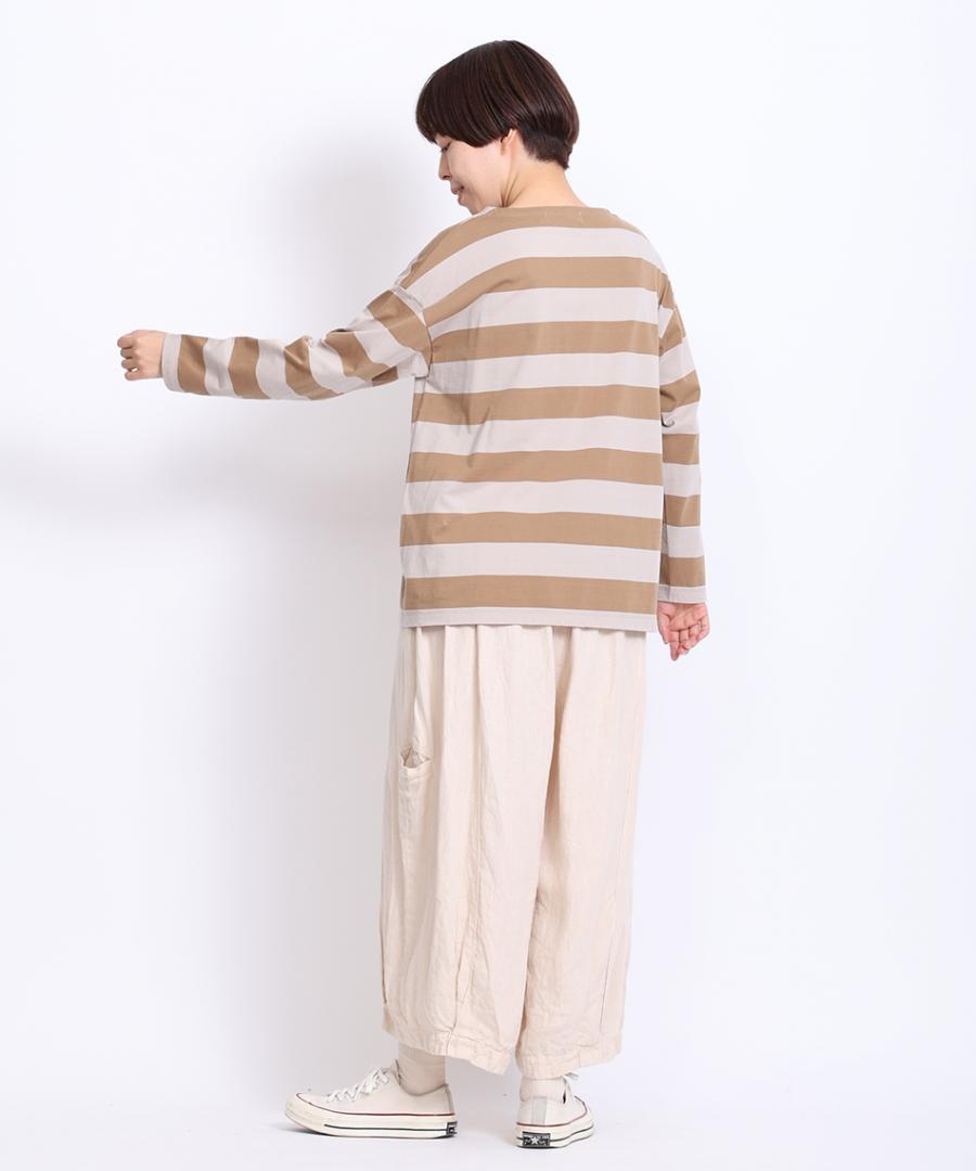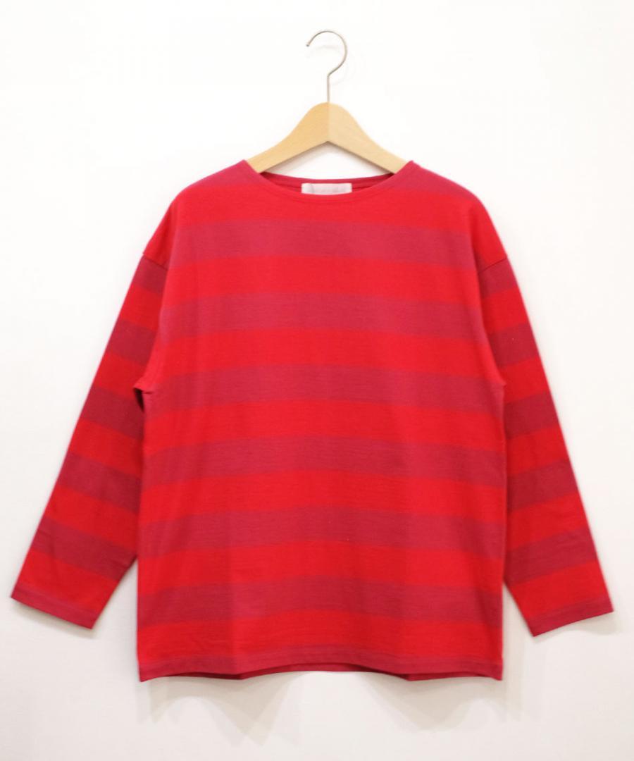 襟元はボートネック、ボーダー柄がカジュアルな印象です。