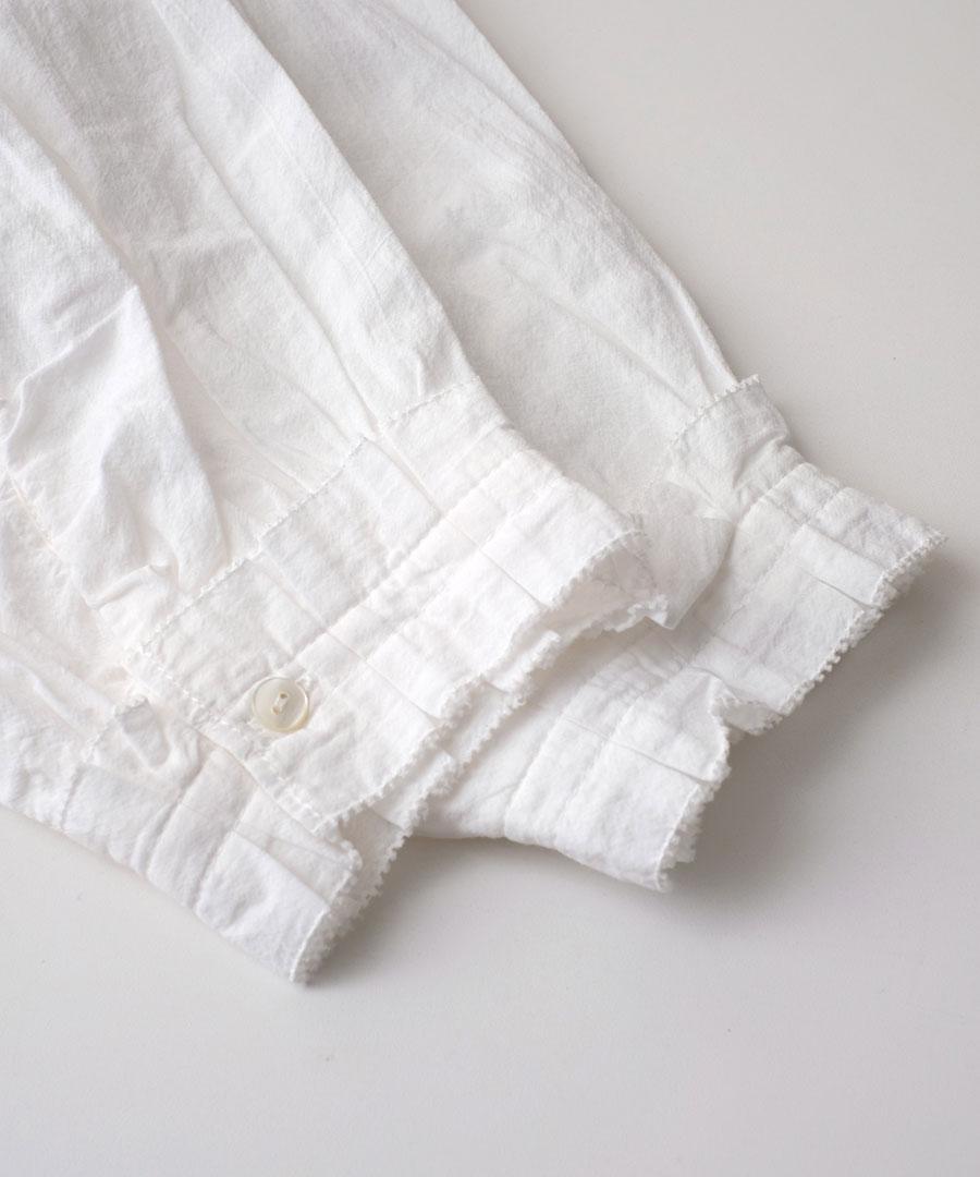シンプルなデザインながら襟と袖口にあしらったフリルが華やかに演出してくれます。