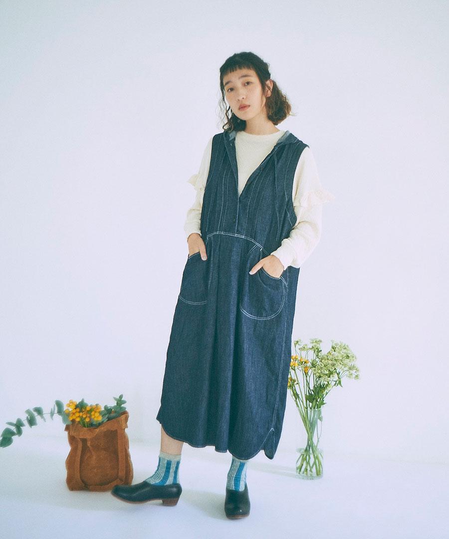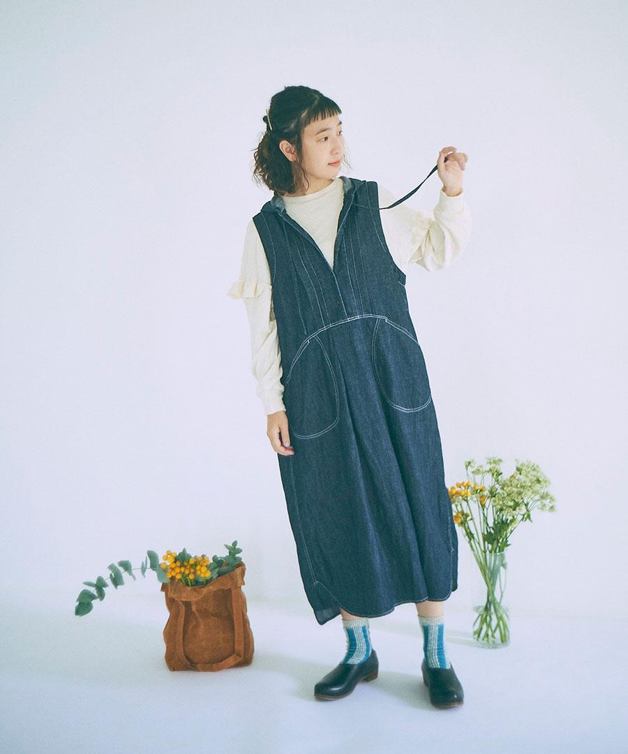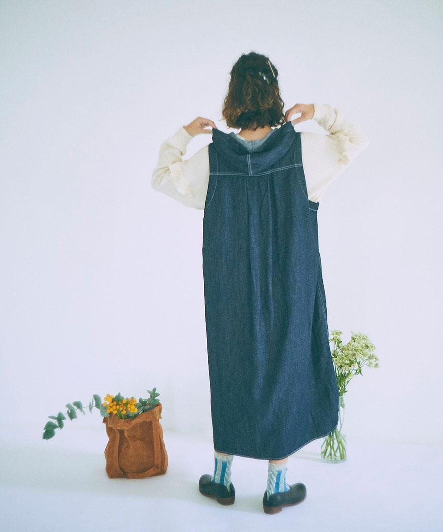甘織りにすることで柔らかな風合いに仕上げ、コットンリネンデニムで仕立てたフードジャンパースカート。