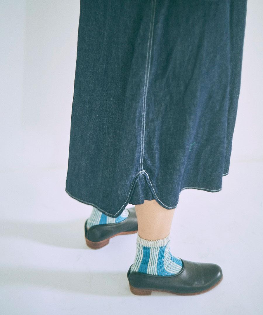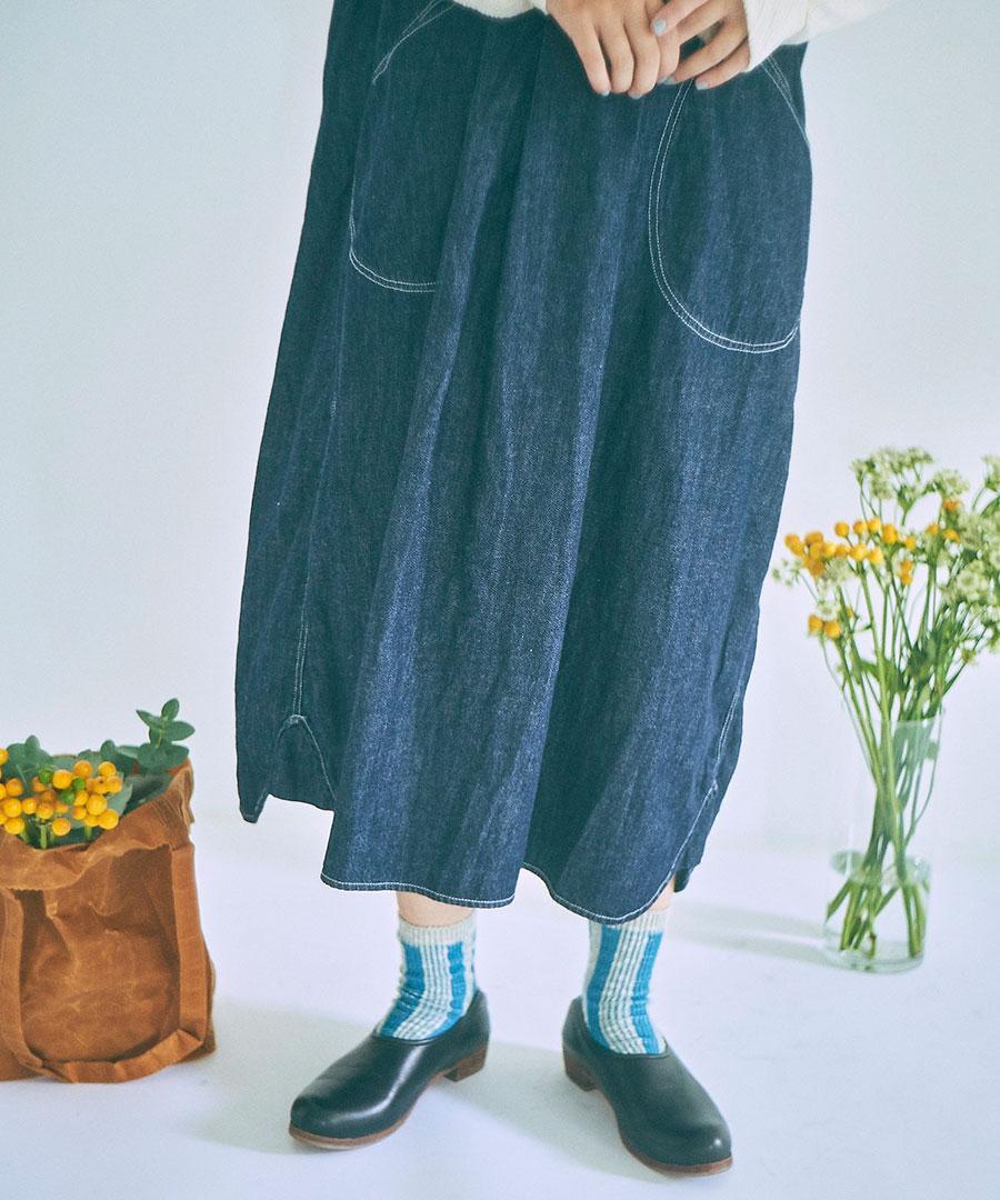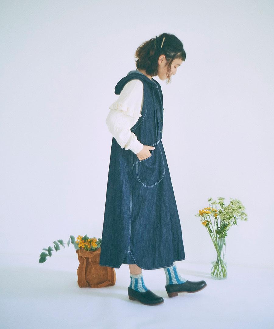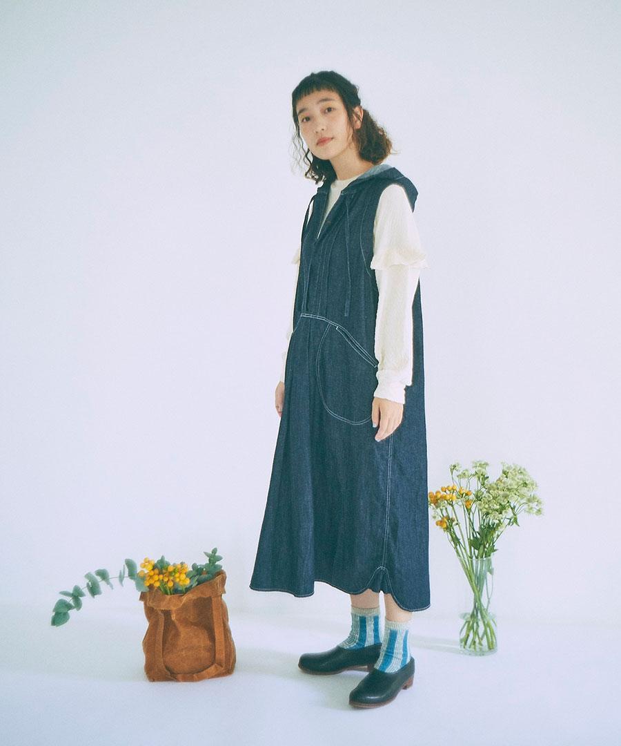 甘織りにすることで柔らかな風合いに仕上げ、コットンリネンデニムで仕立てたフードジャンパースカート。