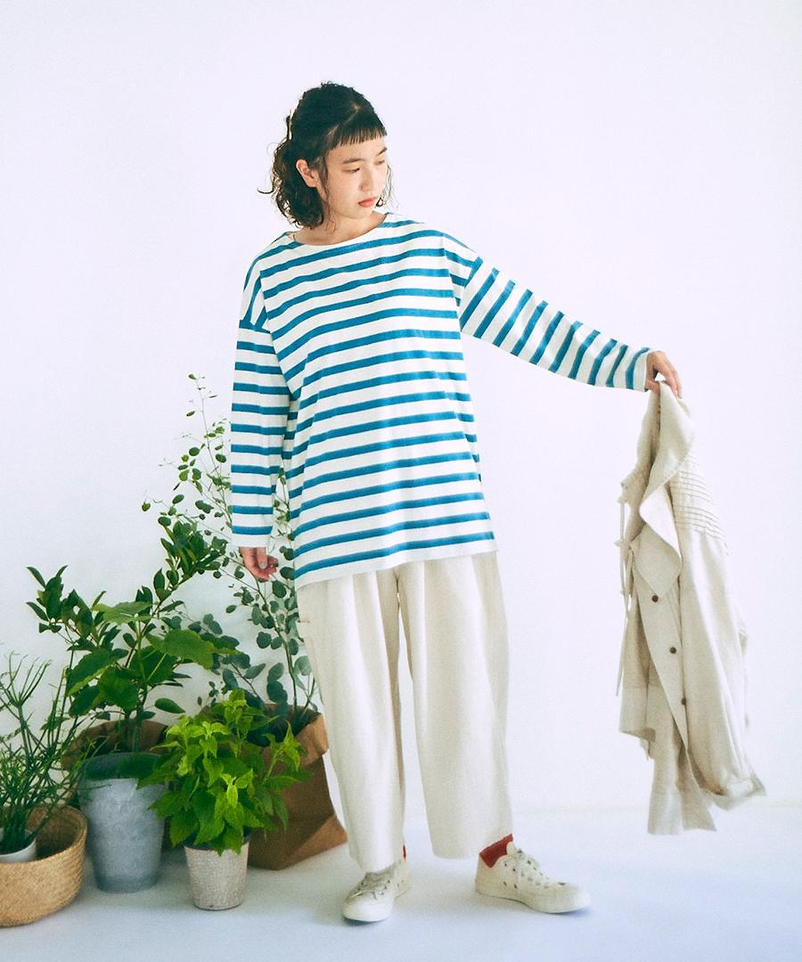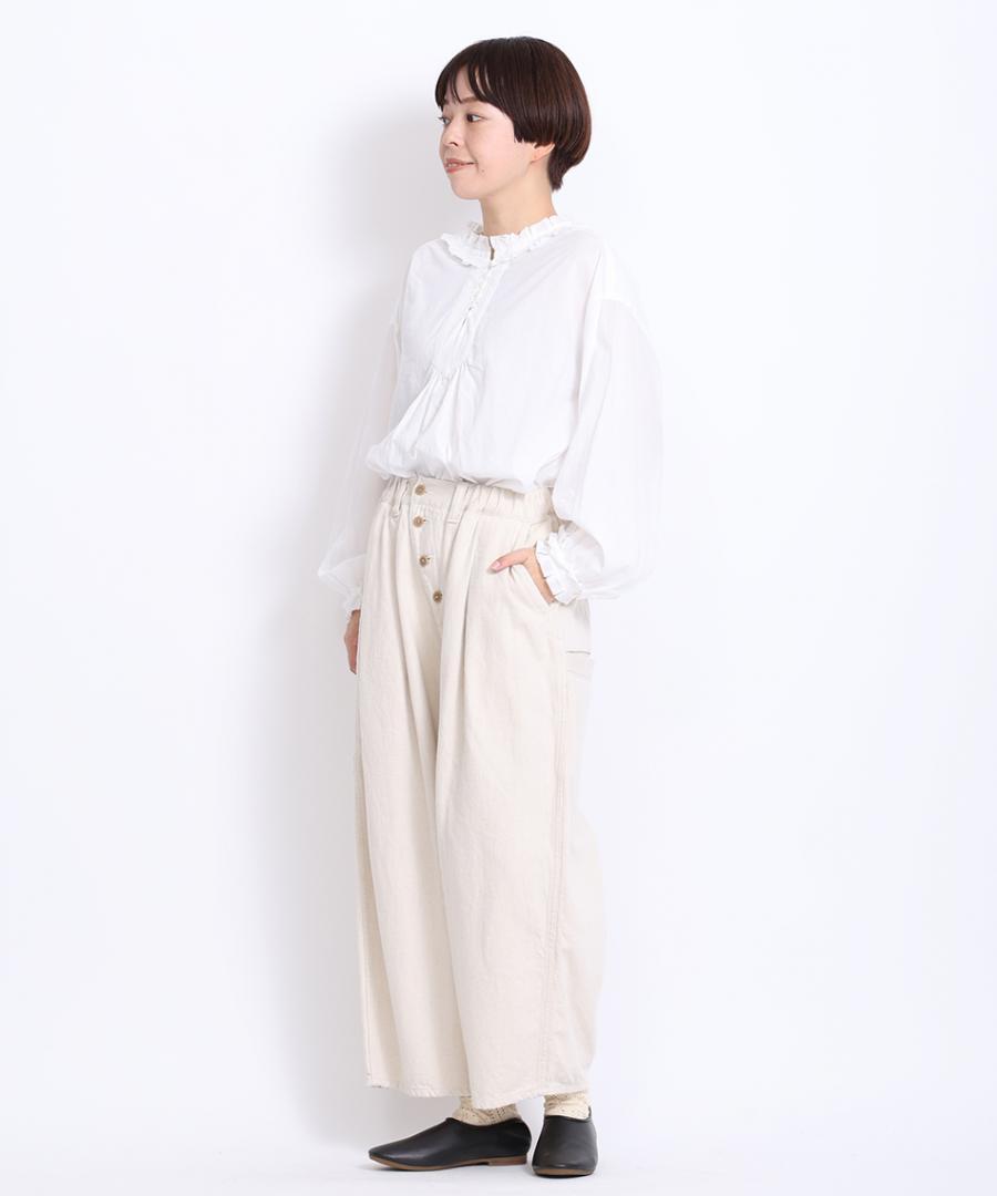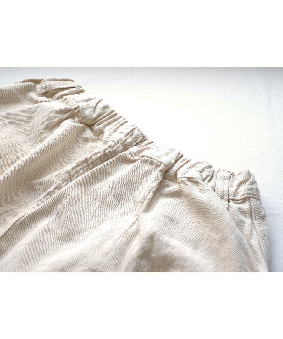 股上深めのゆったりとした穿き心地、ウェストはゴム入りで着心地らくちんです。