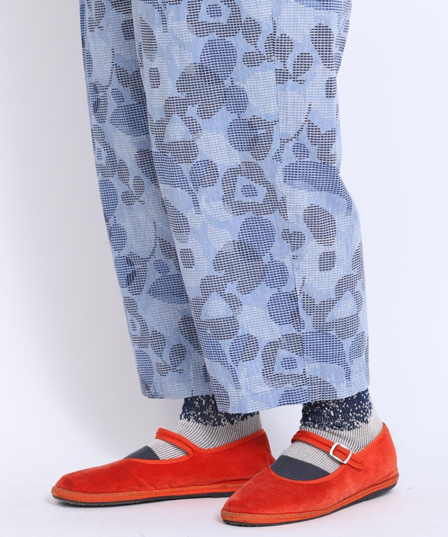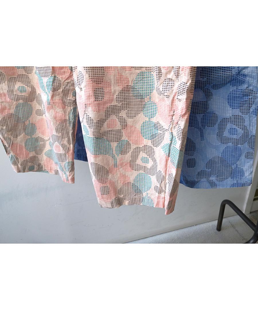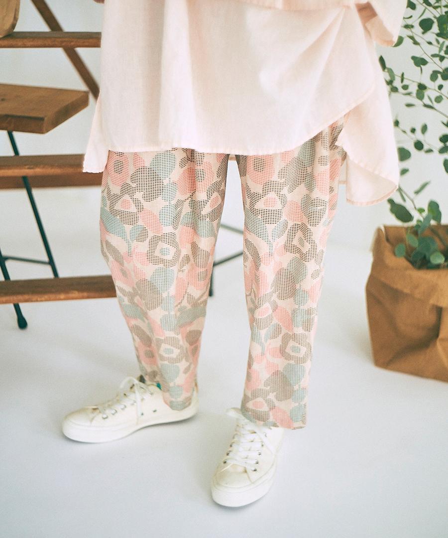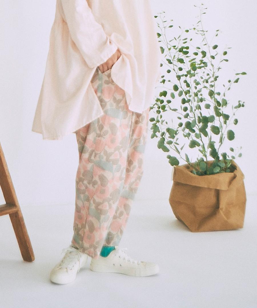春夏シーズンにぴったりな大きめの花柄がプリントされた生地で仕立てたパンツ。
