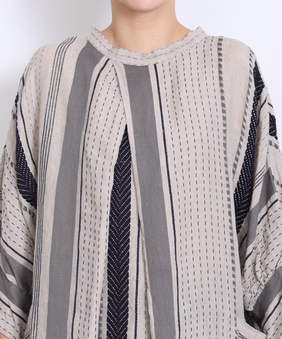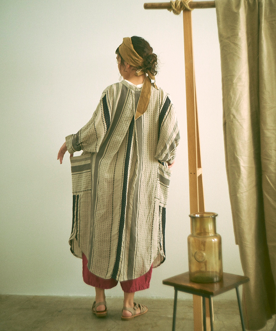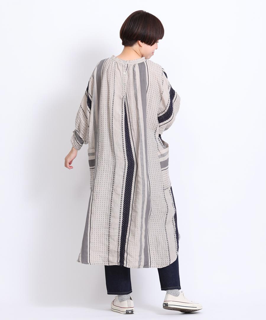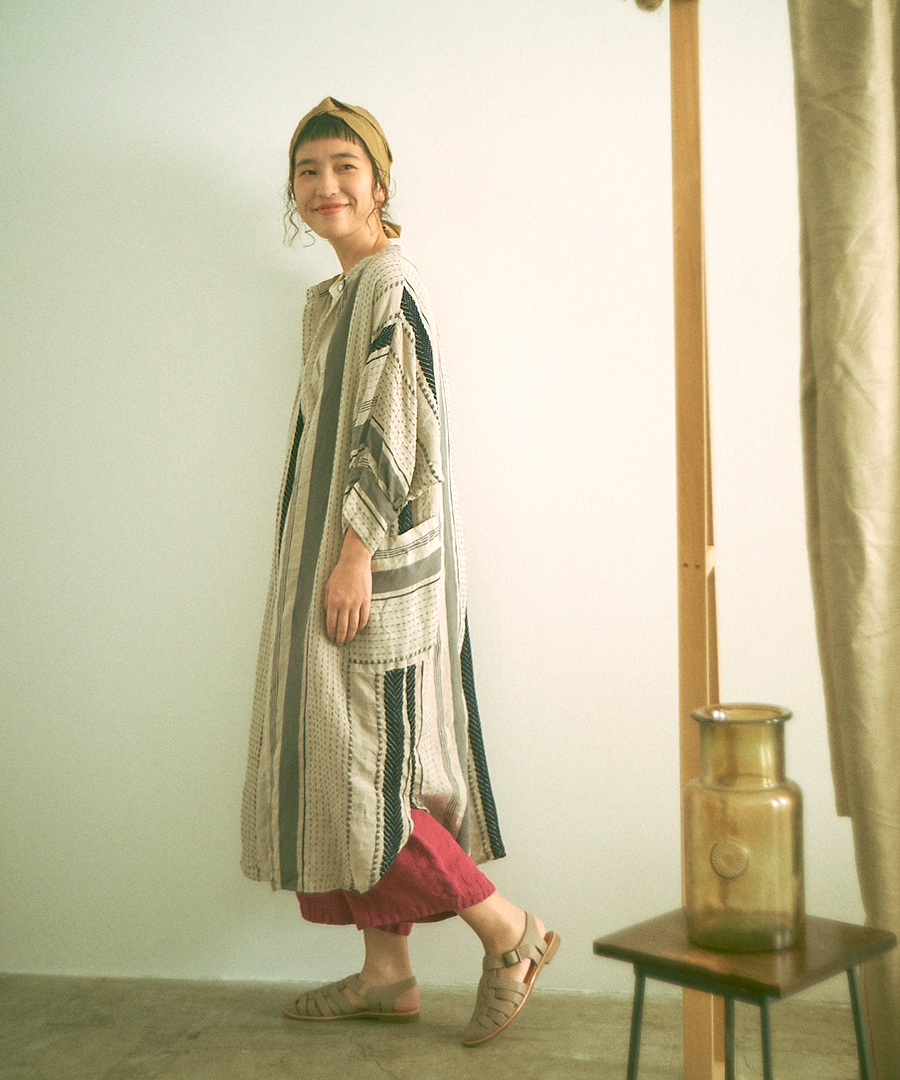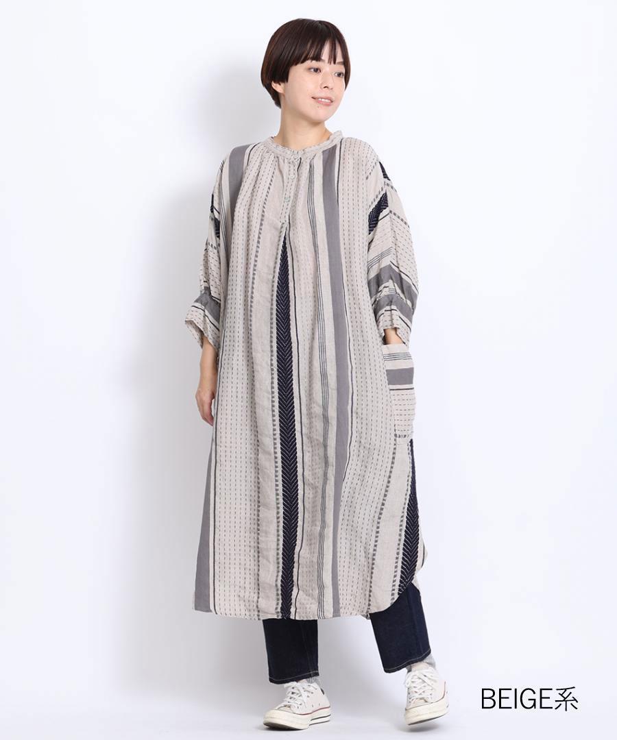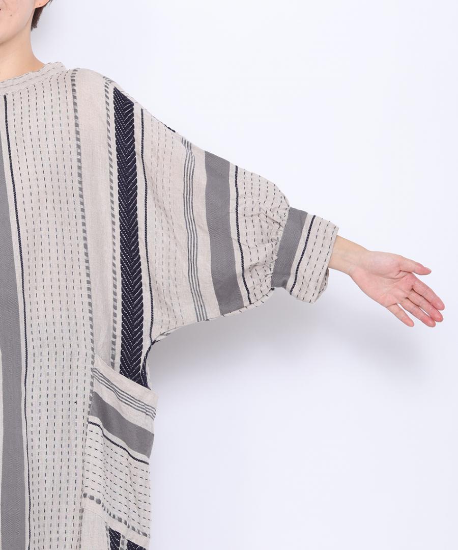 ランダムな配置のストライプ柄がパッと目を惹く、ナチュラルな風合いが魅力のデザインワンピースです。
