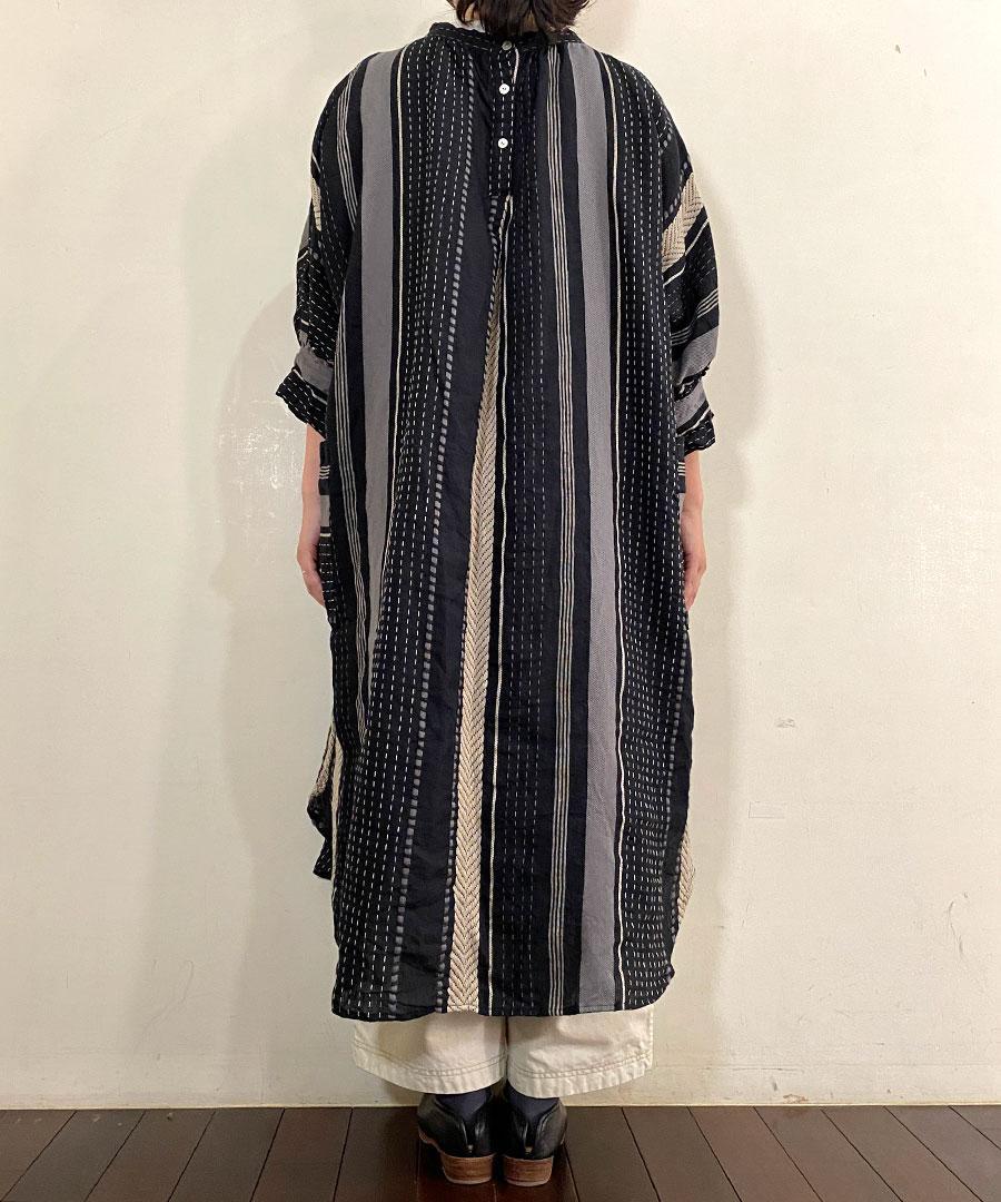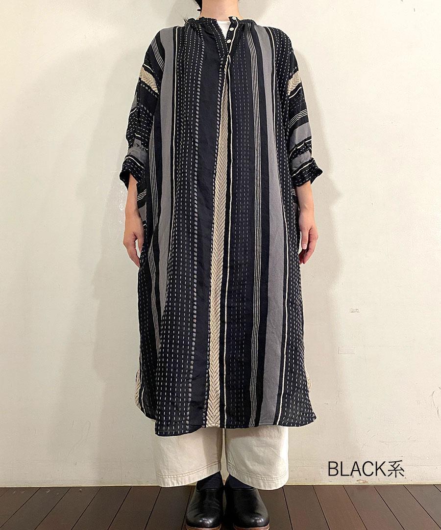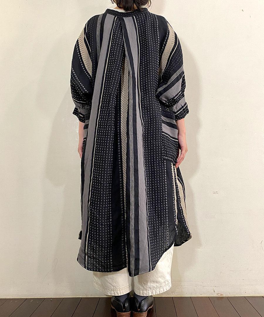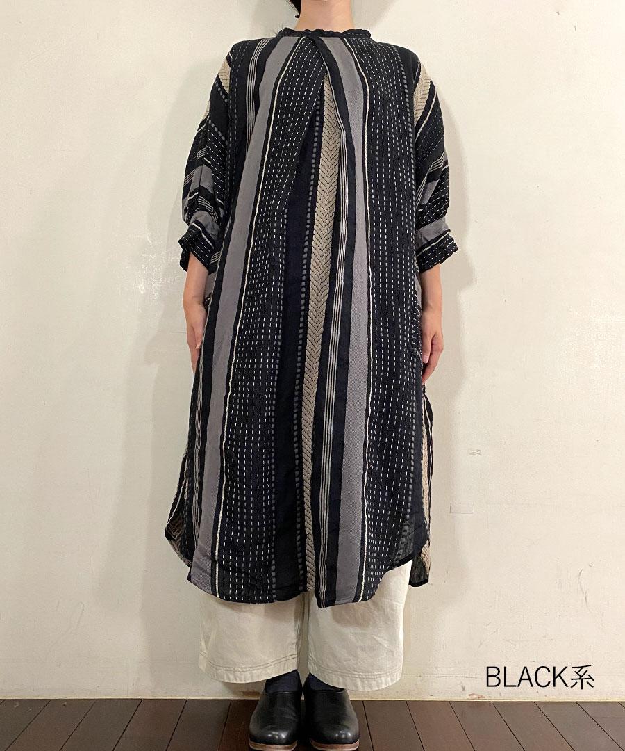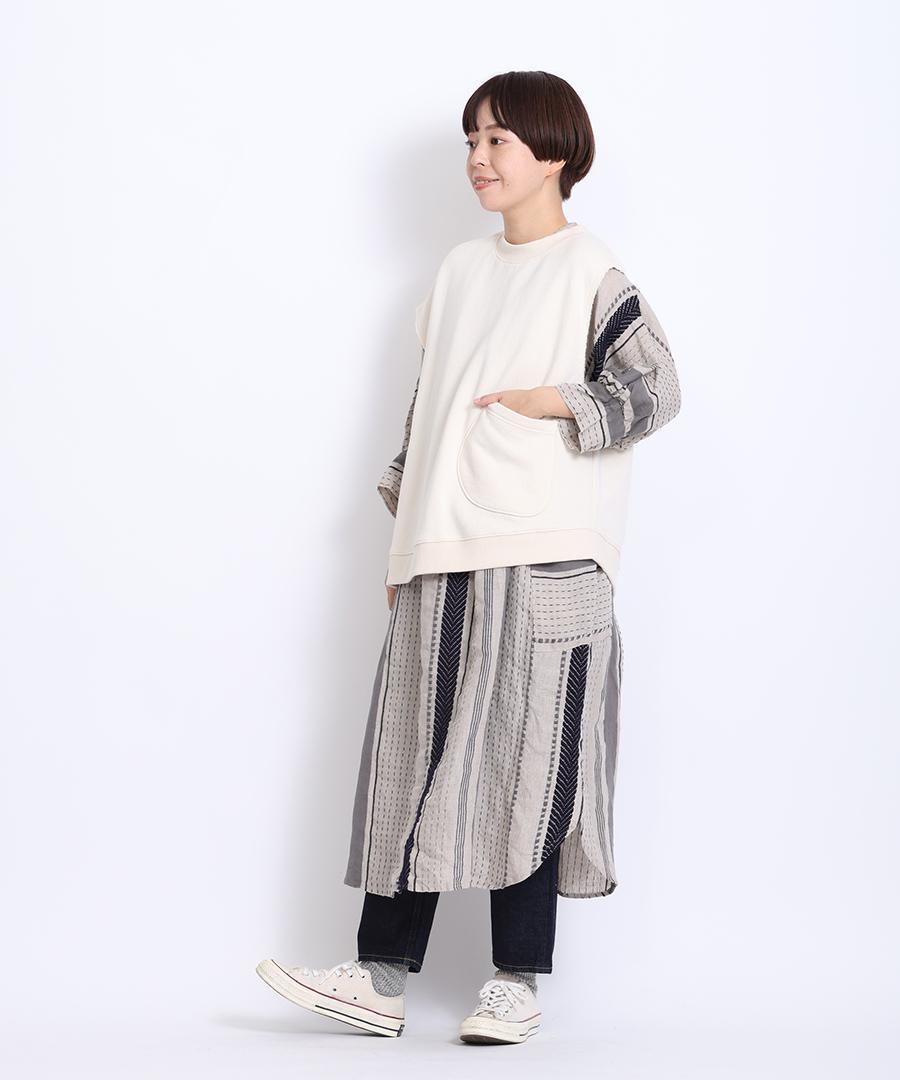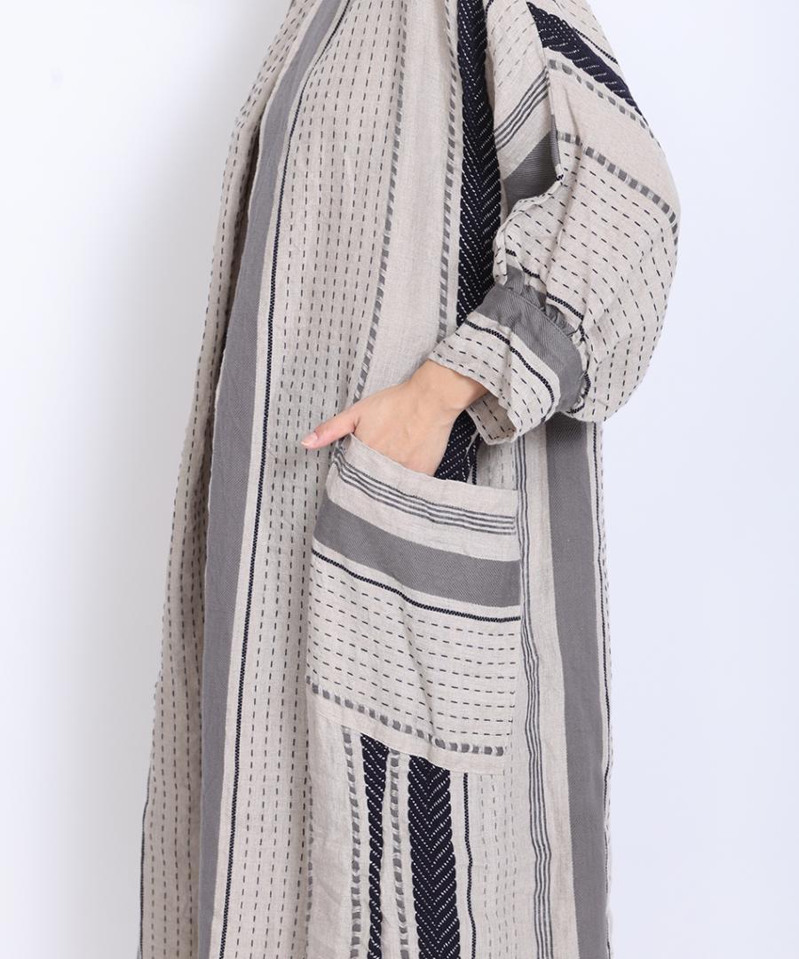 ランダムな配置のストライプ柄がパッと目を惹く、ナチュラルな風合いが魅力のデザインワンピースです。