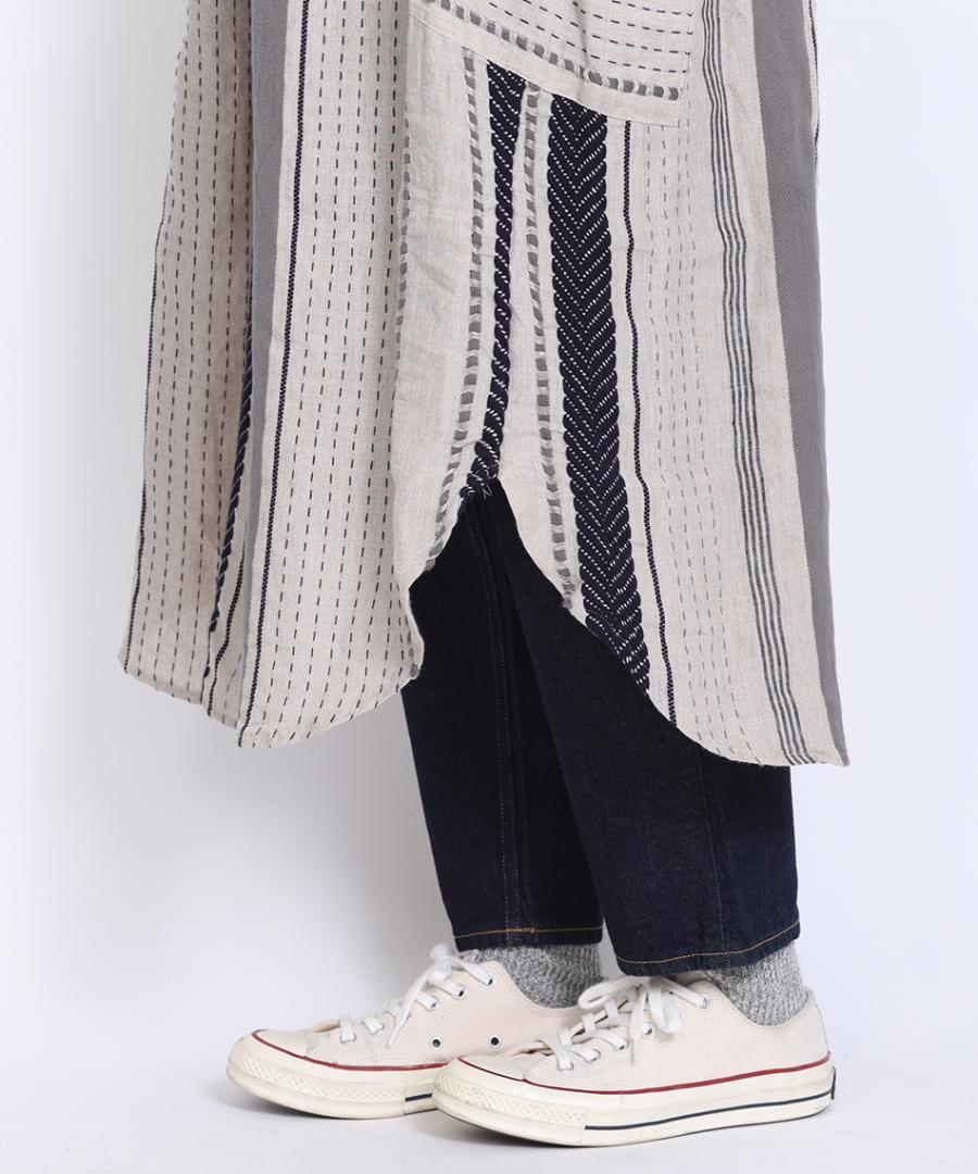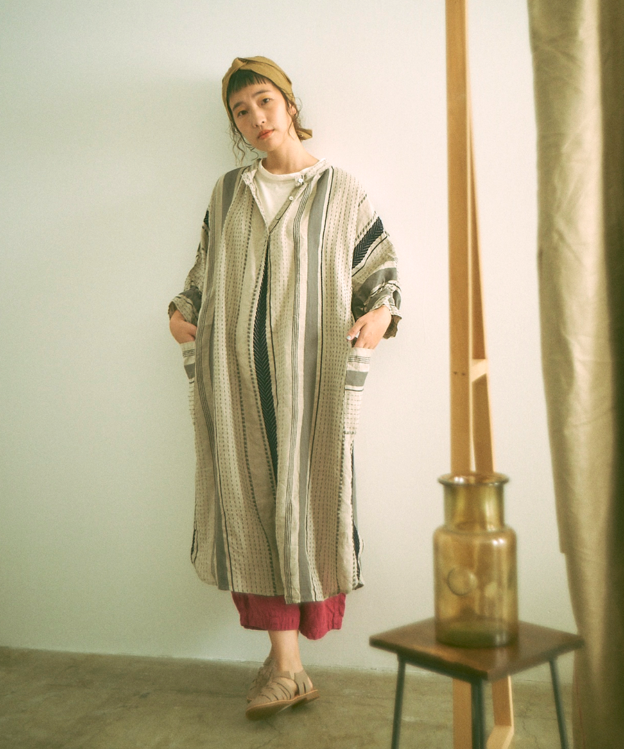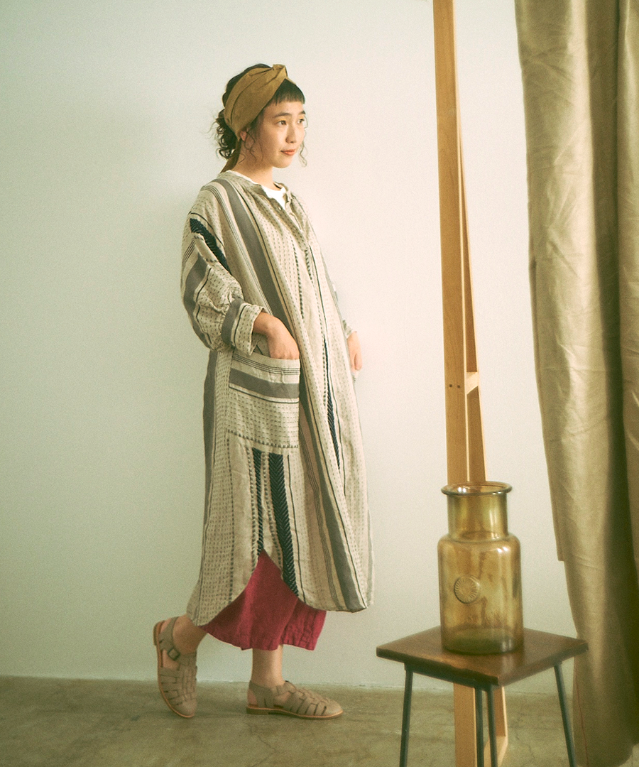 薄手のコットンリネンを使用し、表面感が出るように数種類の織りや太番手の糸を組み合わせて作ったオリジナルファブリック。ランダムなマルチストライプ柄がナチュラルな雰囲気たっぷりです。