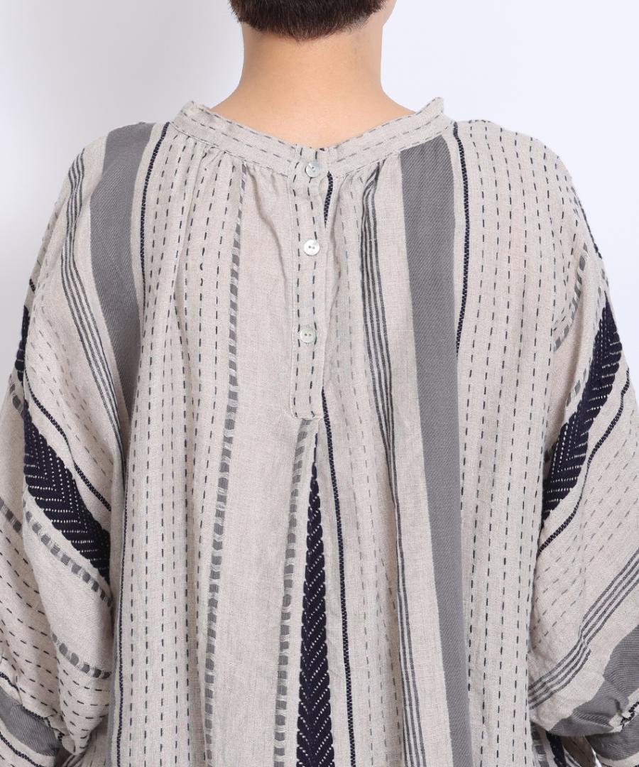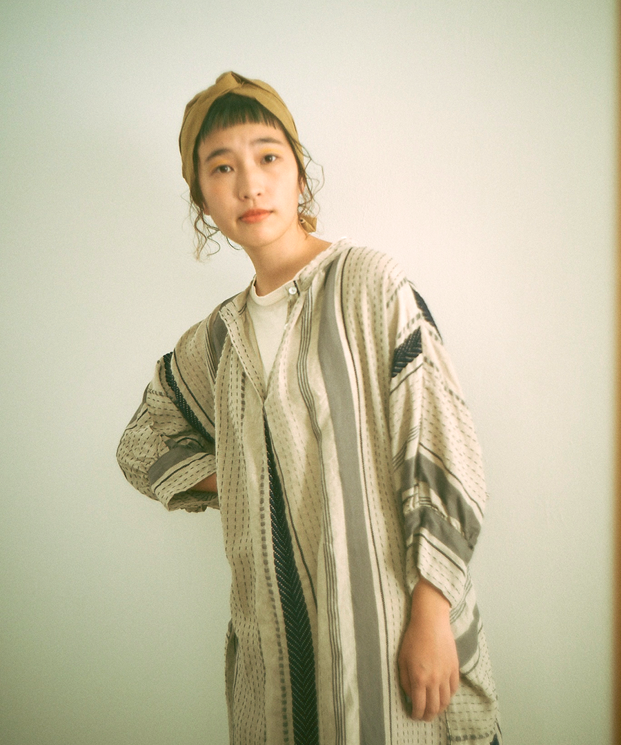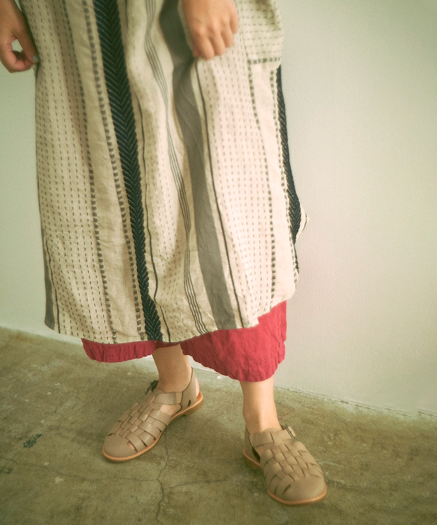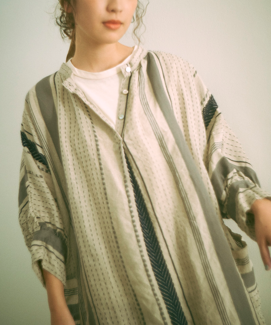 薄手のコットンリネンを使用し、表面感が出るように数種類の織りや太番手の糸を組み合わせて作ったオリジナルファブリック。ランダムなマルチストライプ柄がナチュラルな雰囲気たっぷりです。