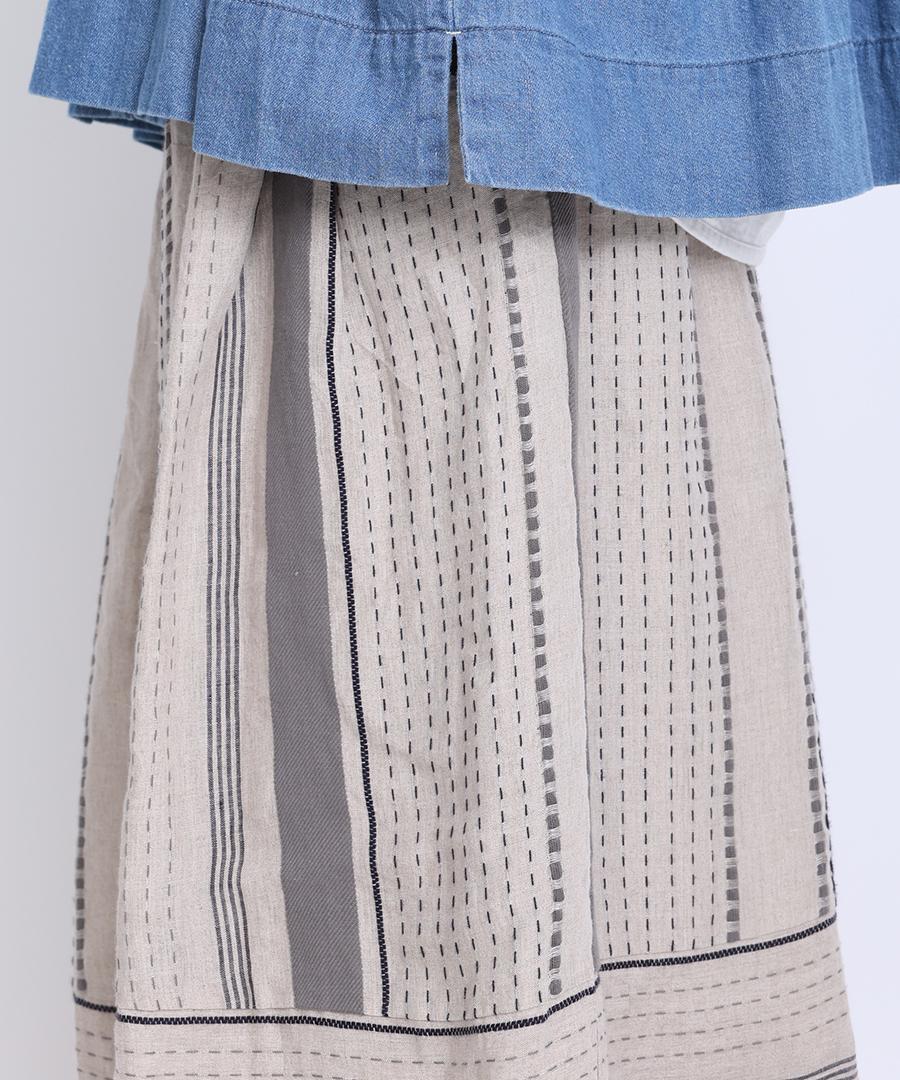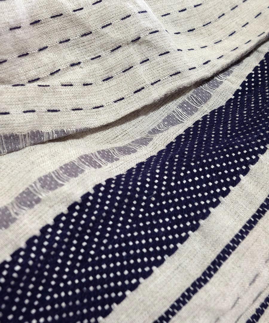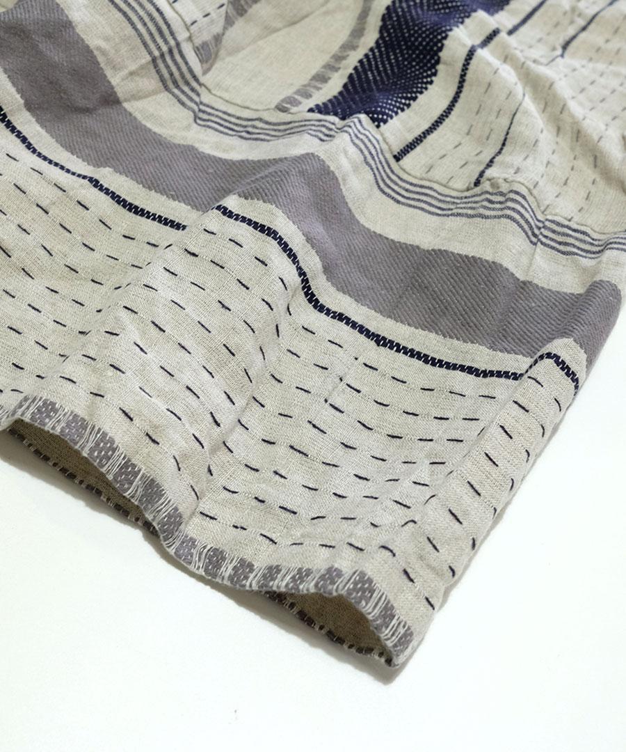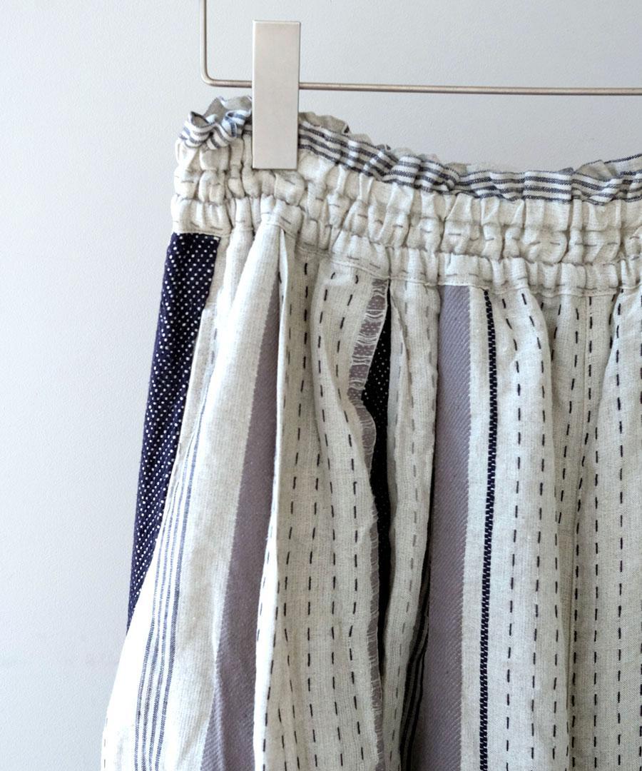 薄手のコットンリネンを使用し、表面感が出るように数種類の織りや太番手の糸を組み合わせて作ったオリジナルファブリック。ランダムなマルチストライプ柄がナチュラルな雰囲気たっぷりです。