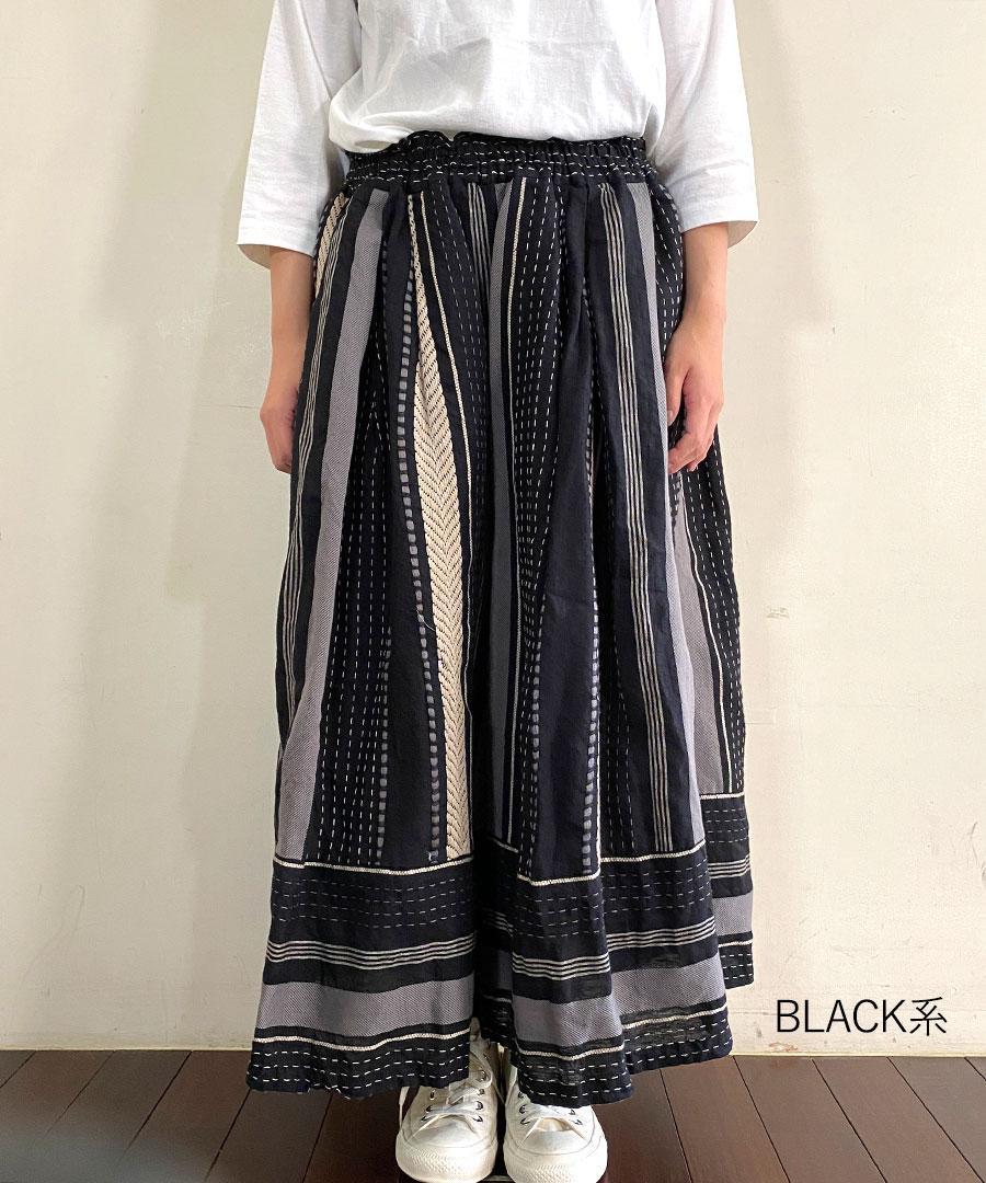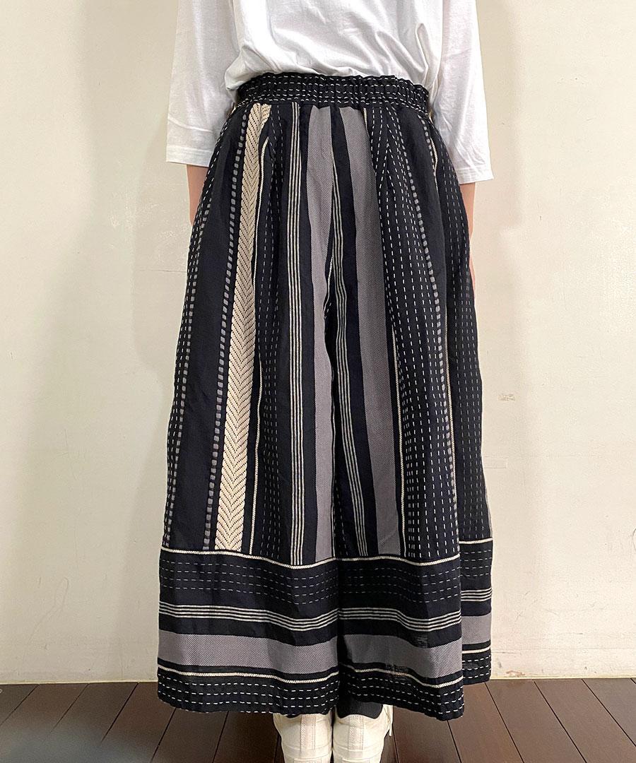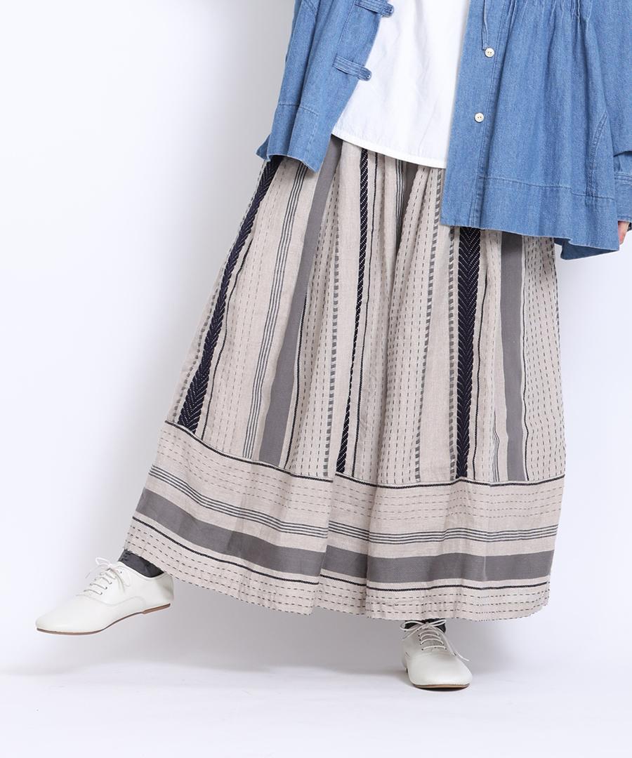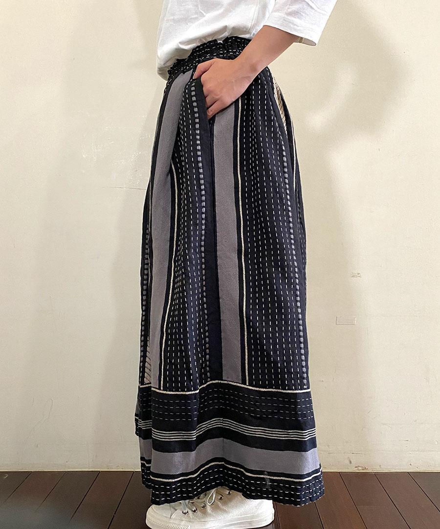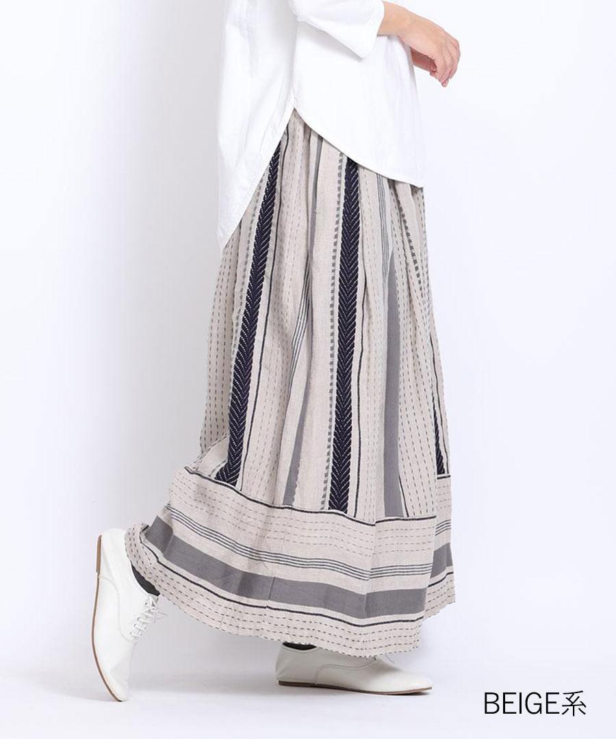 ランダムな配置のストライプ柄がパッと目を惹くデザインで、ナチュラルな風合いが魅力のパンツです。