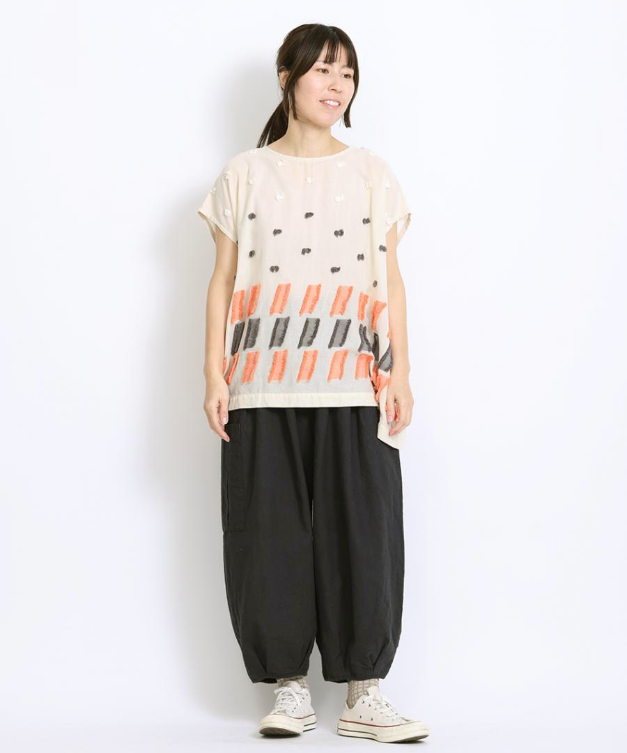シンプルなパンツと合わせるだけでもぐっと華やかなコーデになりますよ。