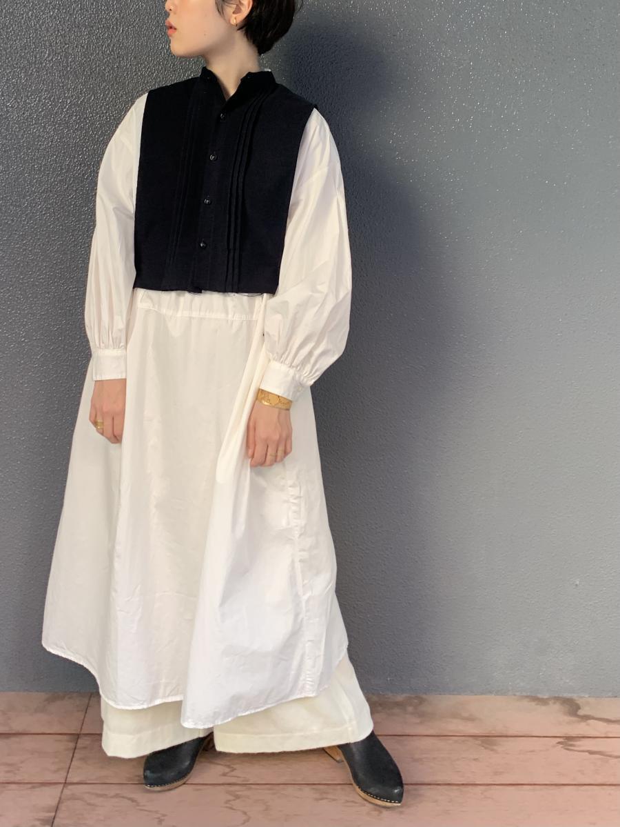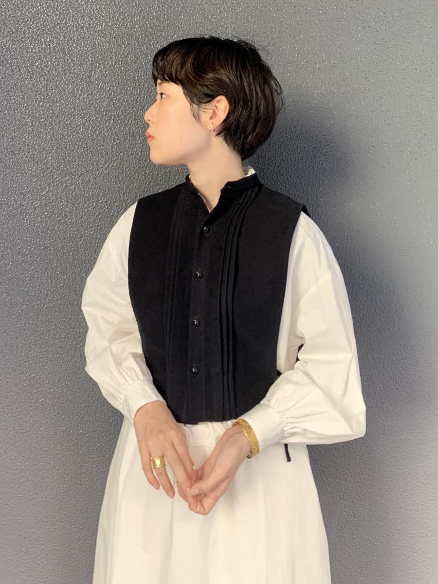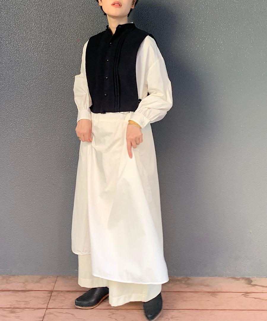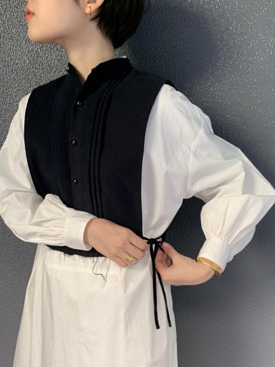 襟ぐりや前部がすっきりしているのでシャツやブラウス、ニットの上から重ねて使っていただければいつものお洋服もまた違った雰囲気で楽しんでいただけるのではないでしょうか。