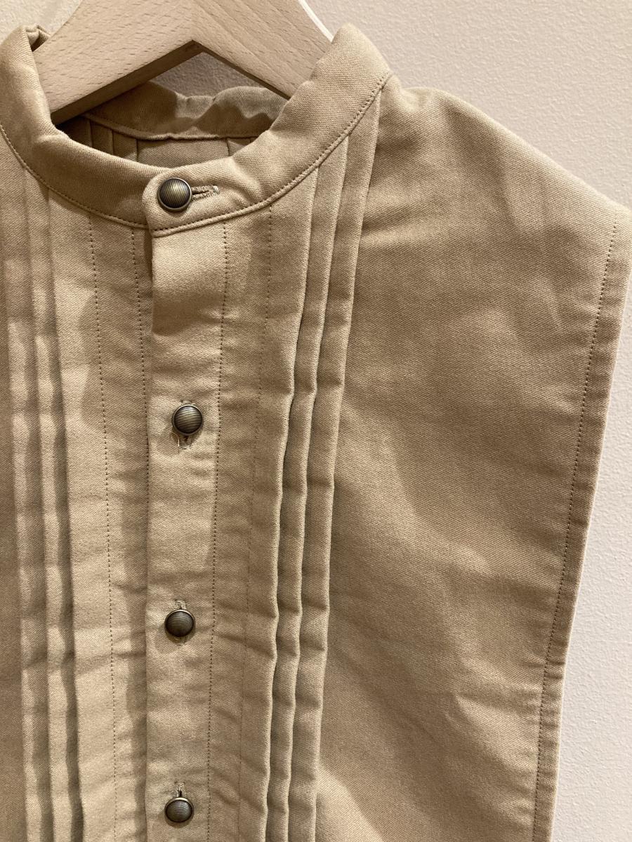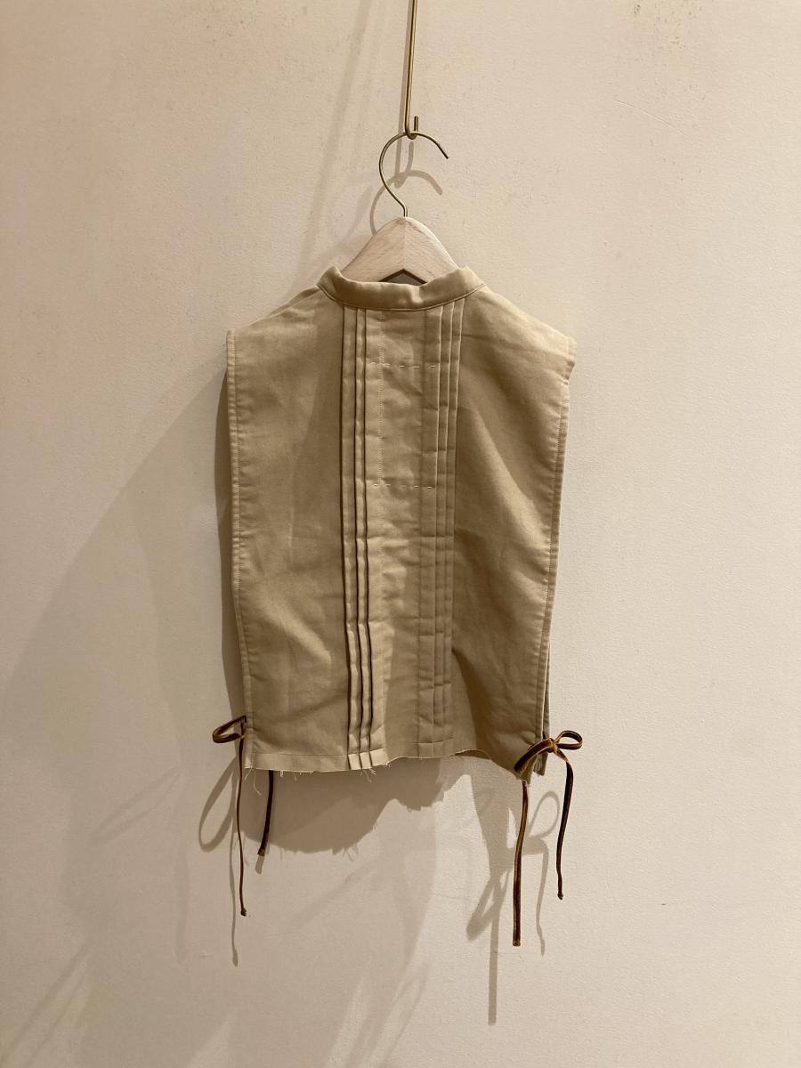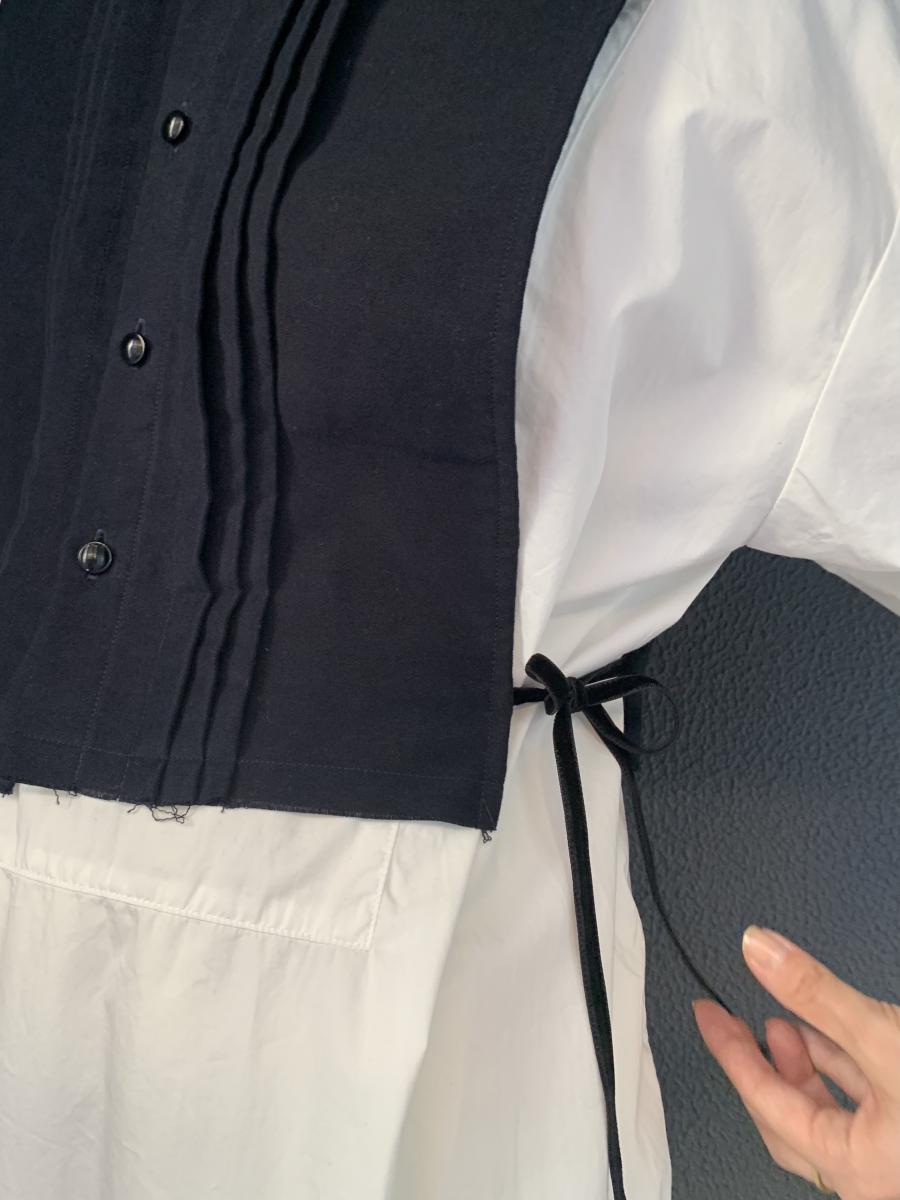 襟ぐりや前部がすっきりしているのでシャツやブラウス、ニットの上から重ねて使っていただければいつものお洋服もまた違った雰囲気で楽しんでいただけるのではないでしょうか。