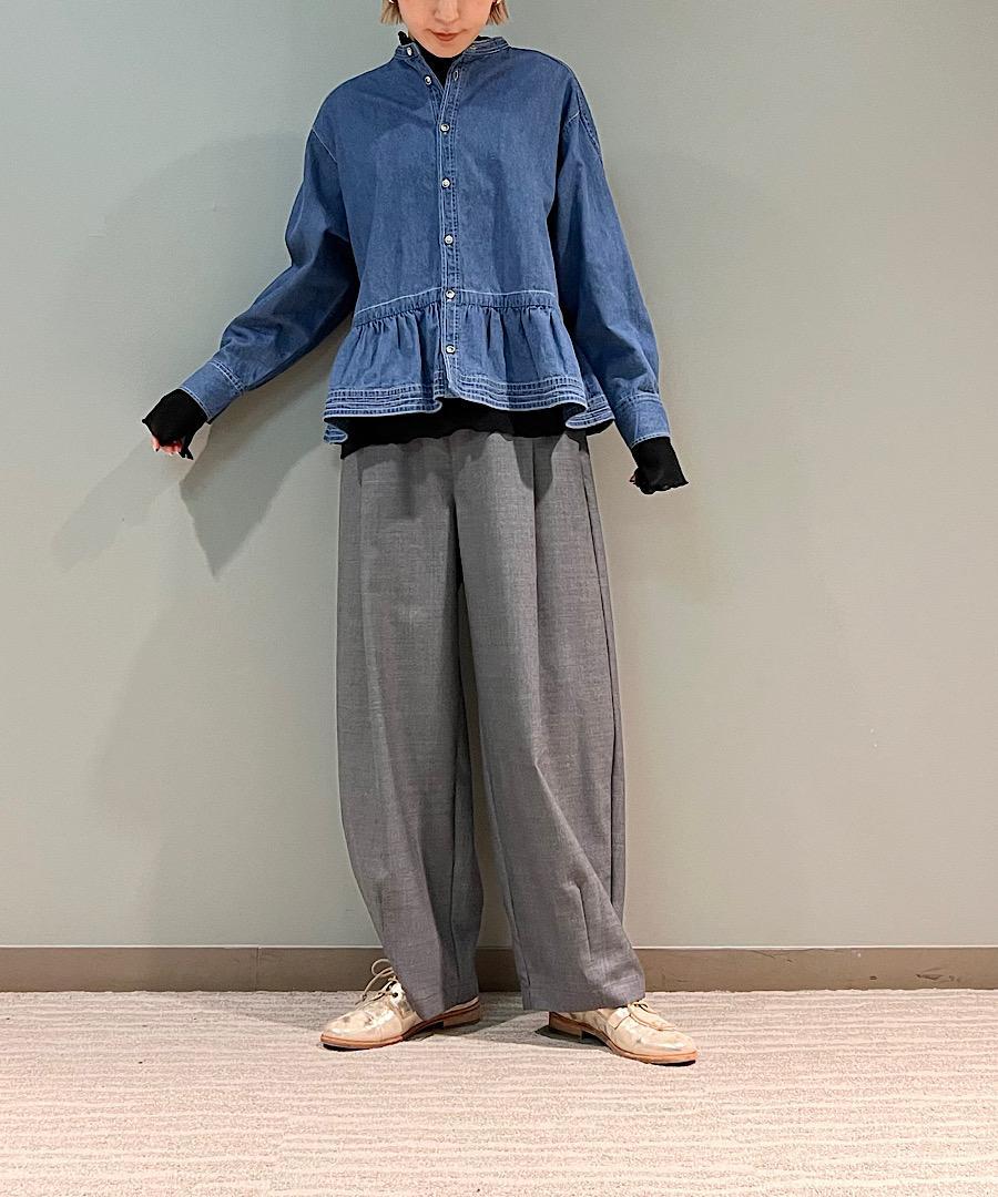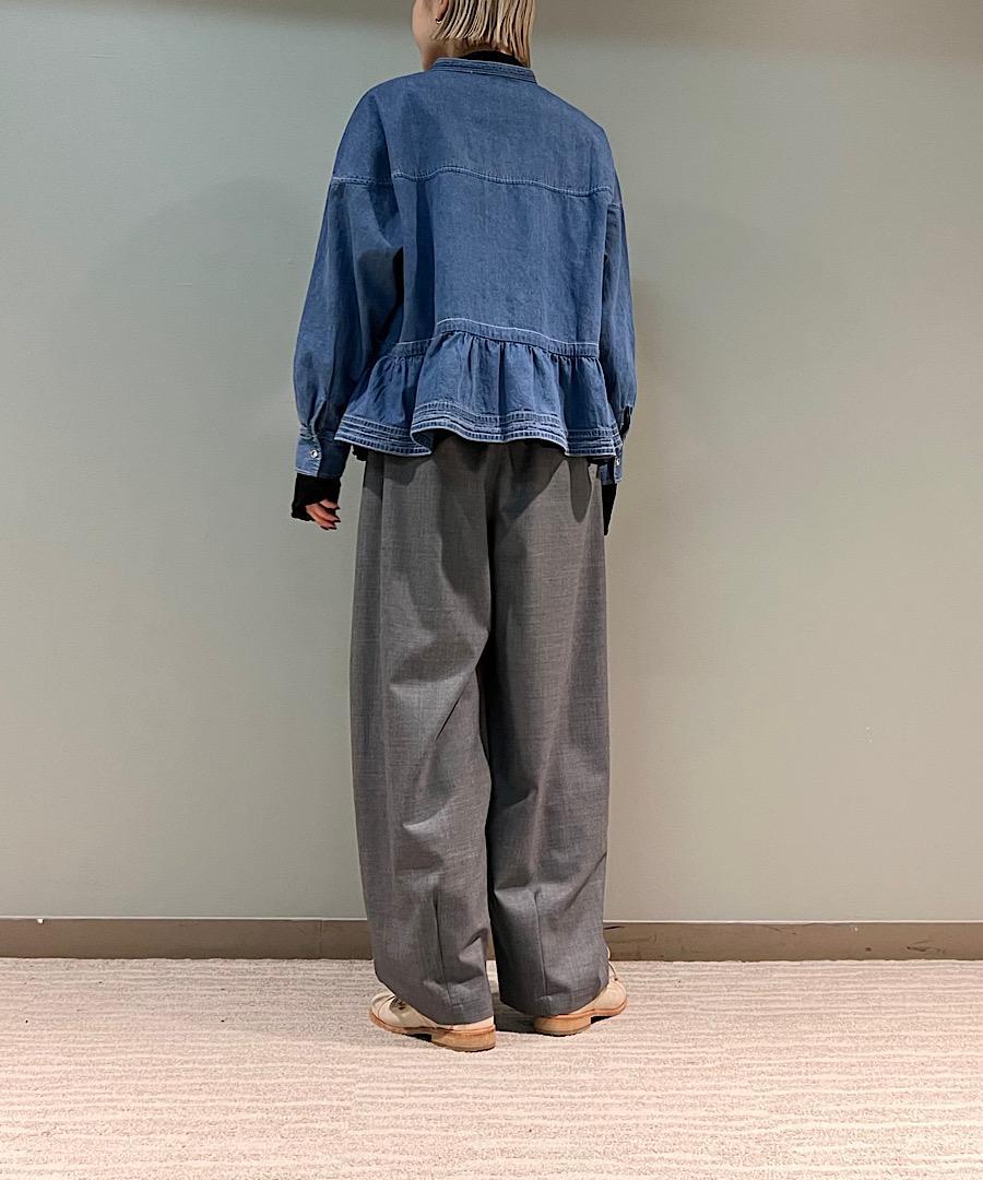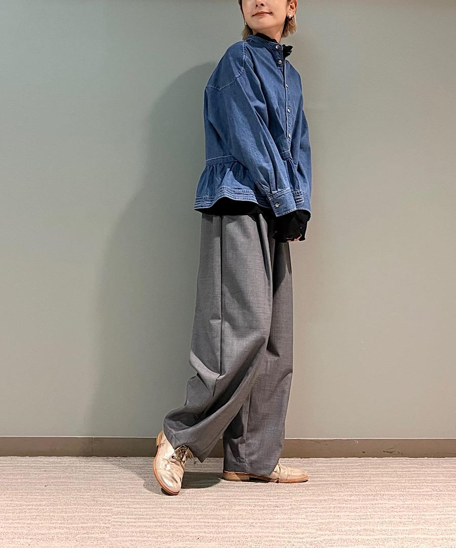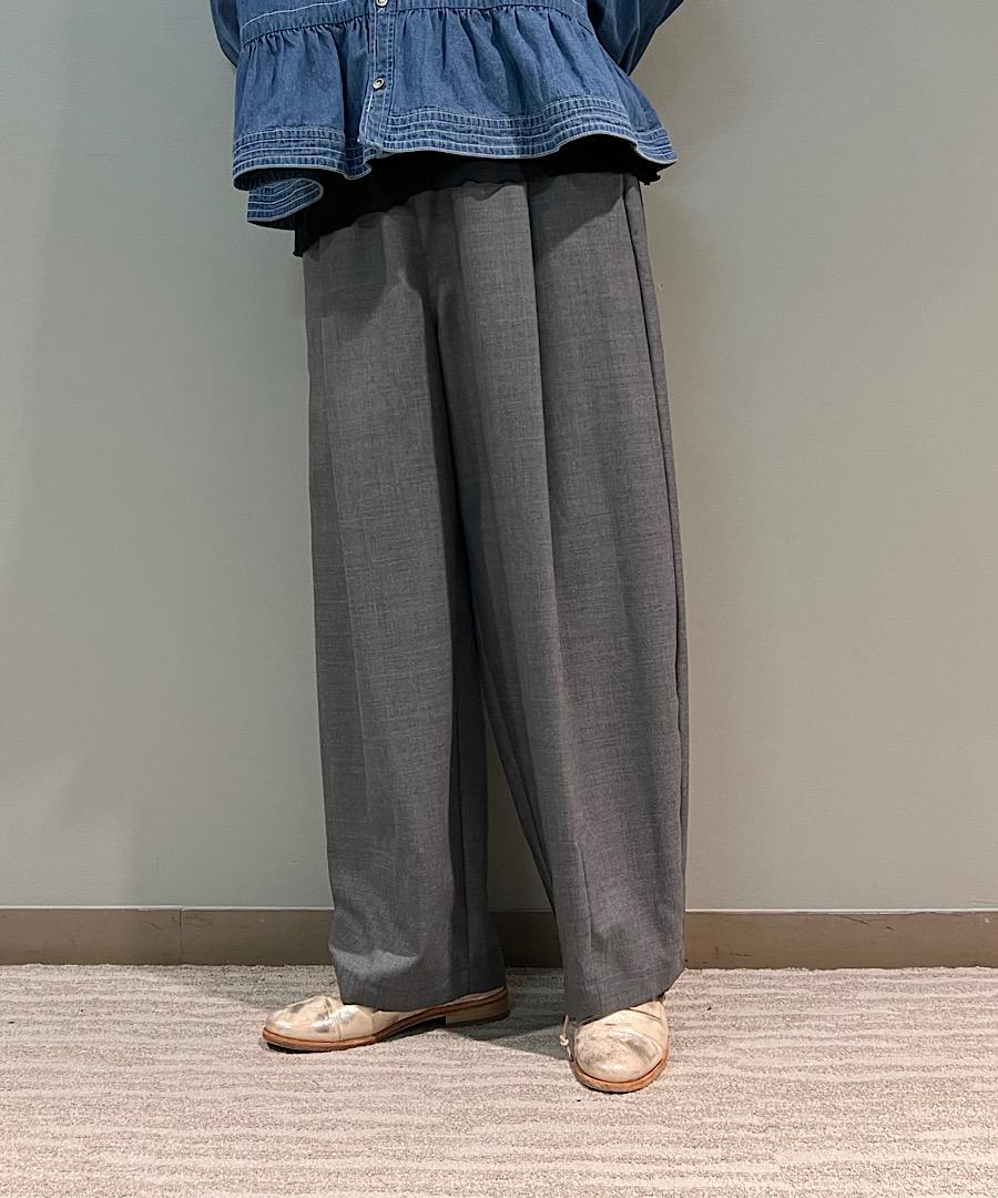 ウエストのギャザーとフロントタックで立体感をプラスしました。