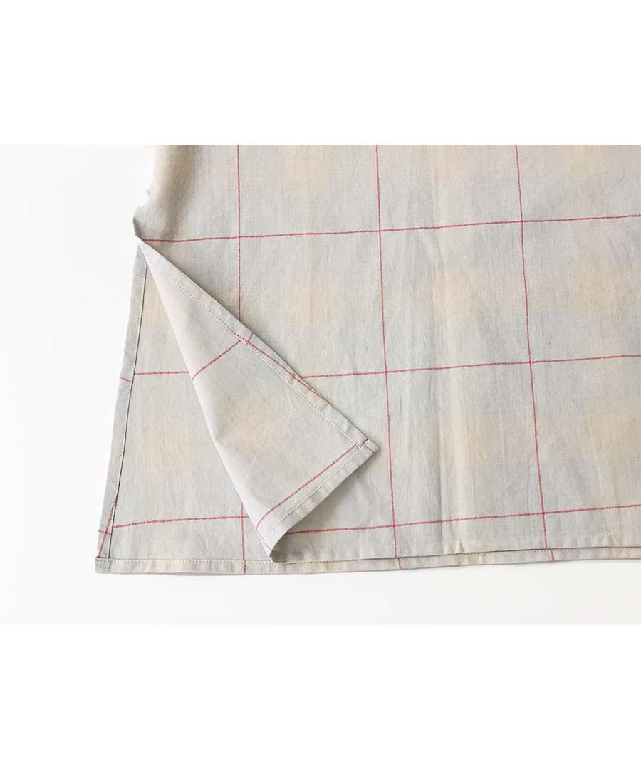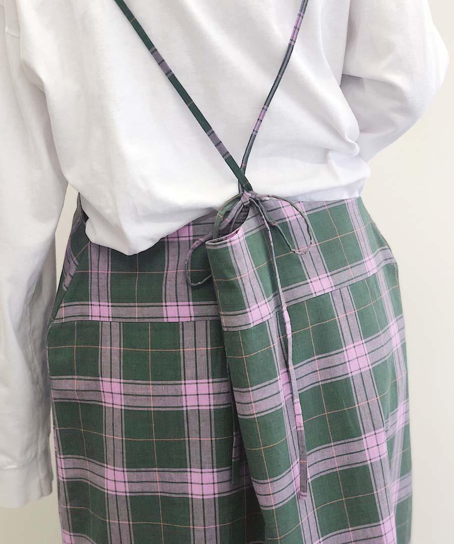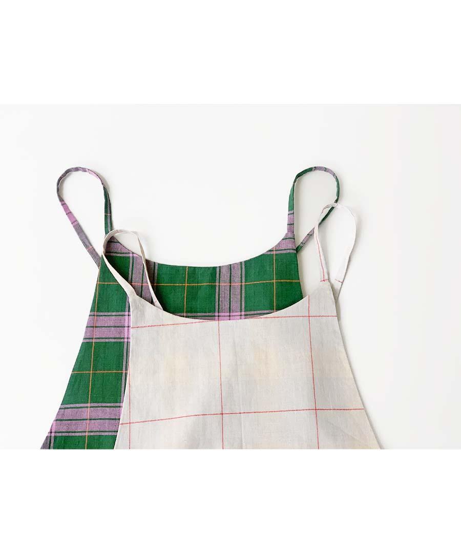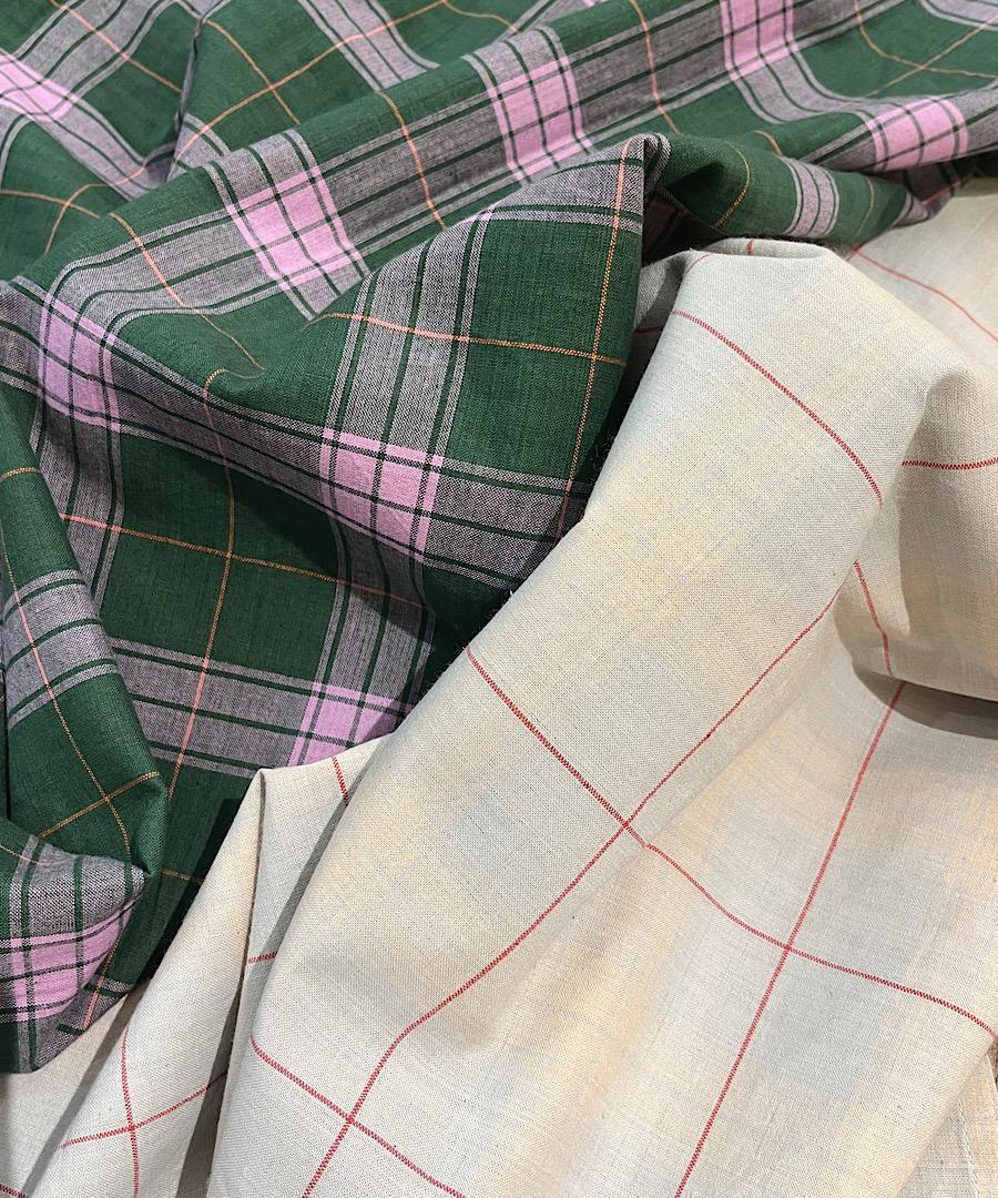 目の覚めるグリーンとピンク、優しいグレーとベージュのチェック柄の柔らかなコットン生地を使用。