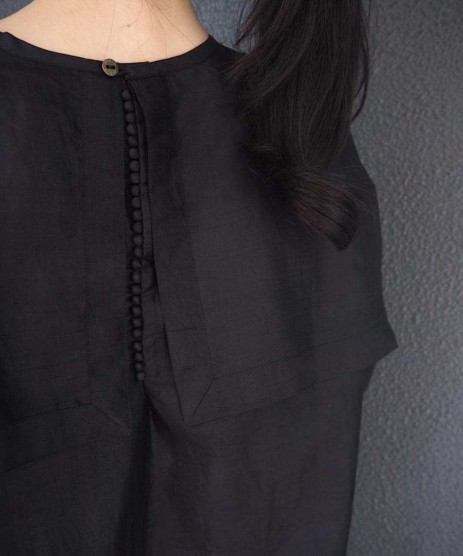 背中の襟の隙間に並んだ、手仕事のプクプクしたボタンがアクセサリーのよう。