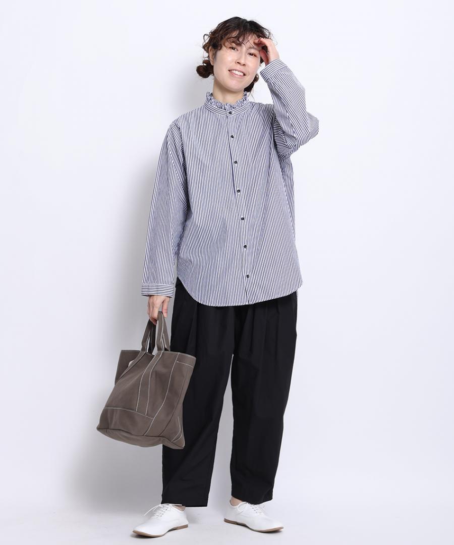 BLACK/ストライプクロス&ブロードクロス フリル衿ブラウス