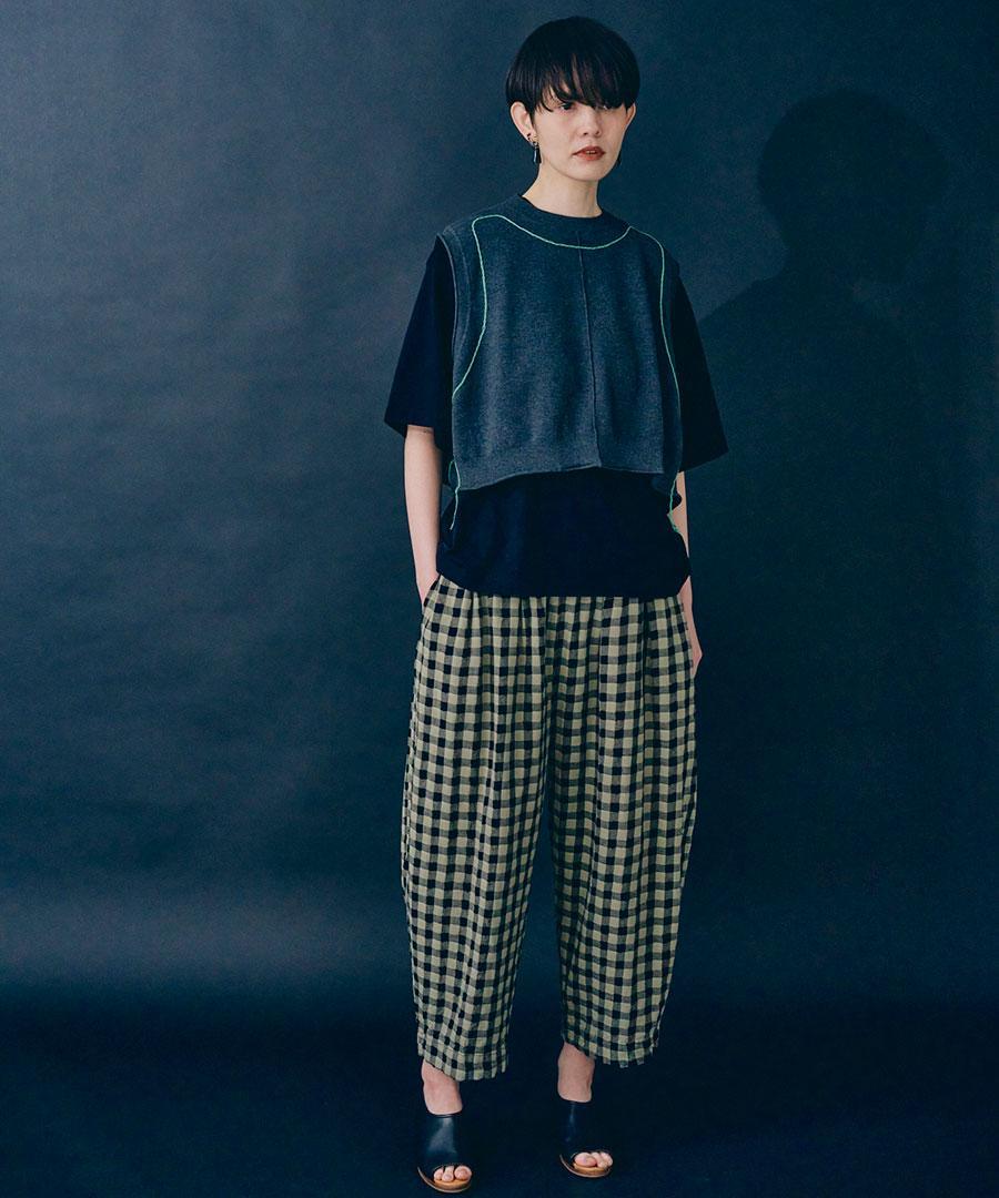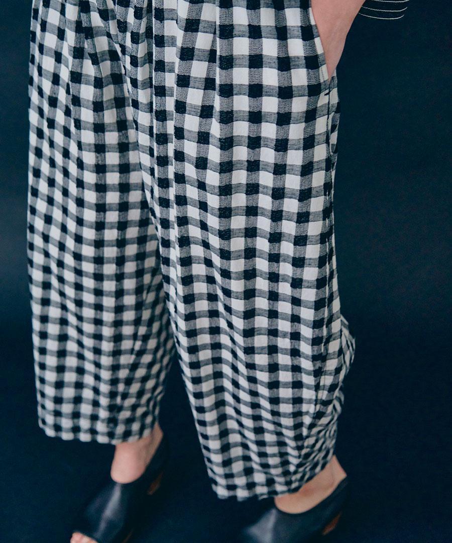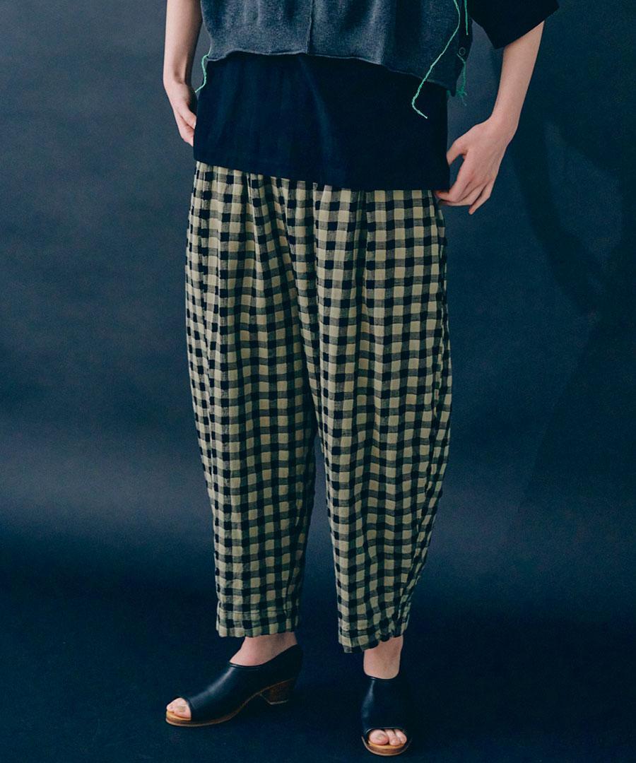 軽やかな綿麻素材のメッシュギンガムチェックパンツ。