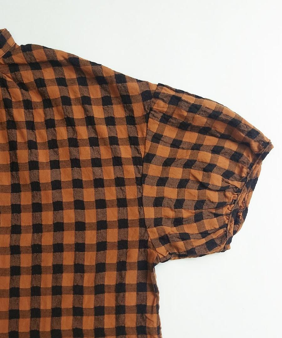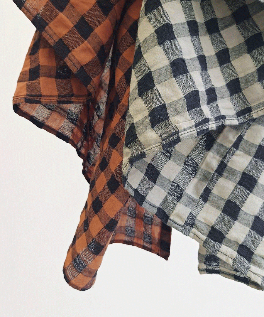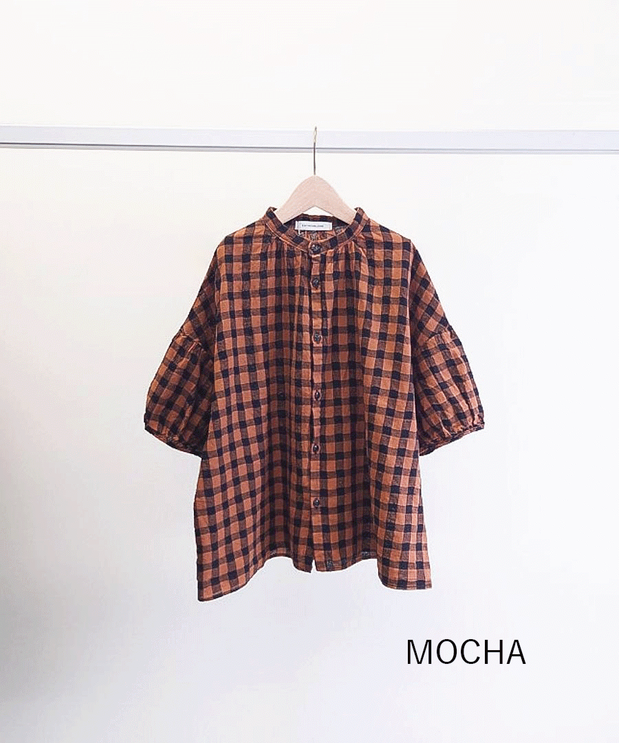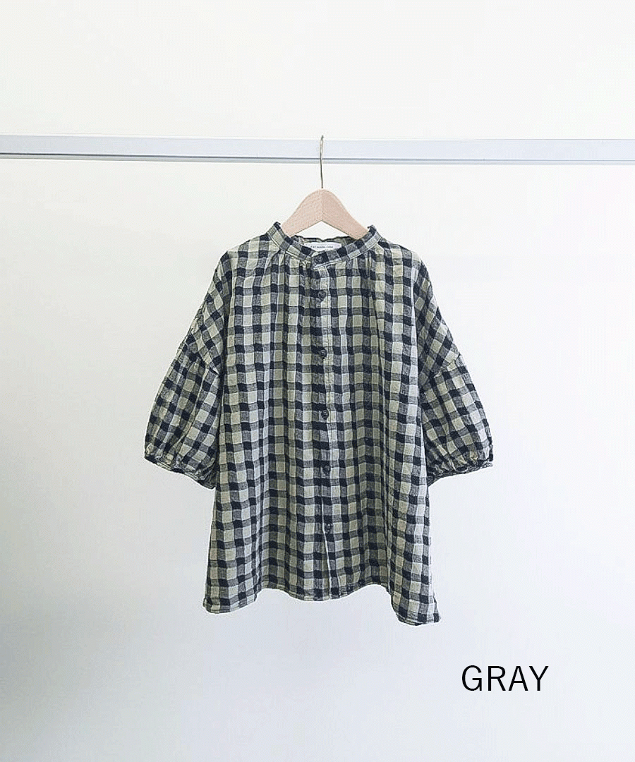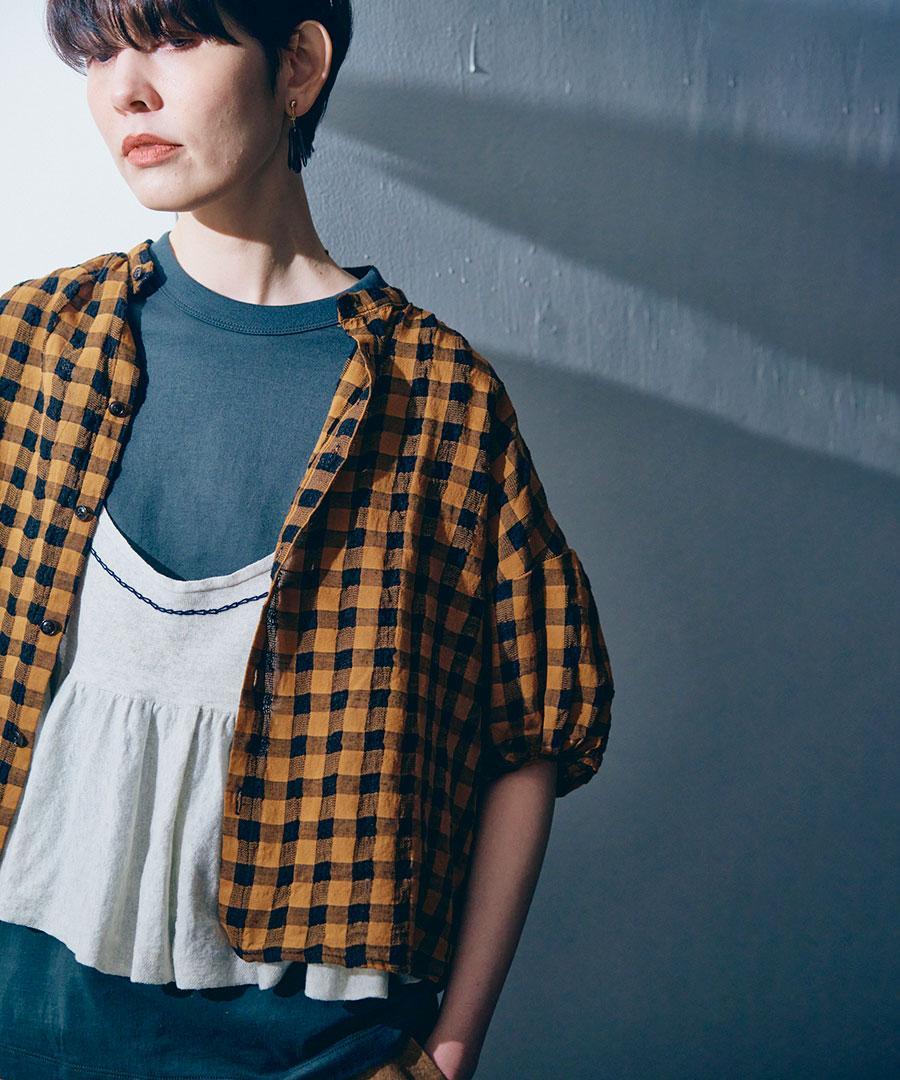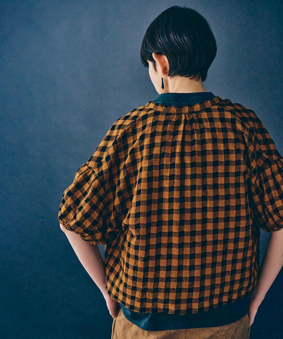 綿麻素材のメッシュギンガムチェックブラウス。