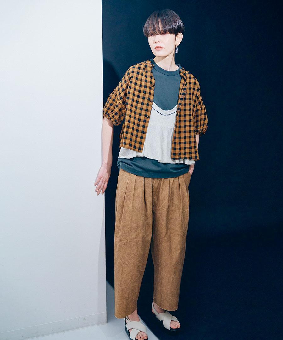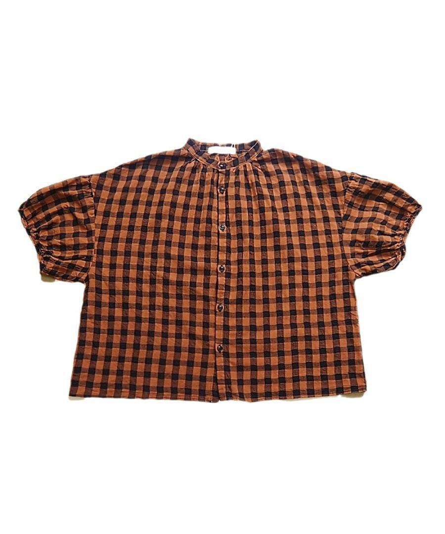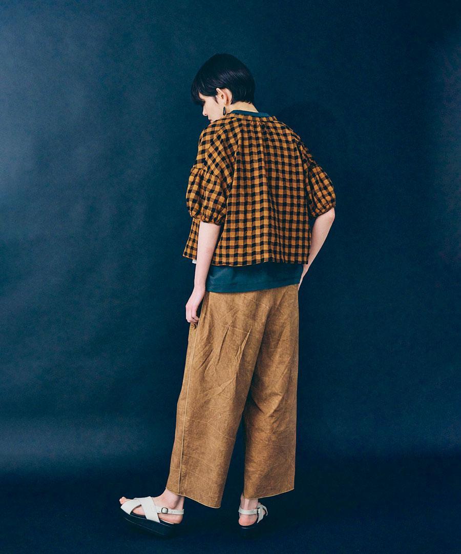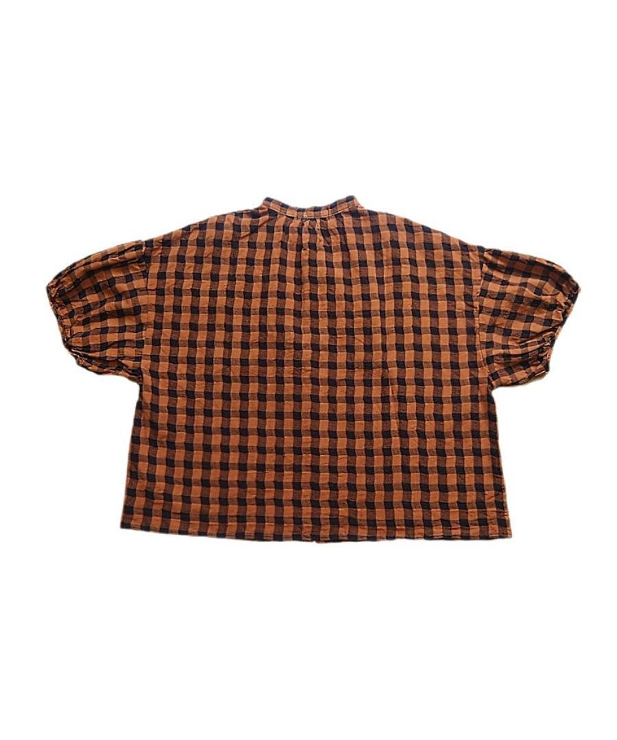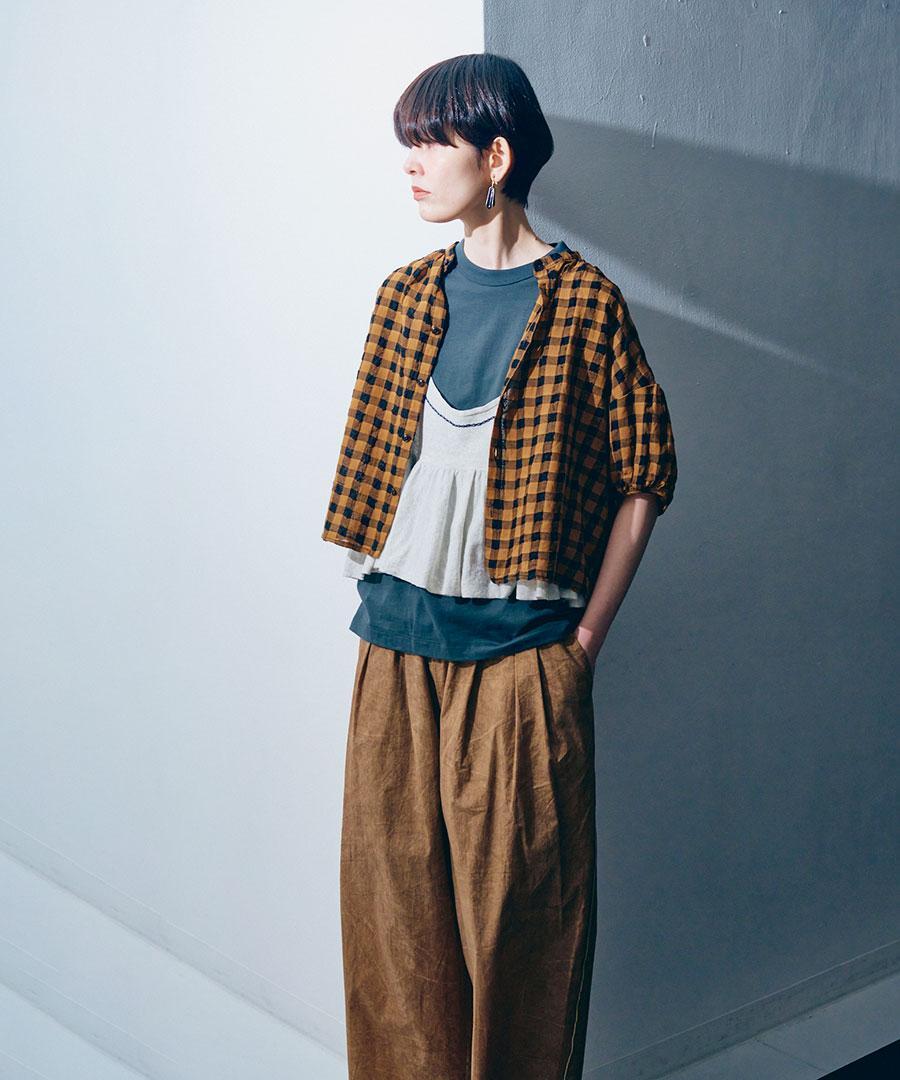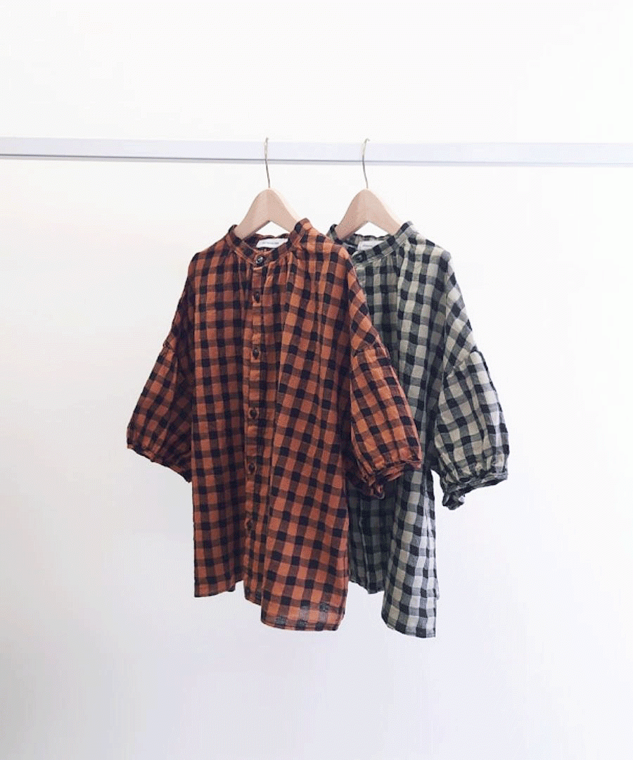 綿麻素材のメッシュギンガムチェックブラウス。