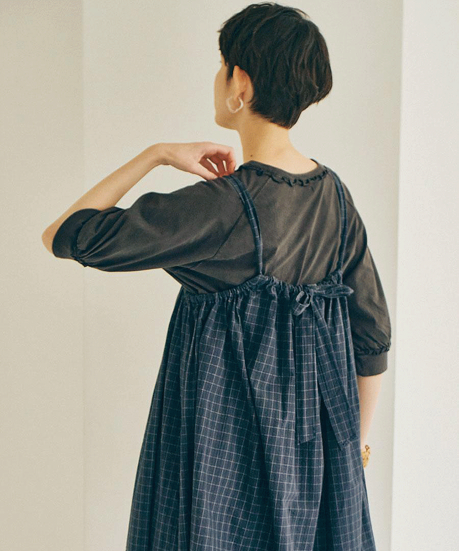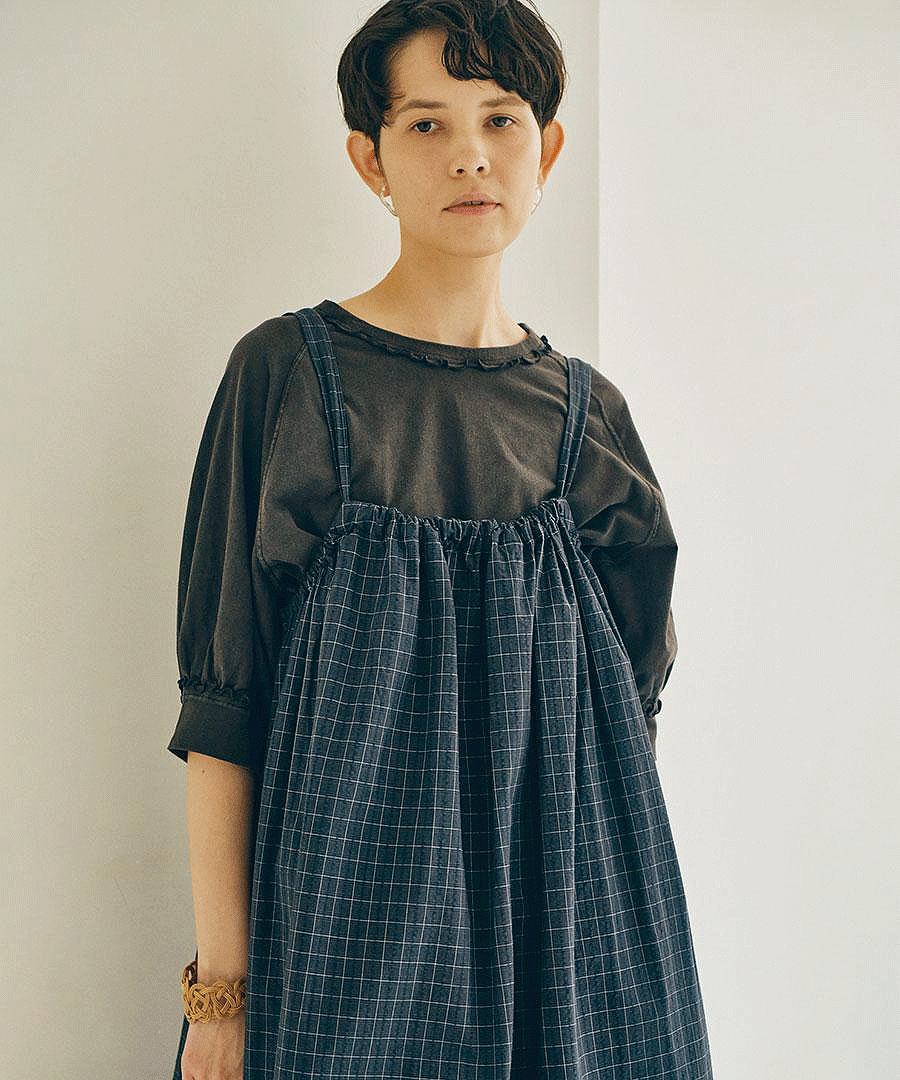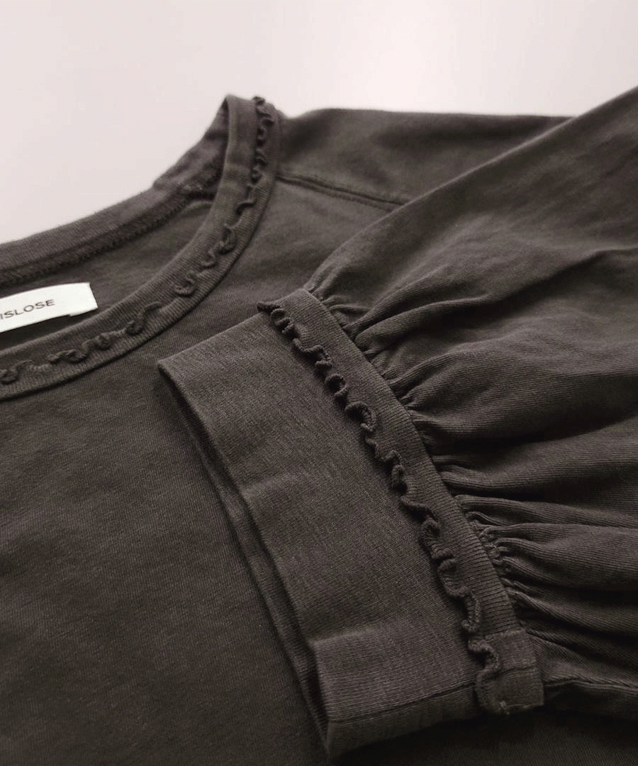 首まわりと袖口のフリルのようなメロウ仕上げがポイントで