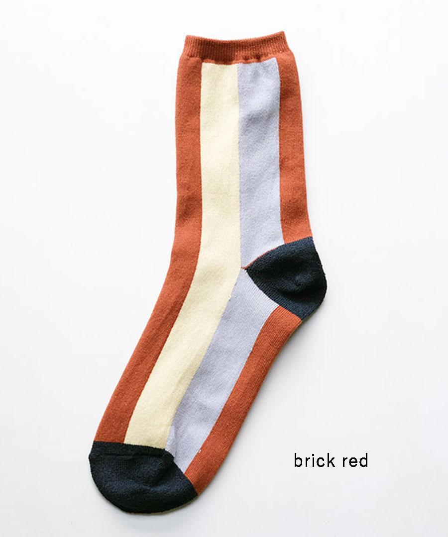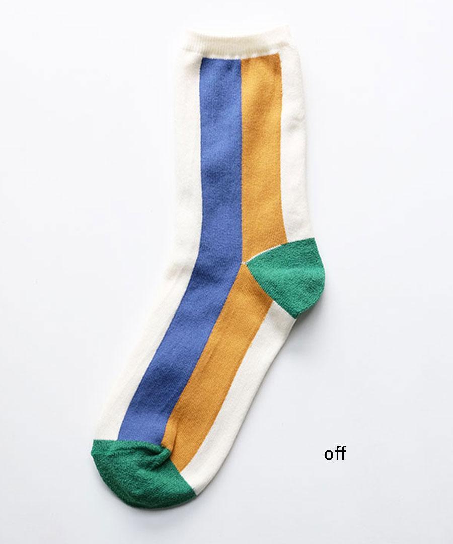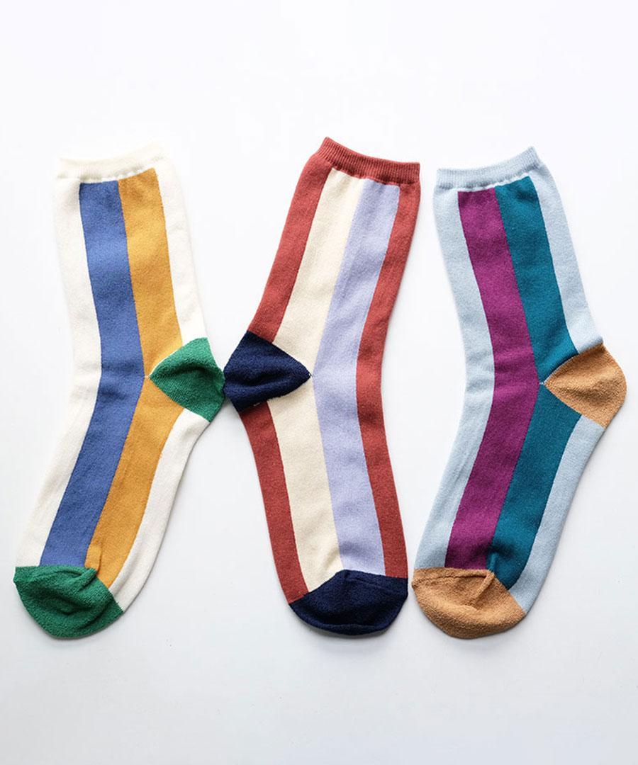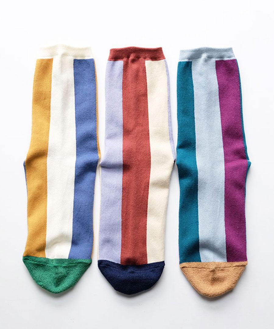 秋の木立や道、葉っぱや空の色をストライプに切り取った すっきりとした靴下。