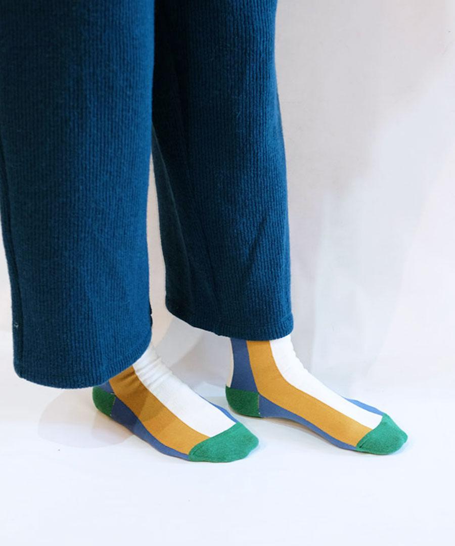 コットンベースにかかとつま先はブークレ糸で、質感の異なる配色にしています。