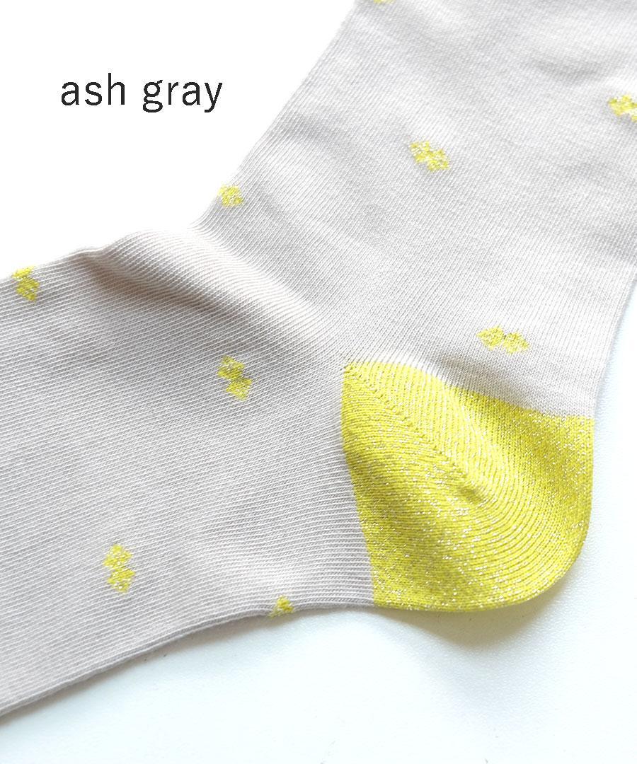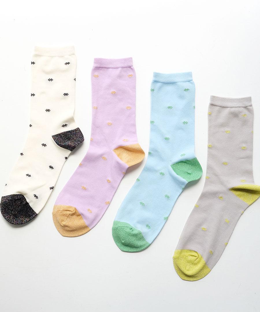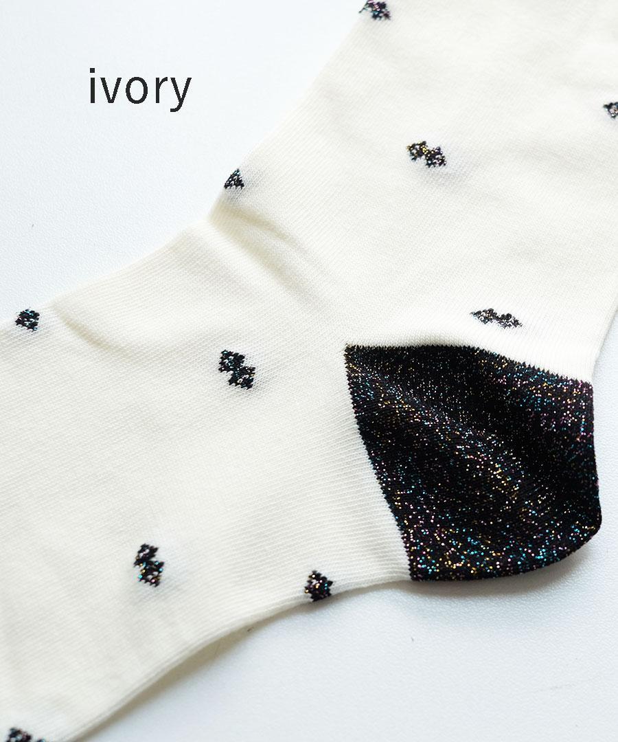 強撚のコットンをベースに、伸縮性のあるラメ糸で柄をちりばめた靴下。