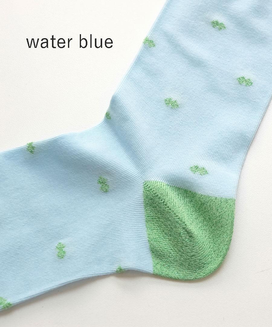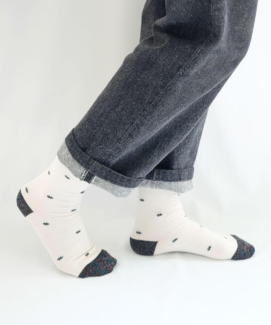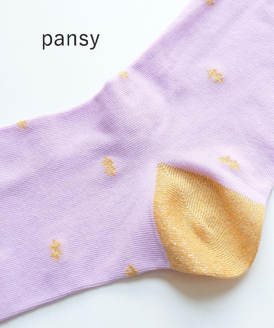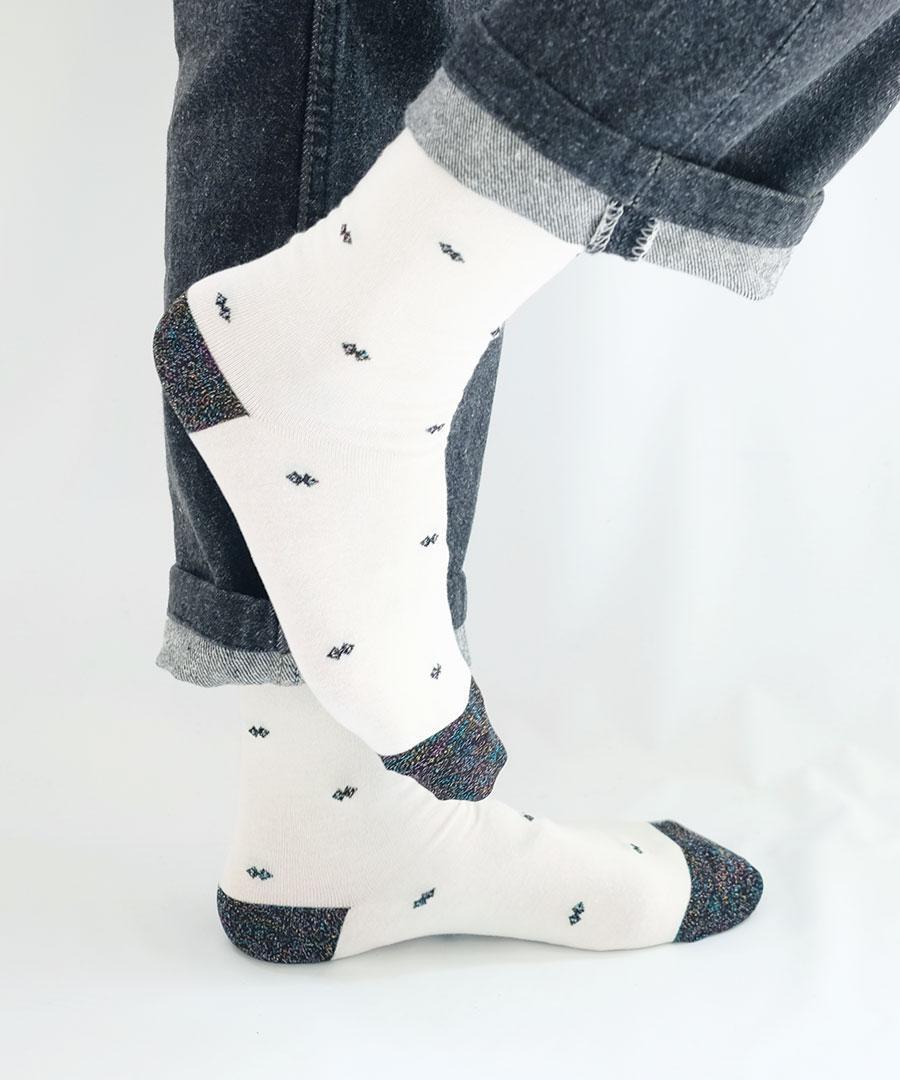 強撚のコットンをベースに、伸縮性のあるラメ糸で柄をちりばめた靴下。