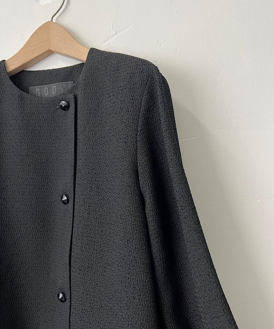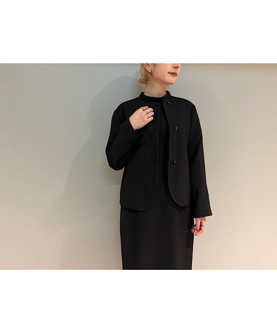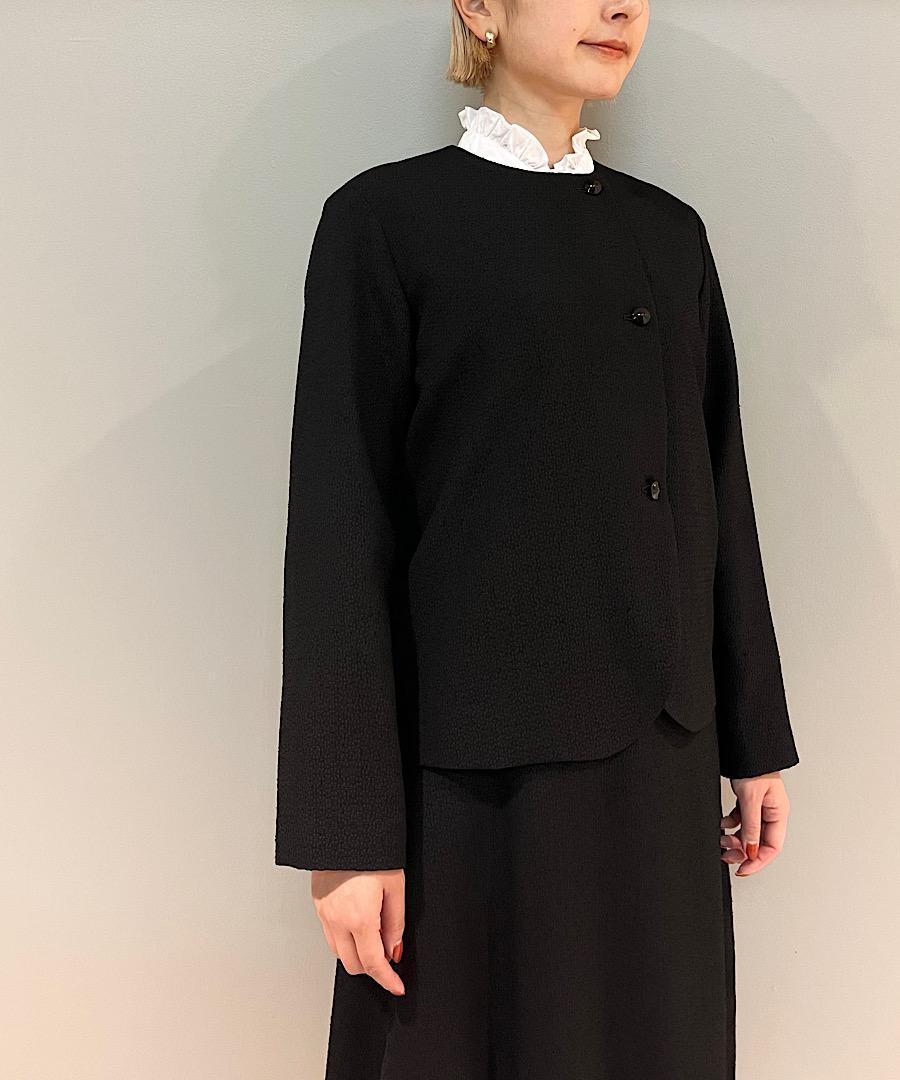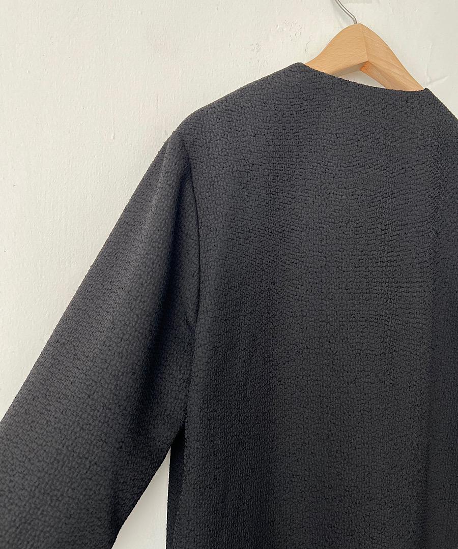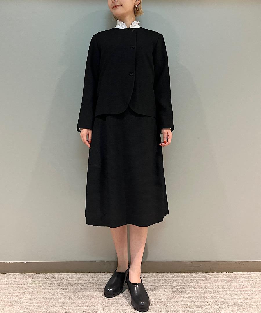 シンプルながらも、前合わせの位置やボタンが控えめなポイントに。