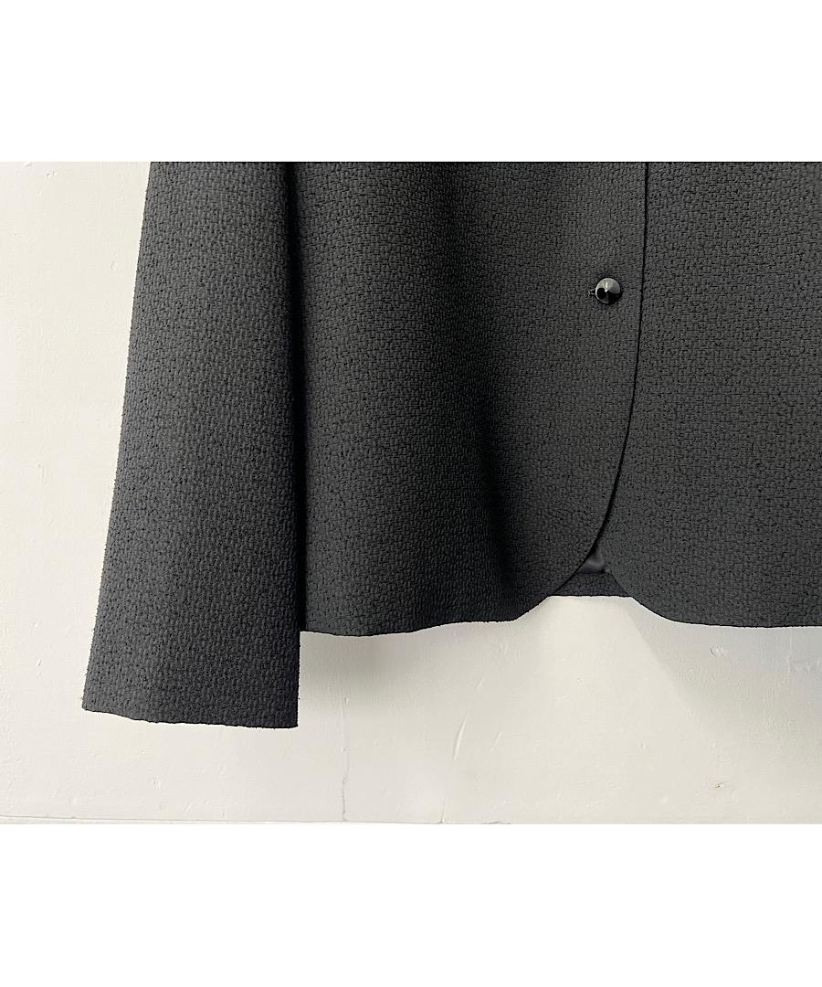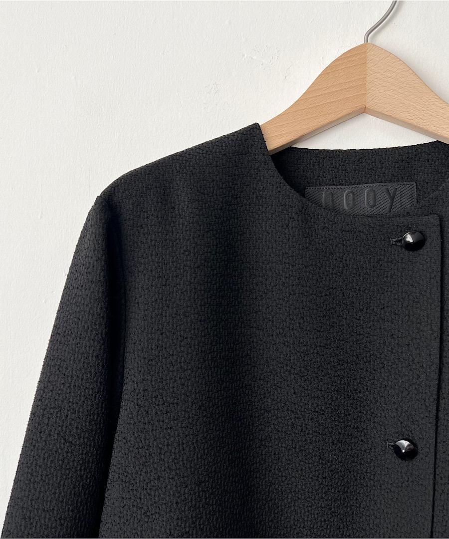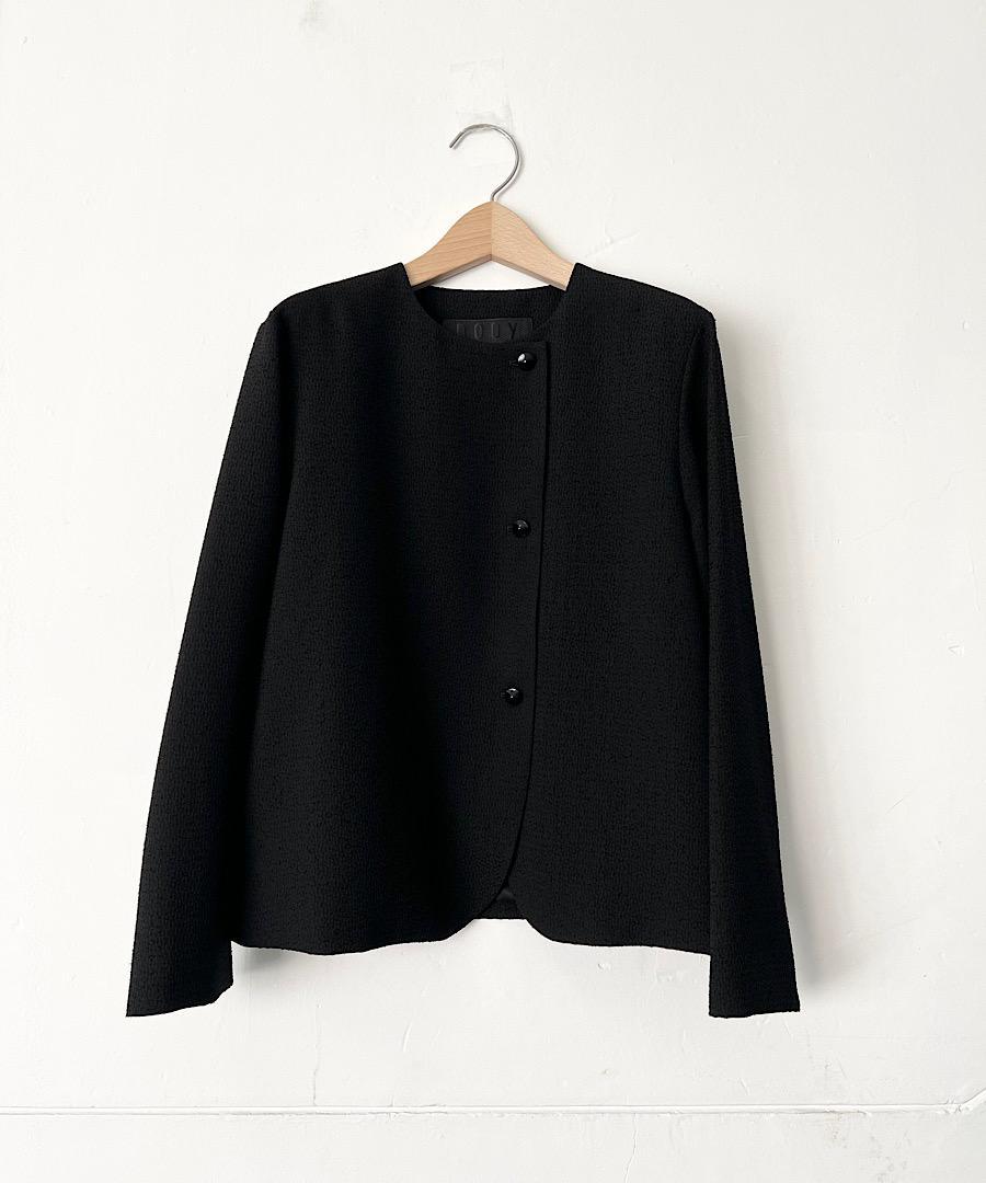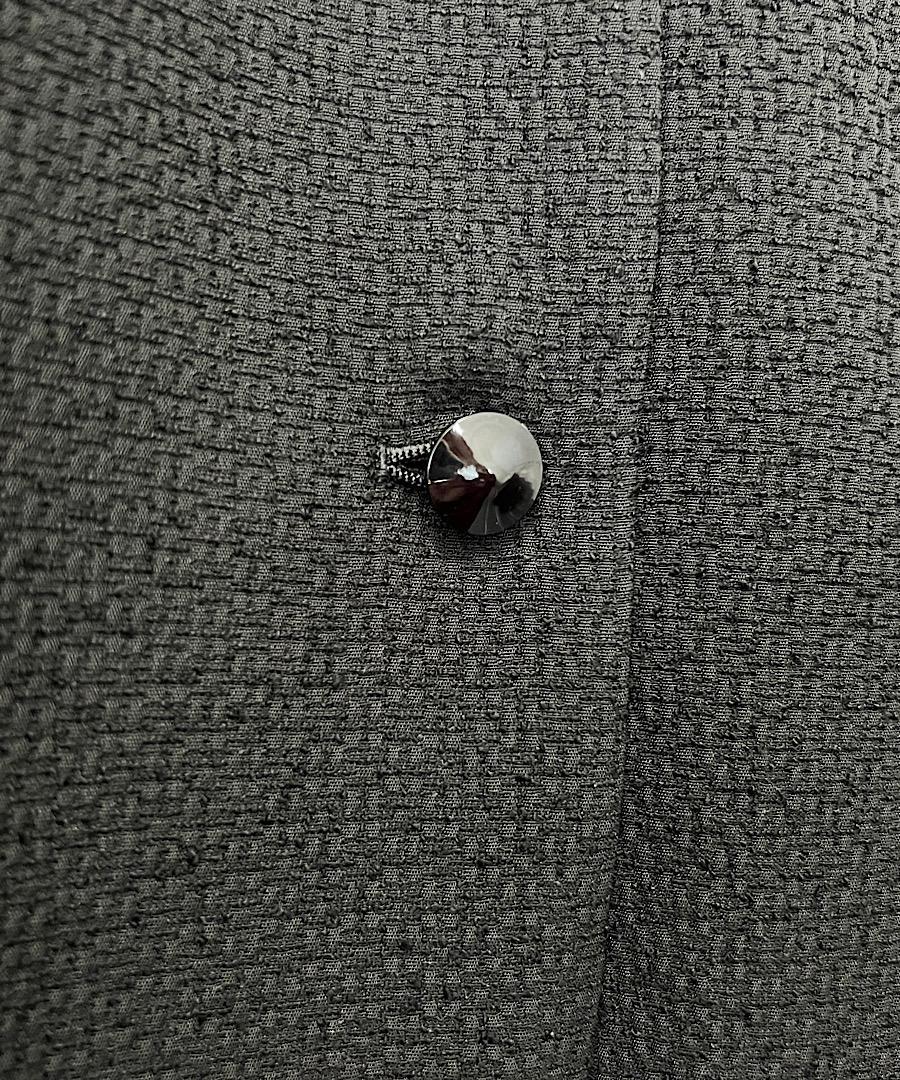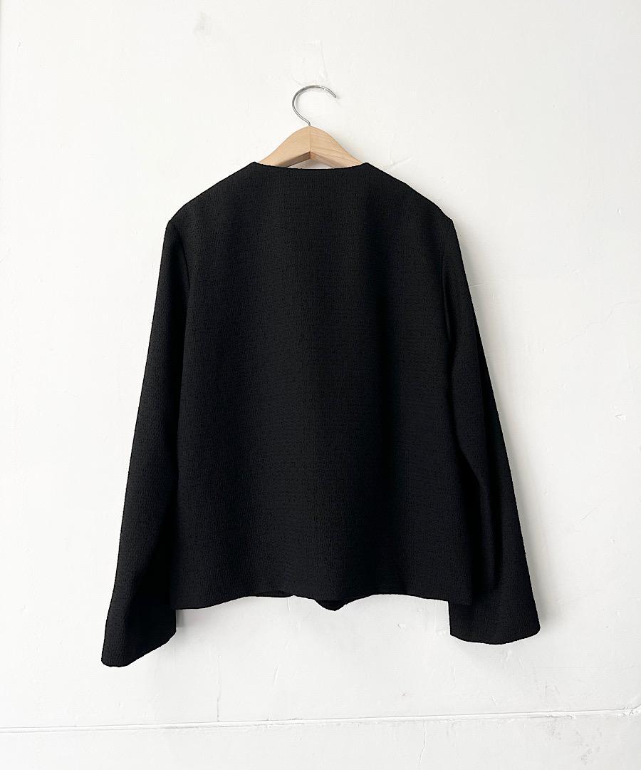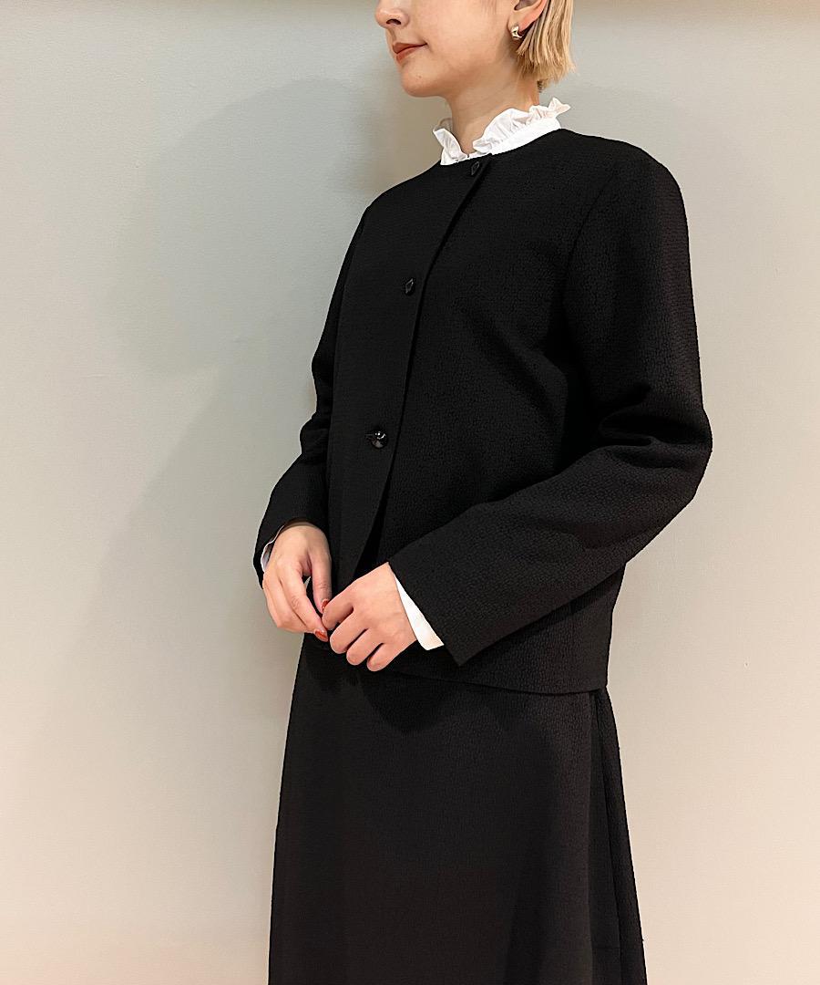 シンプルながらも、前合わせの位置やボタンが控えめなポイントに。