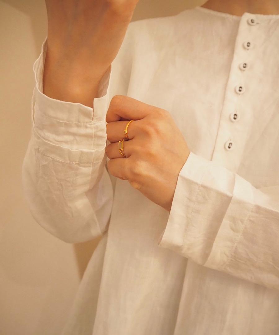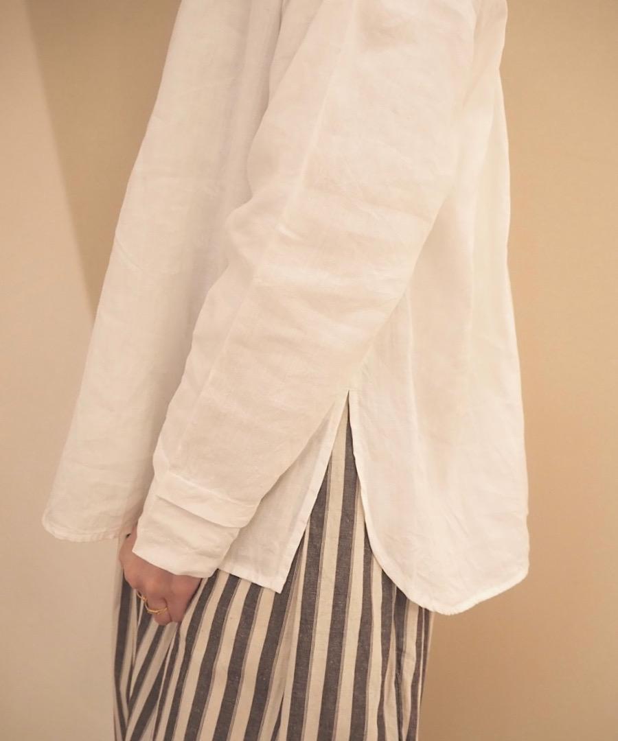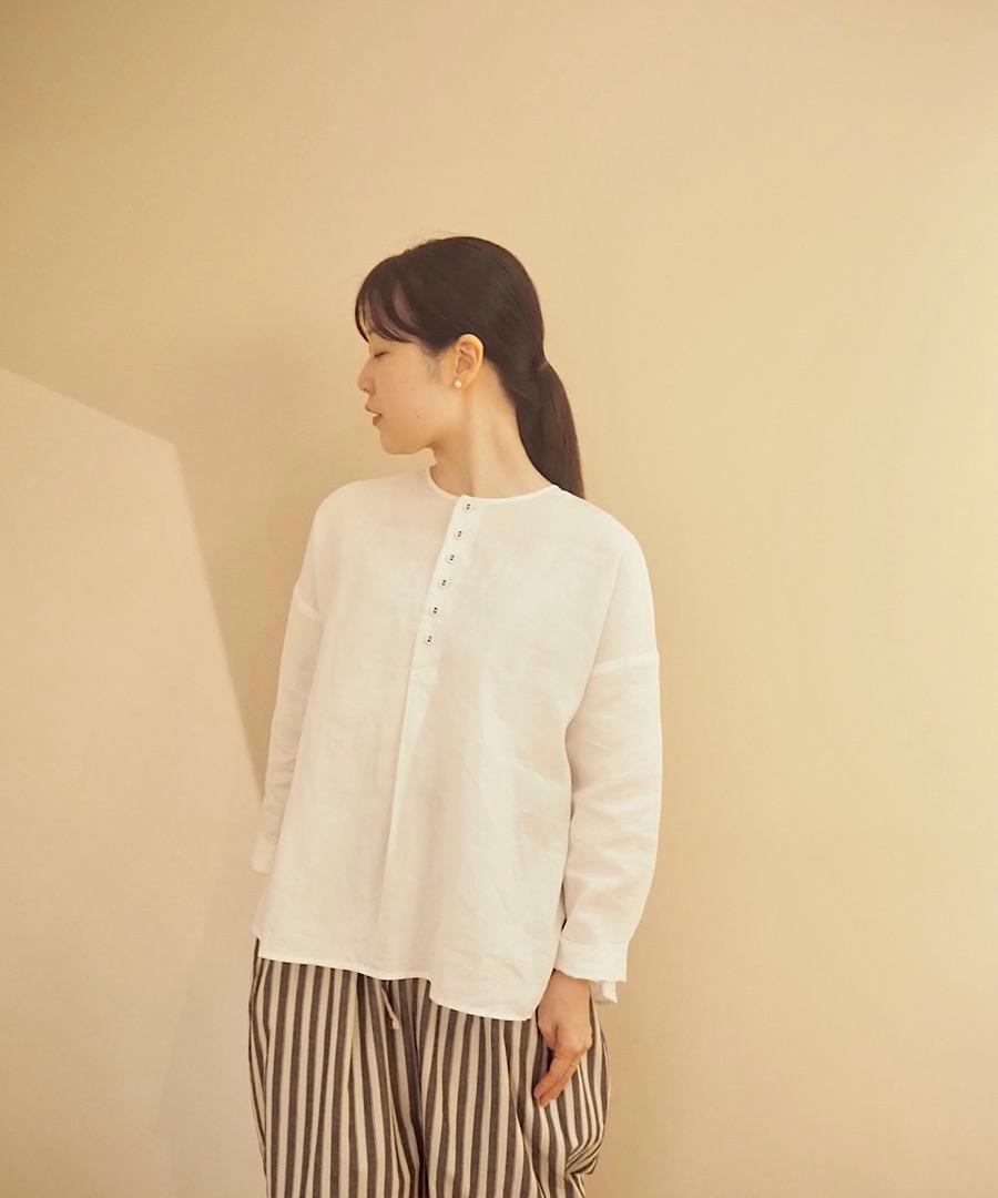 ノーカラーのシンプルなブラウスは、オールマイティに使える万能な1枚。