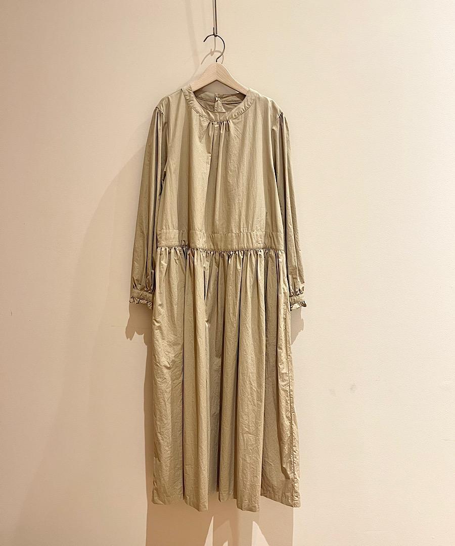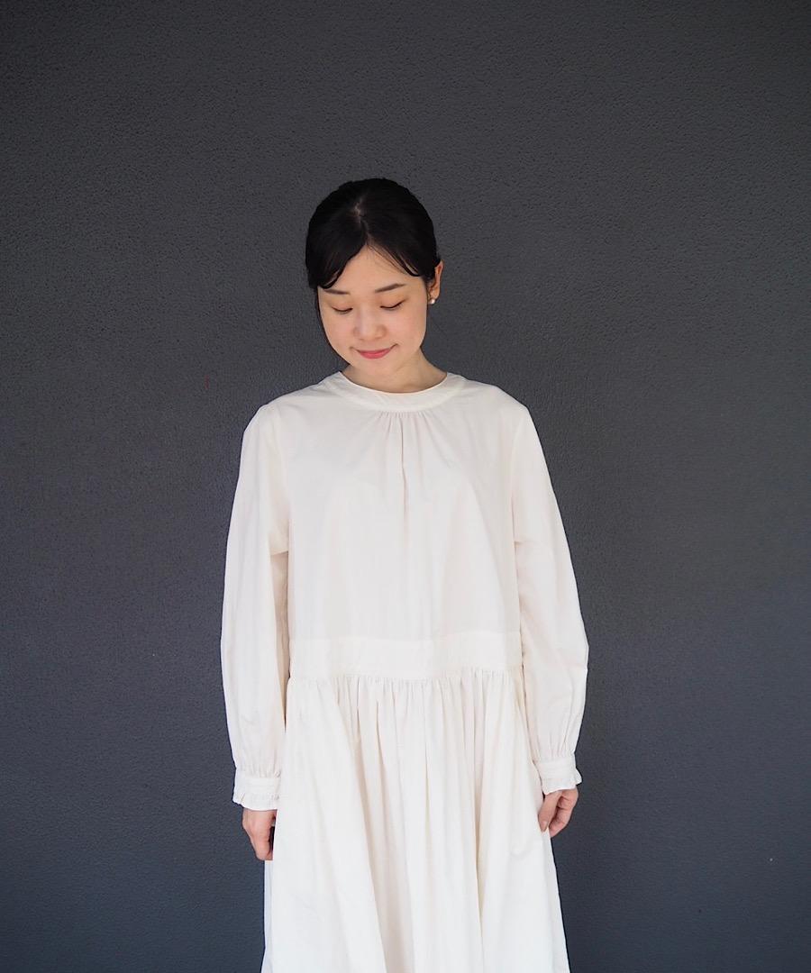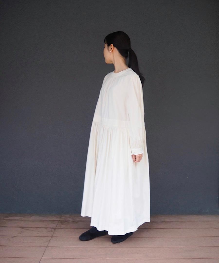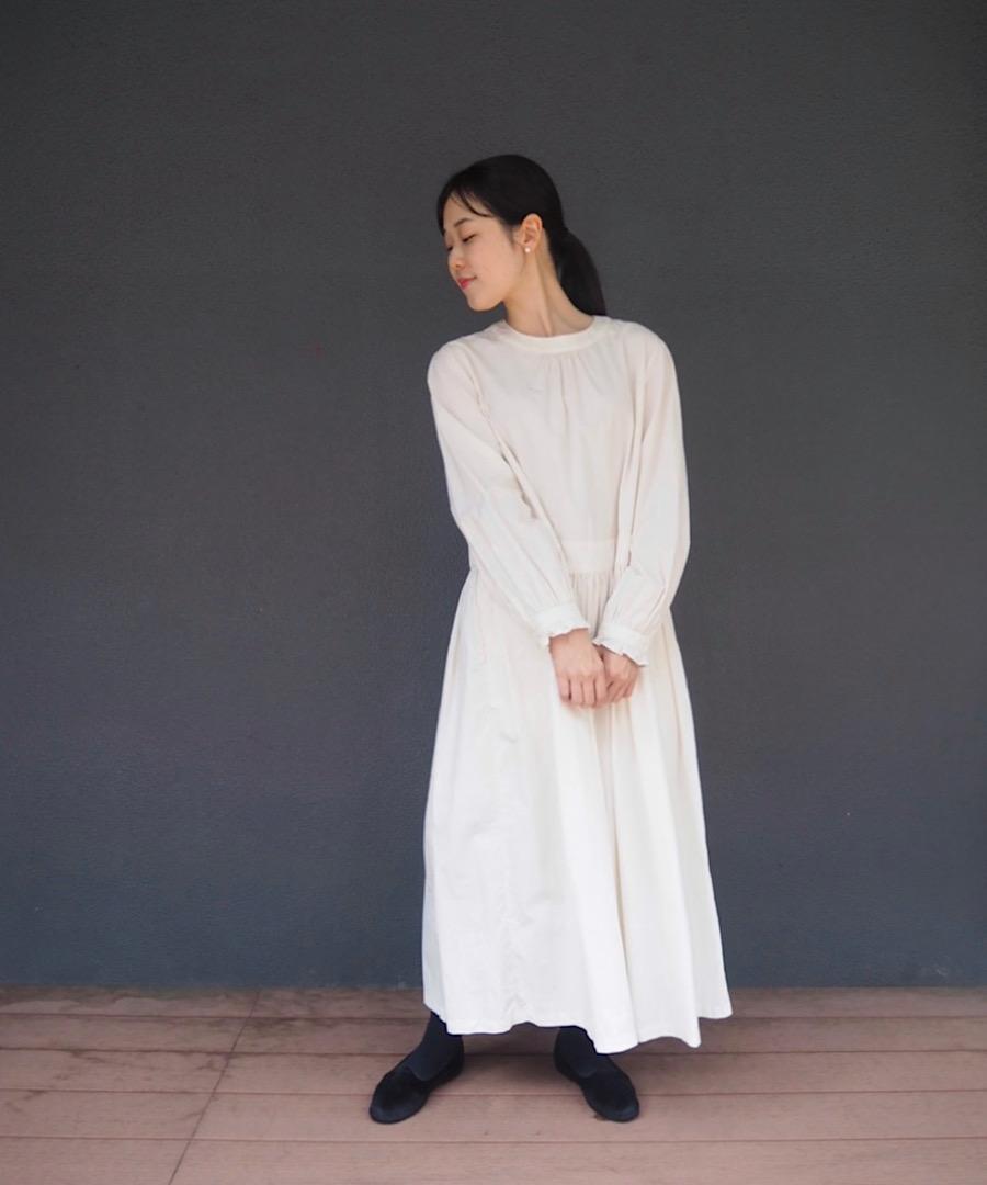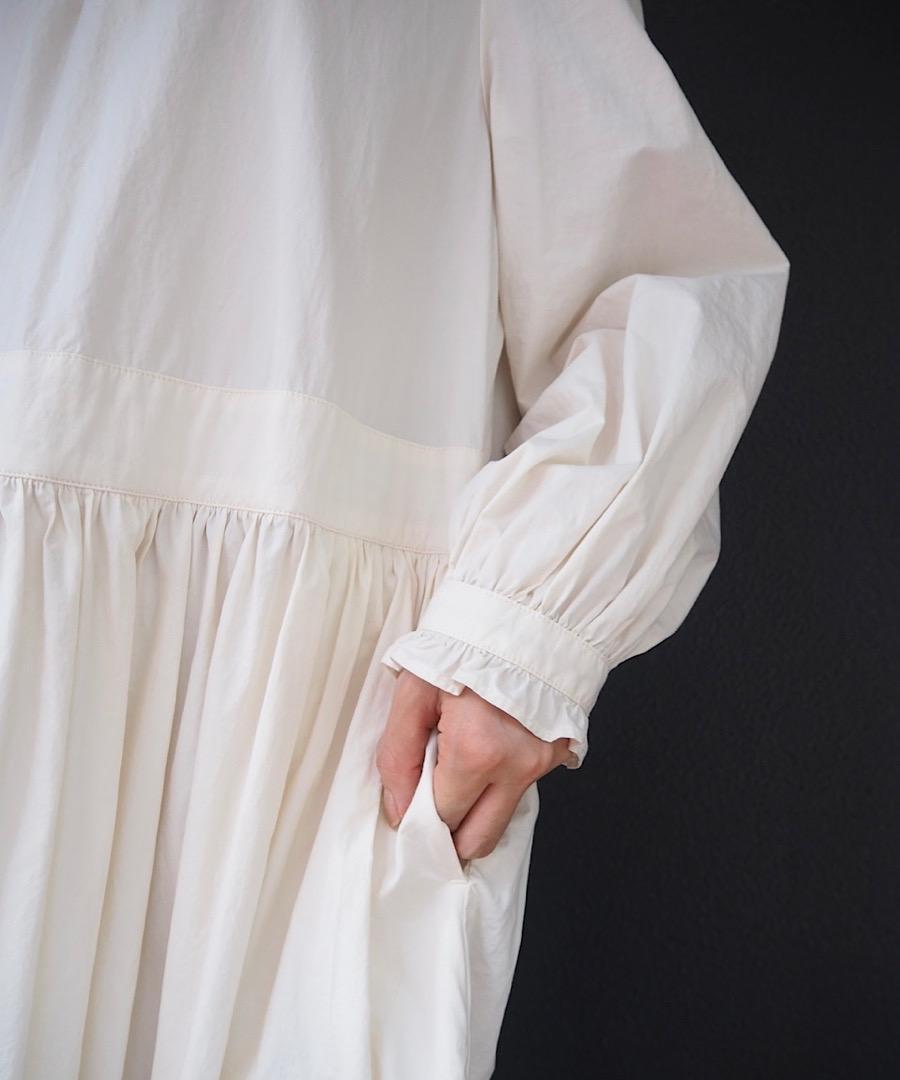 首元にはポイントに少しのギャザー、ウエストにはたっぷりのギャザー、袖口には小さなフリル、とこだわりがギュツと詰まっています。
