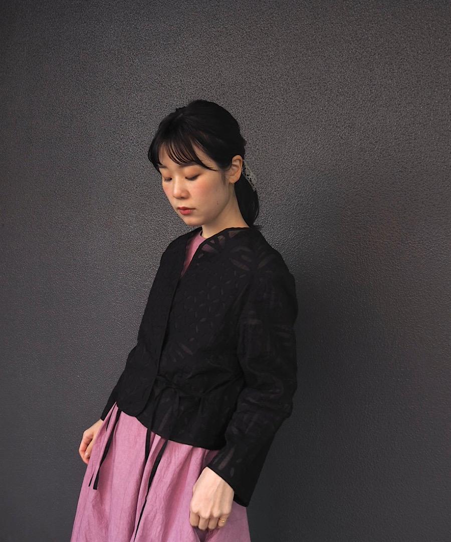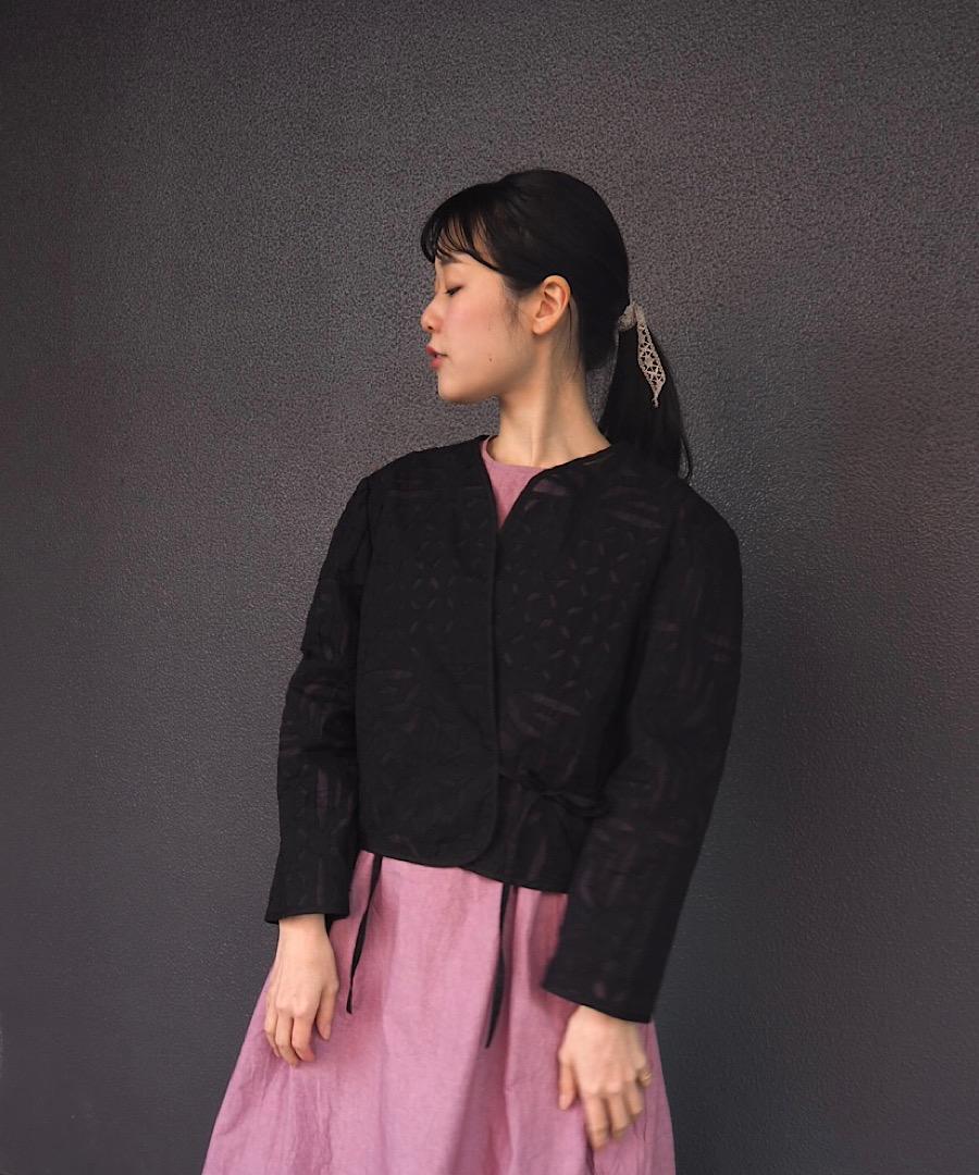 インドで作られたリバースアップリケの生地を使用した、カシュクールタイプのショートジャケットです。
