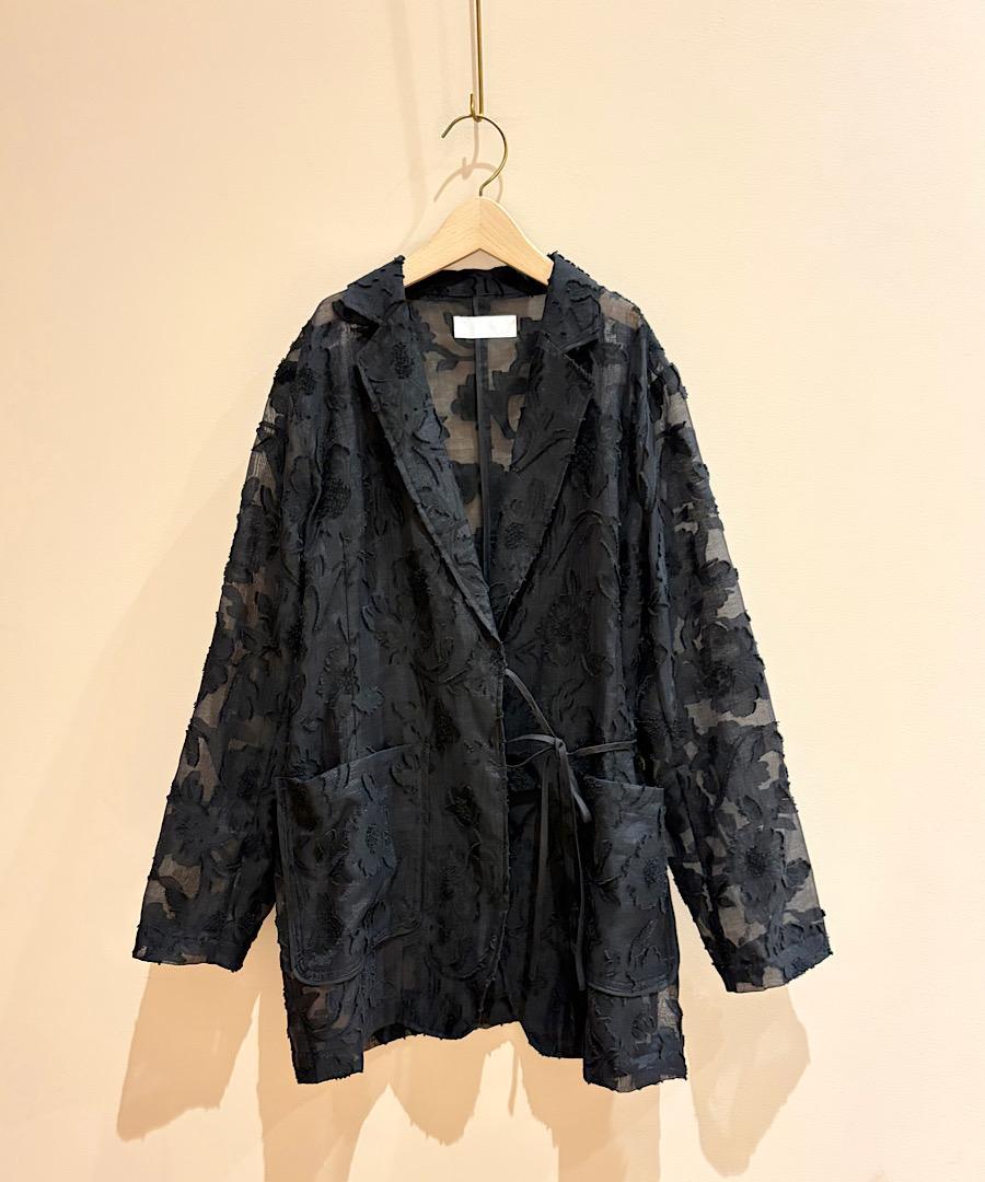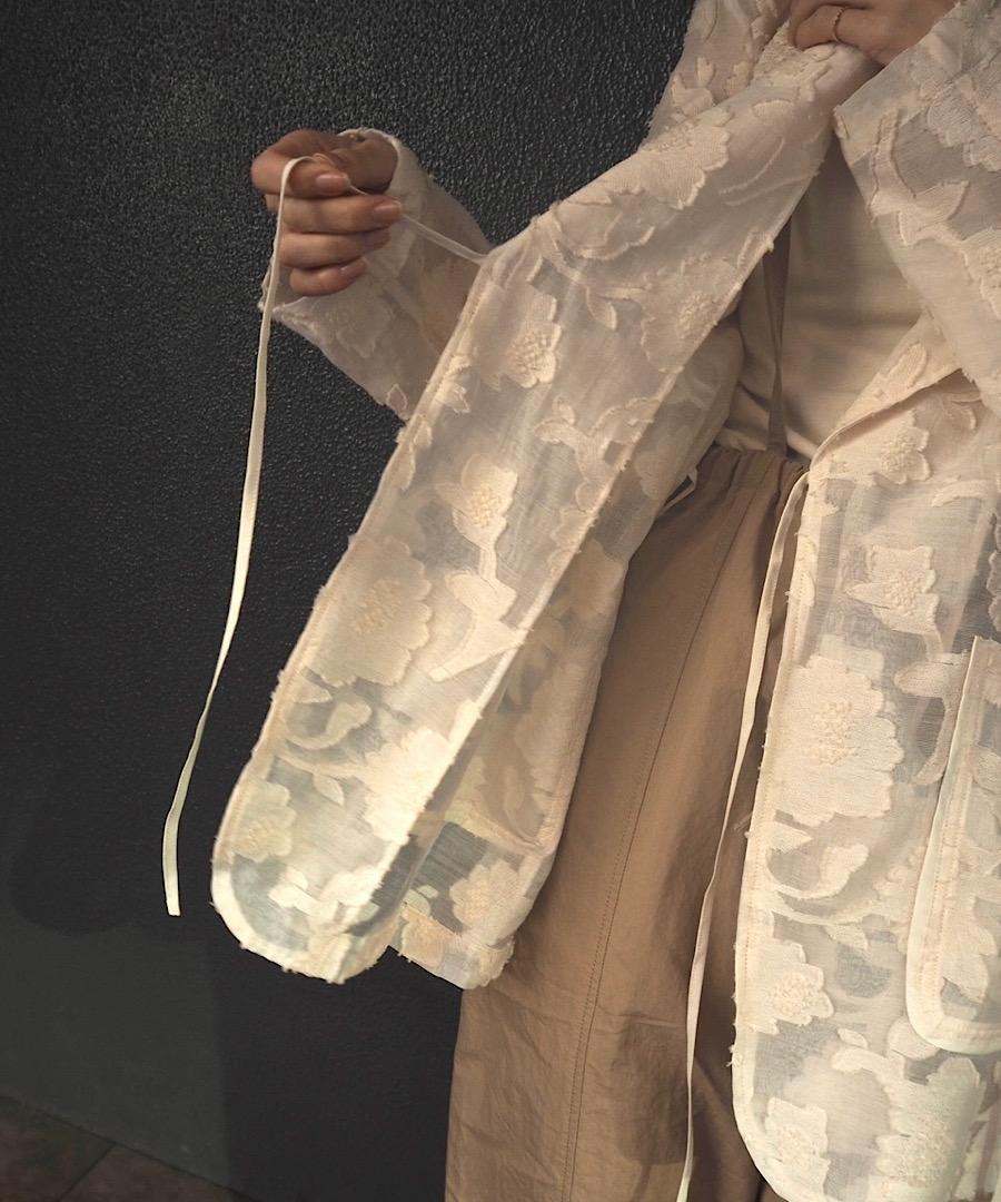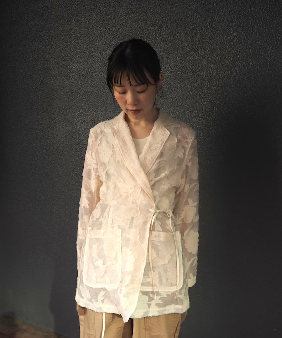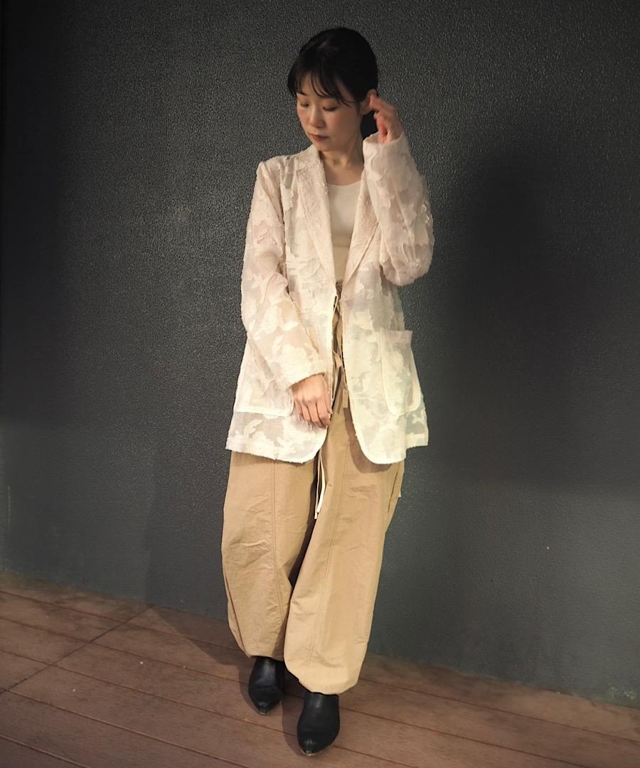 マニッシュなテーラードジャケットをリボンで結ぶ仕様にすることにより、フェミニンさもプラスされています。