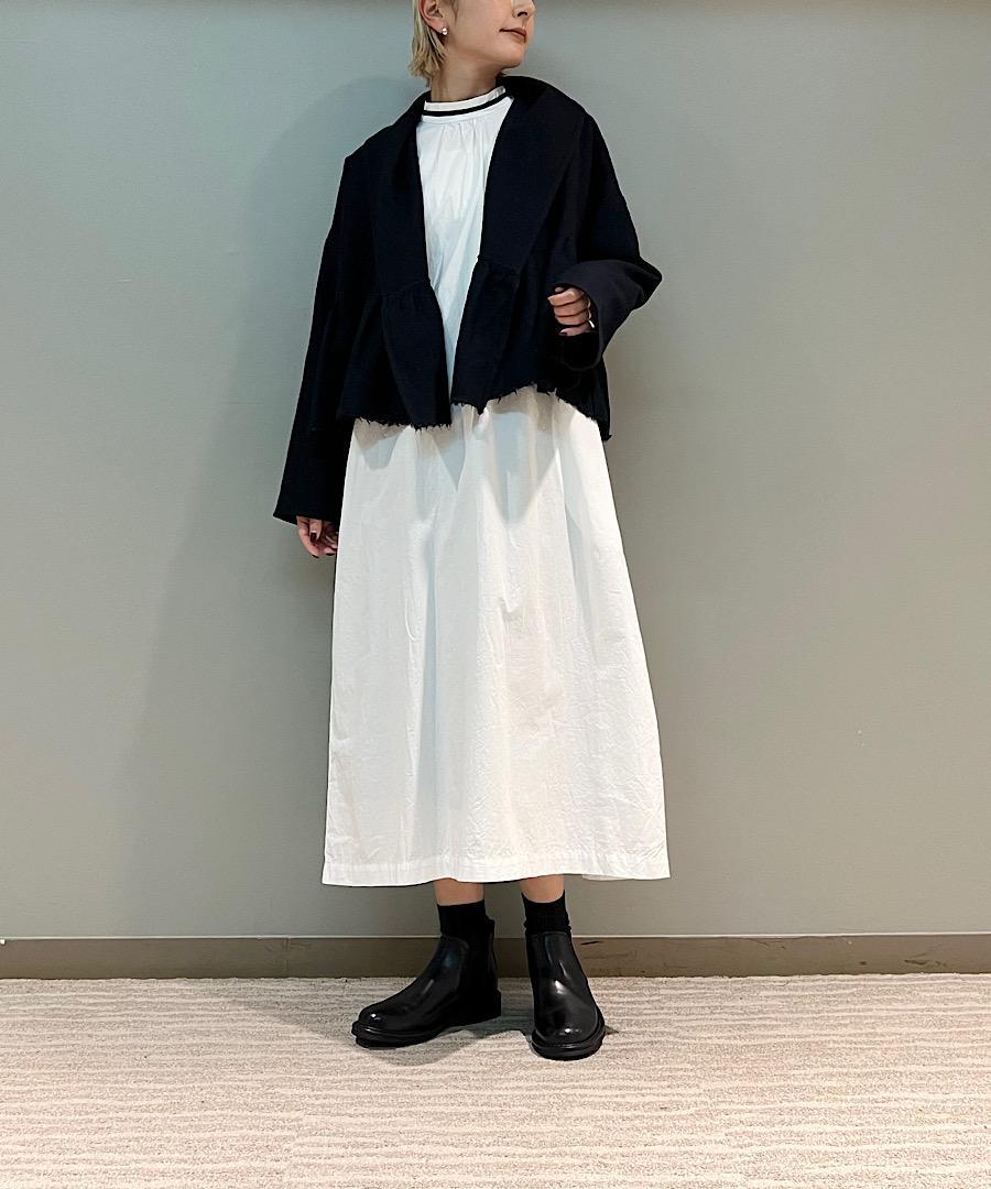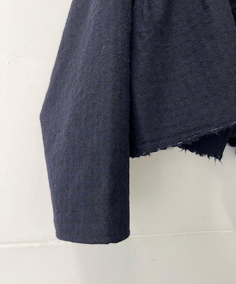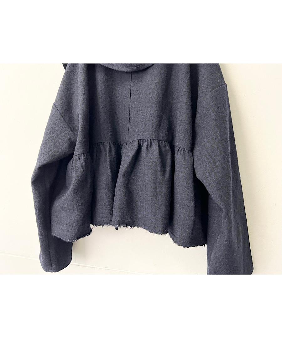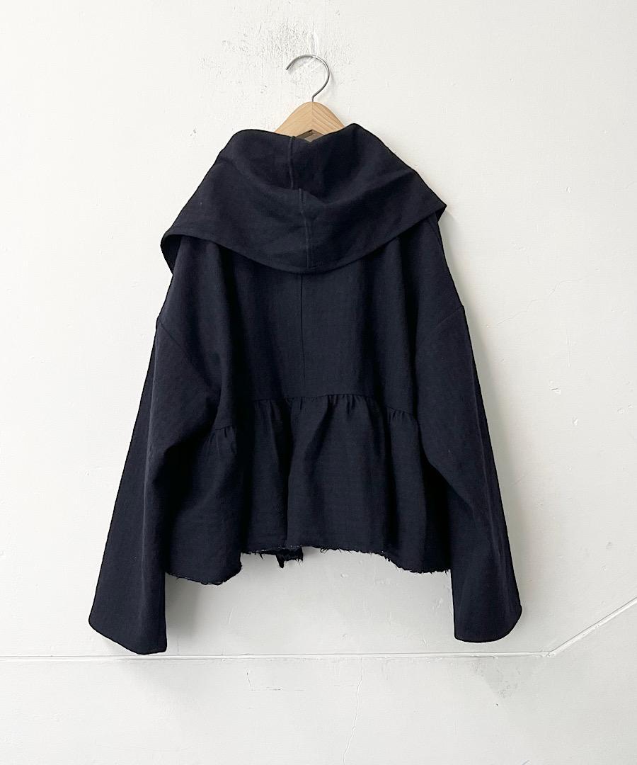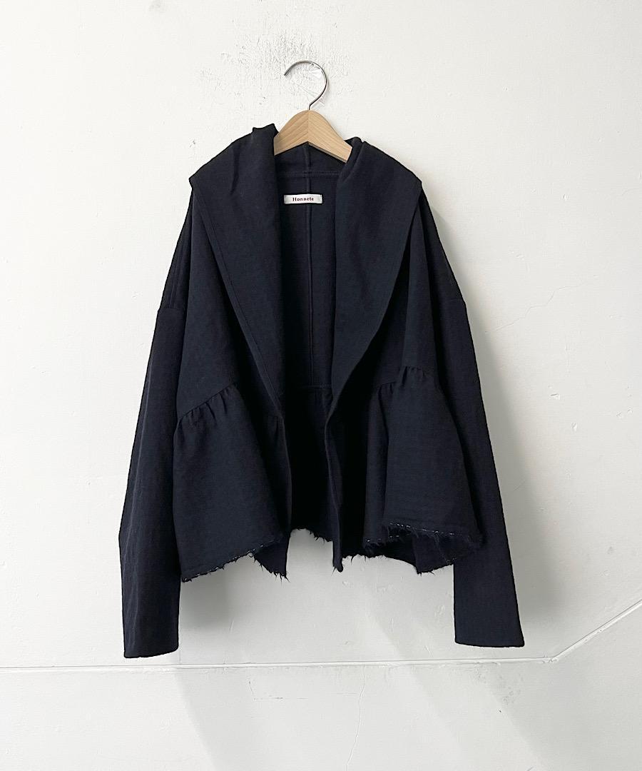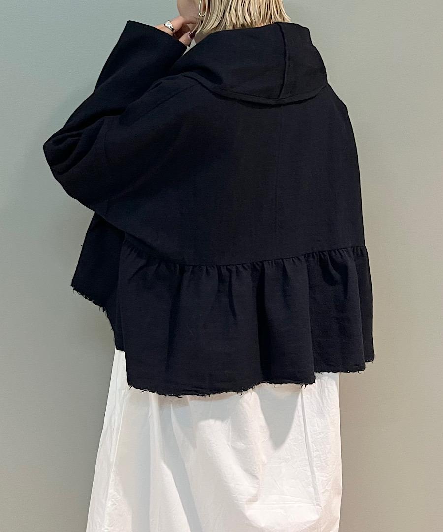 羽織りやすいコンパクトな丈感と、裾の切りっぱなしのデザインがポイントです。