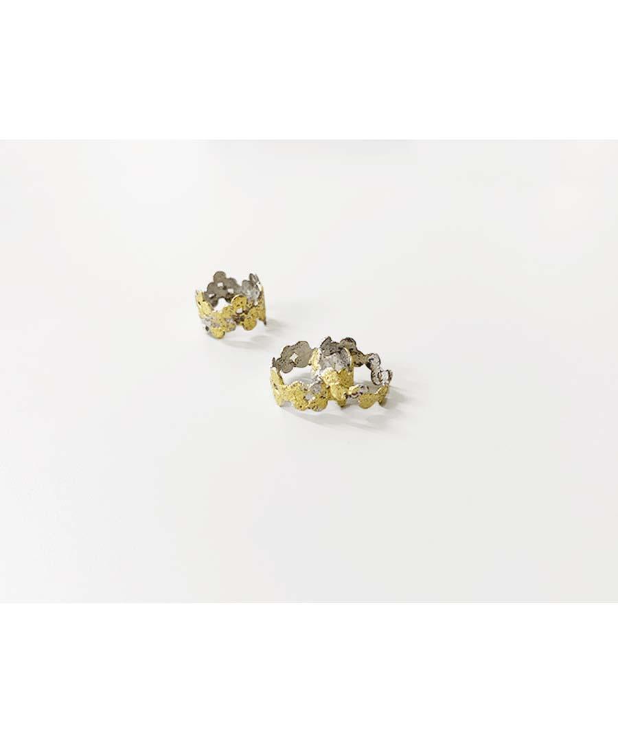 砂浜に長い時間埋もれていた金属のような、荒れたテクスチャーをもったジュエリーは、