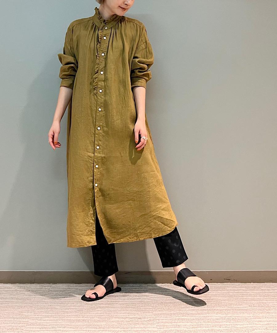 襟からウエストにかけての控えめなフリルが、甘くなりすぎずポイントになっています。