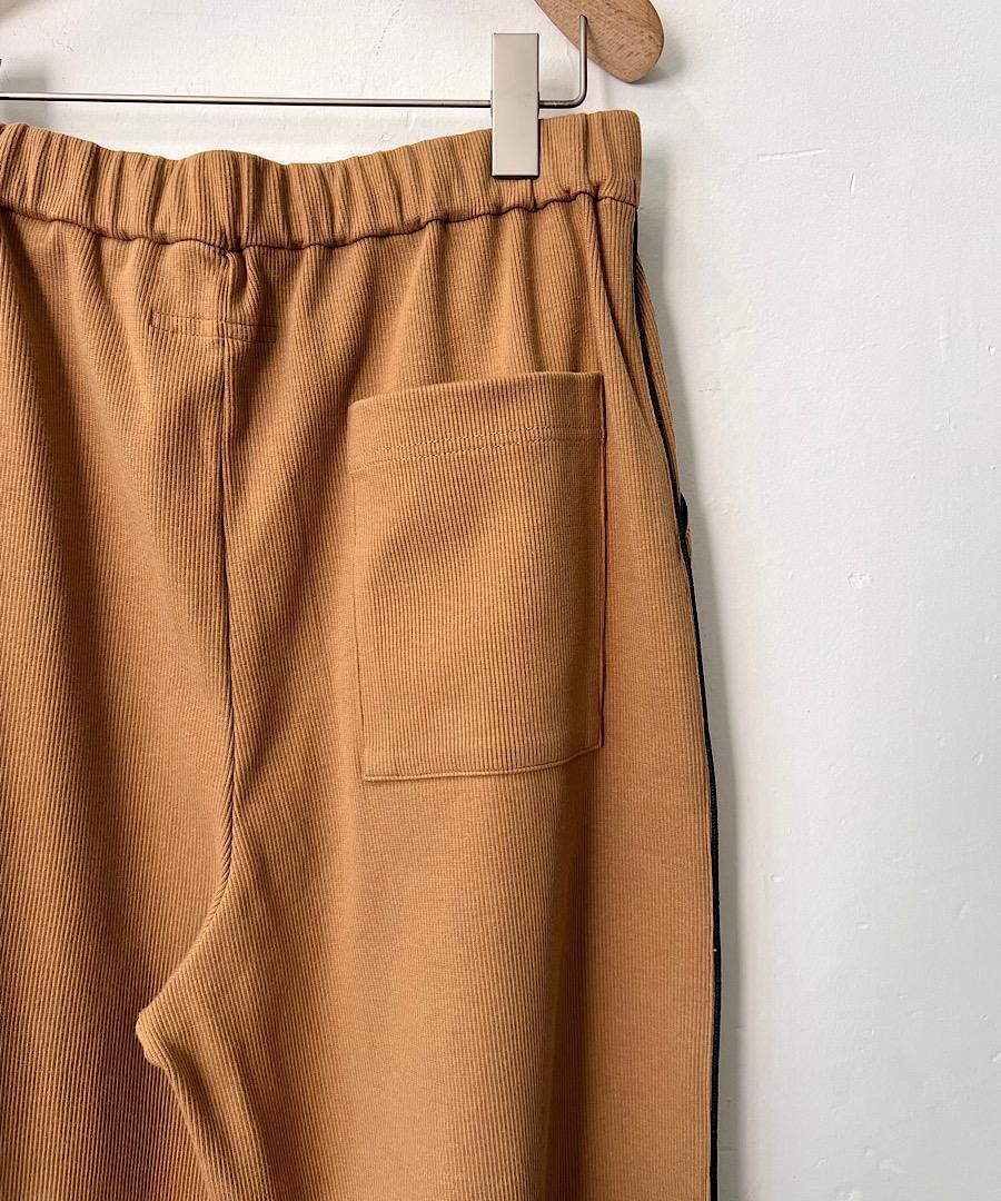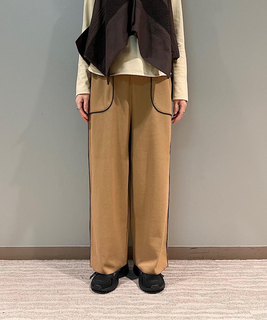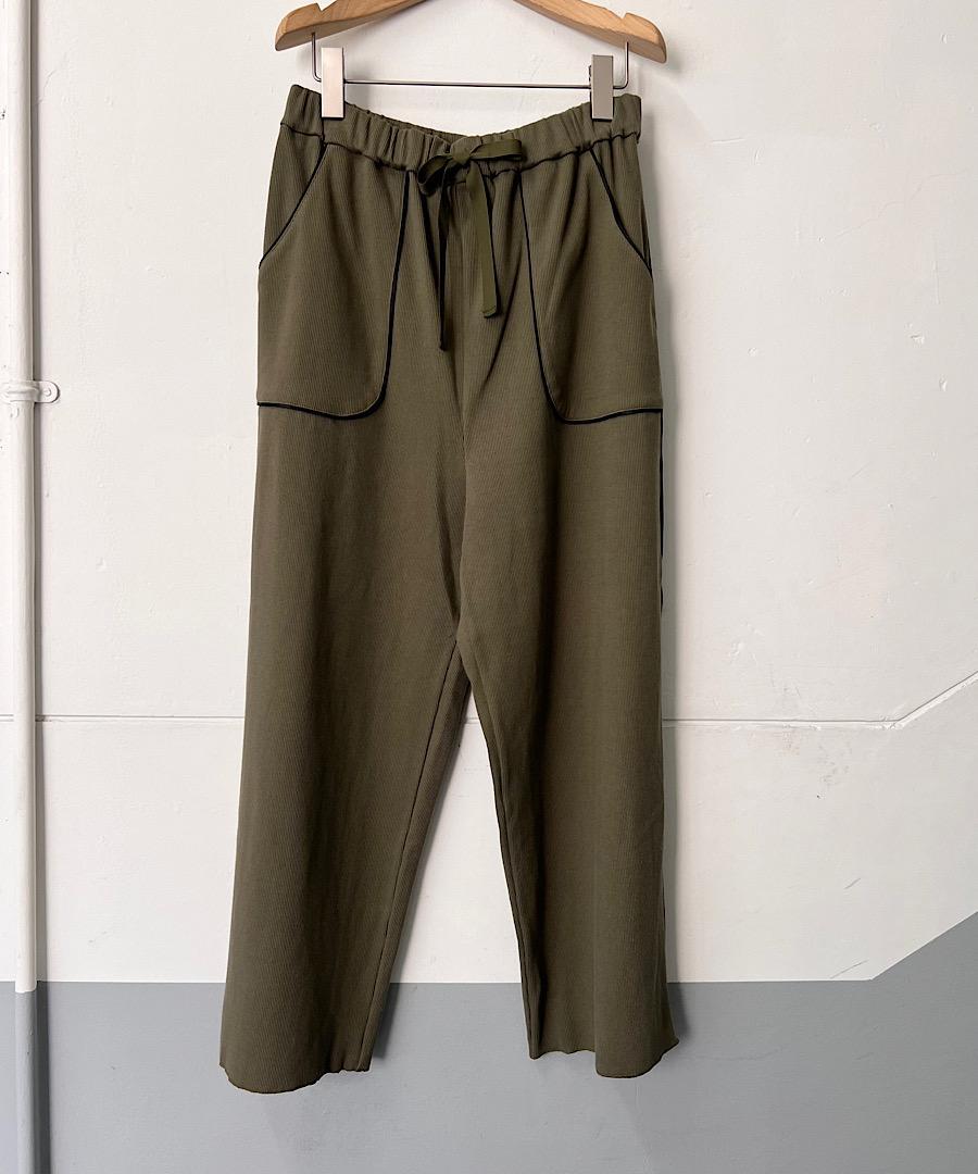 ほどよいテンションのテレコ素材をあてがい大人の女性のイージーパンツに。
