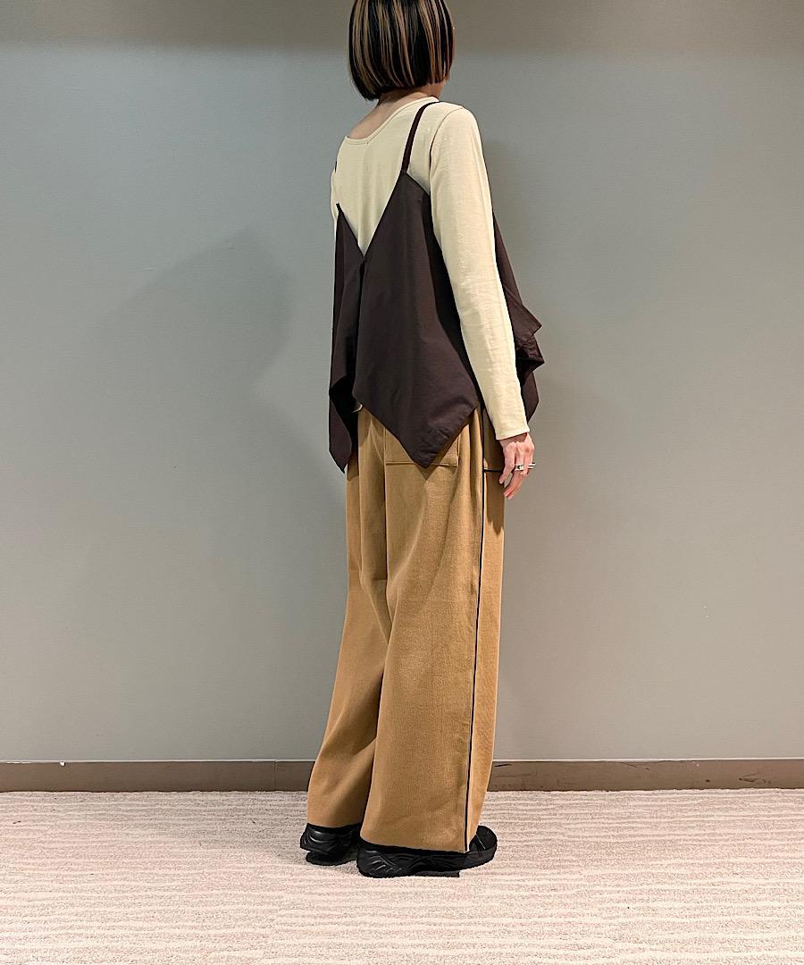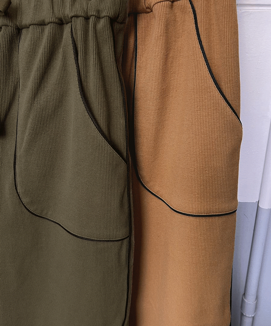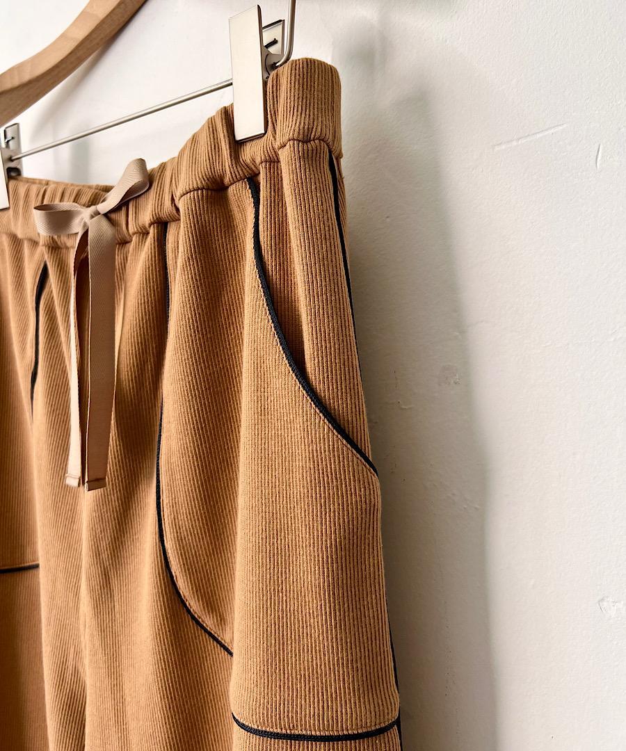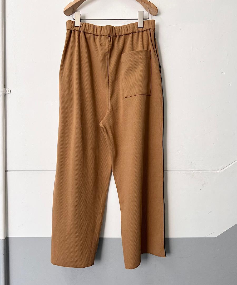 ほどよいテンションのテレコ素材をあてがい大人の女性のイージーパンツに。