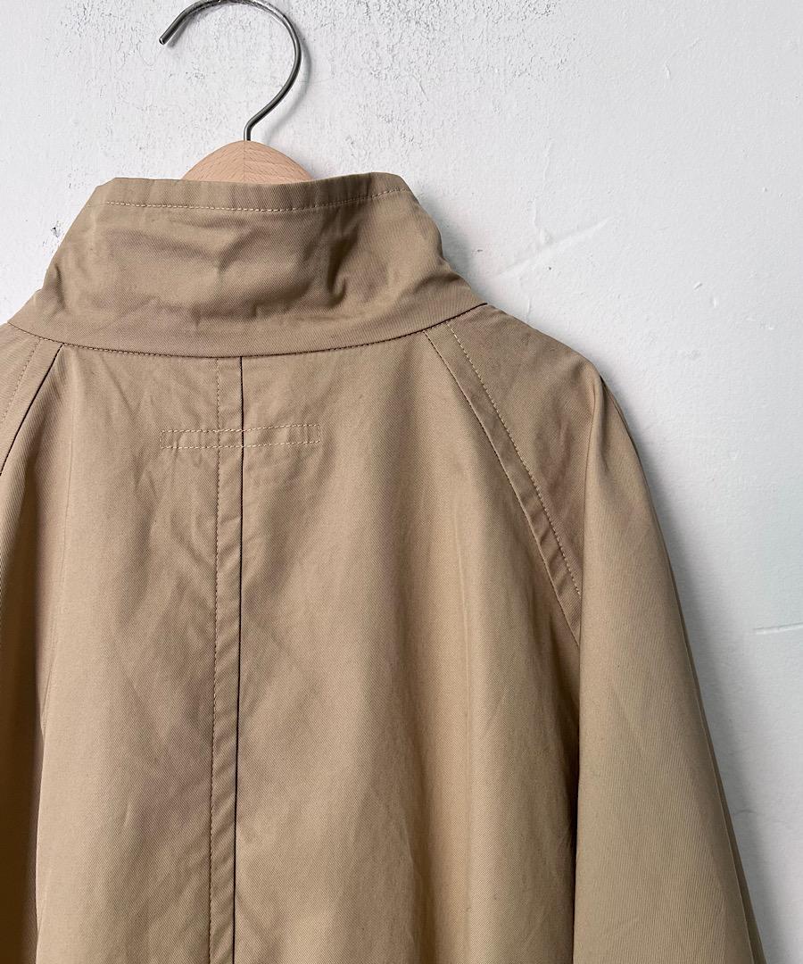 襟元はすっきりとしたスタンドカラーで、ボタンを外すとまた違った雰囲気に。