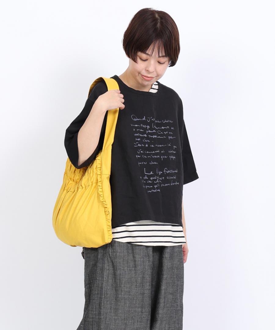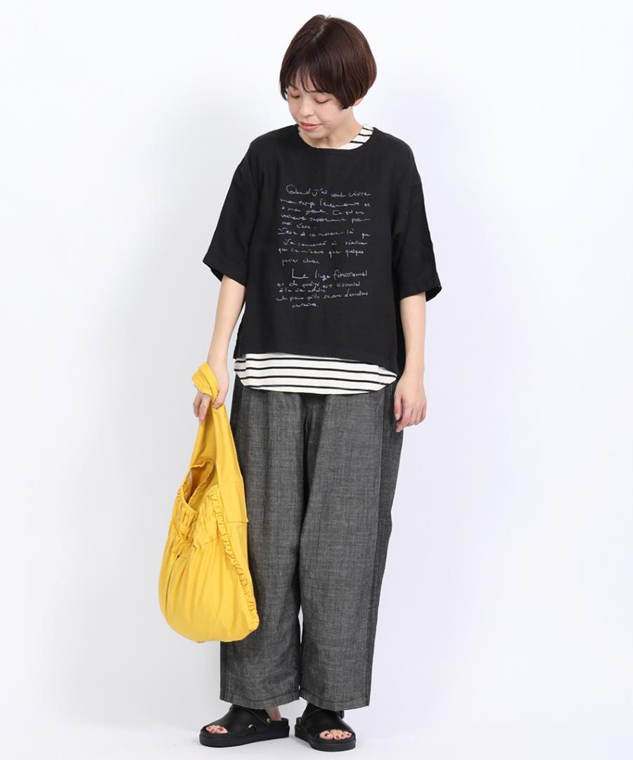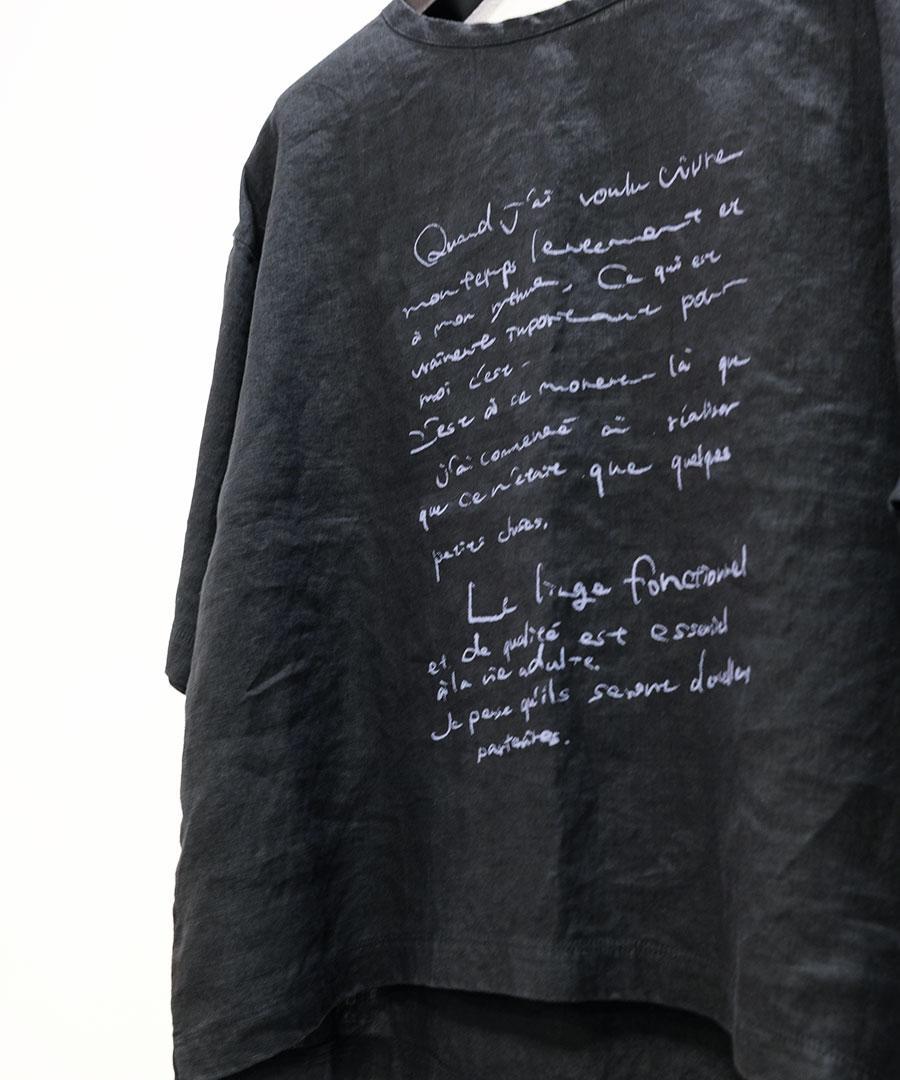 製品染めを施した後に、手書きのプリントを施すことで、ユニークで温かみのある仕上がりになっています。